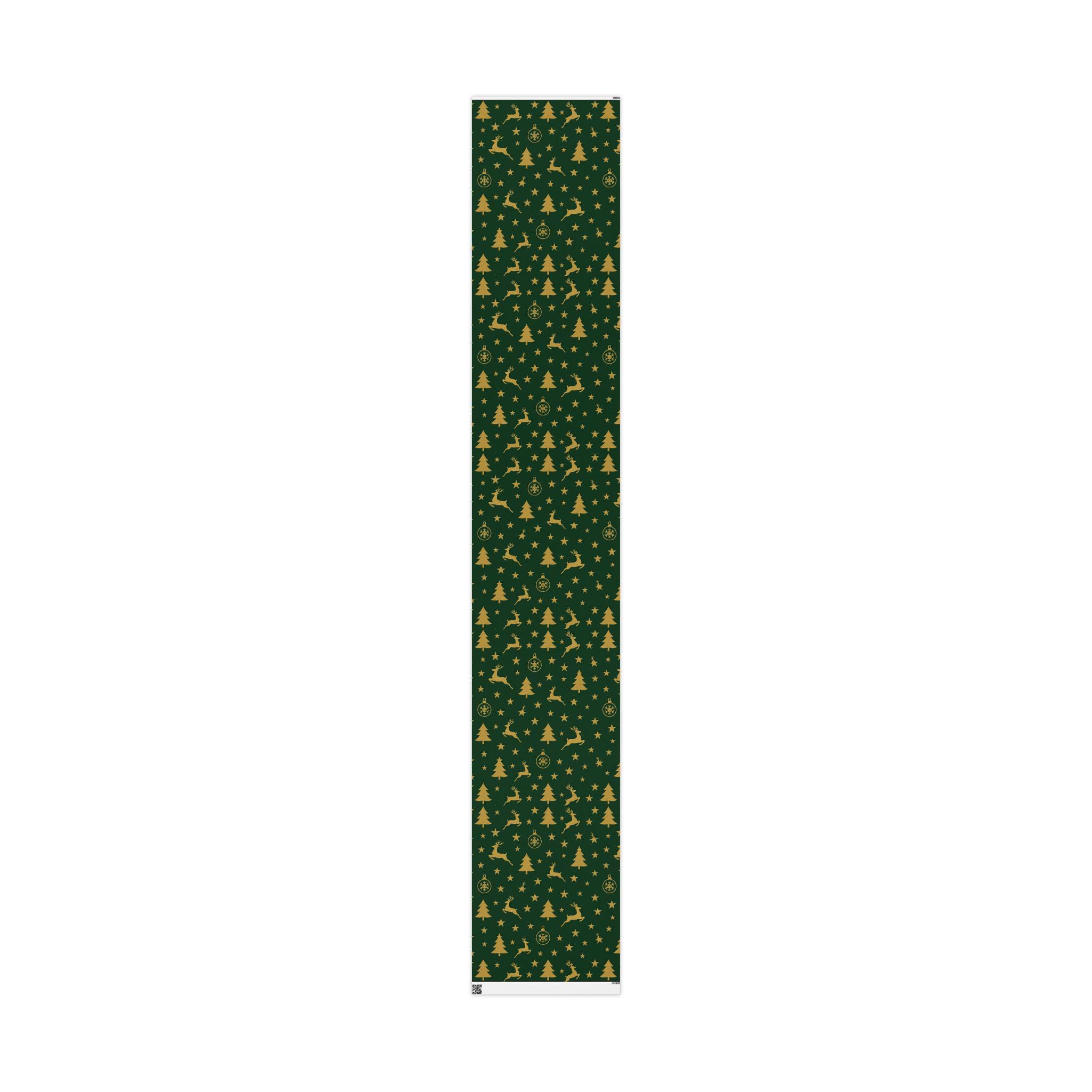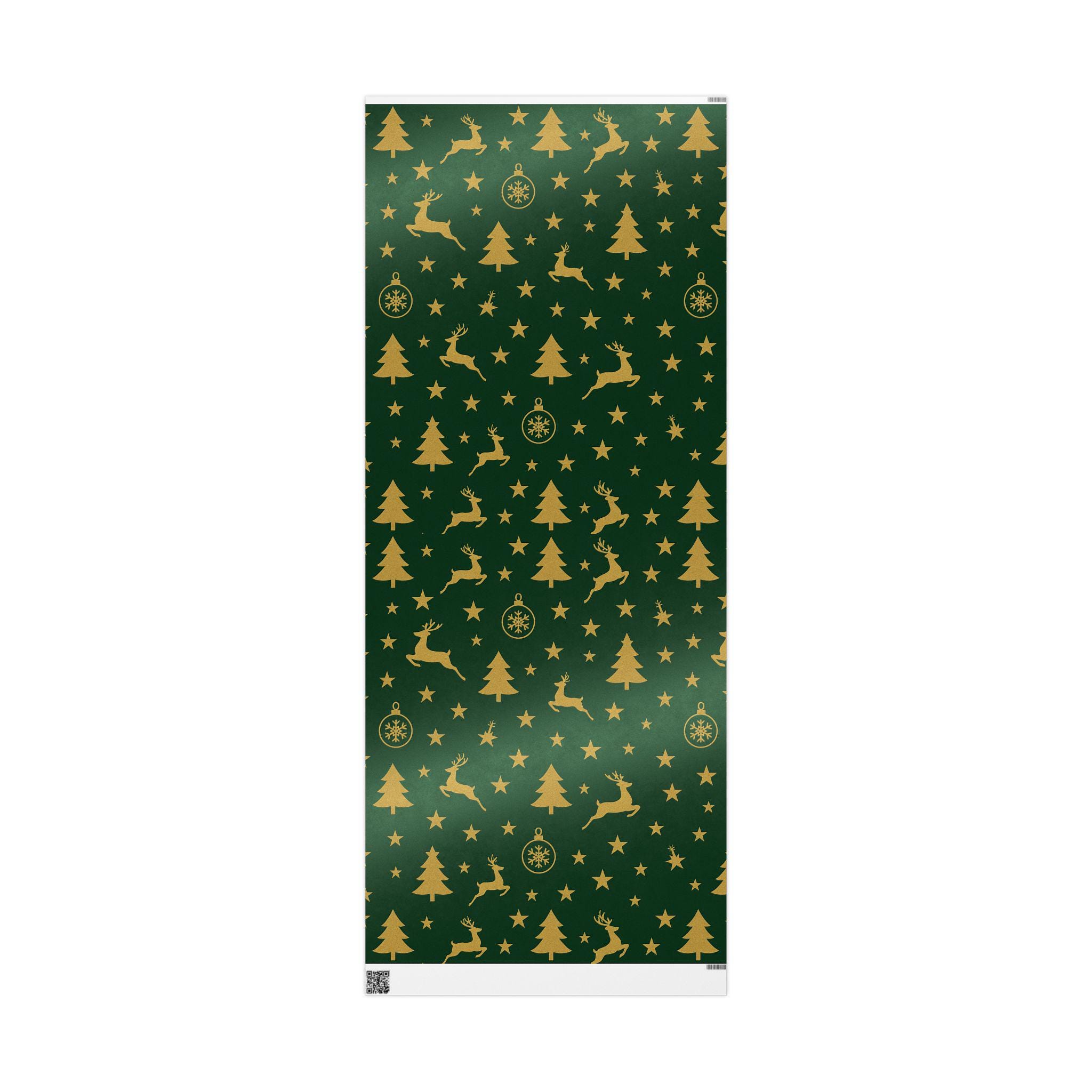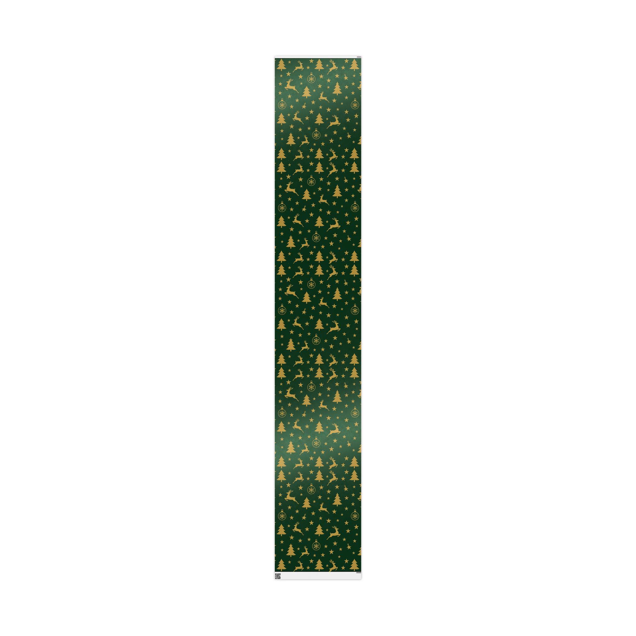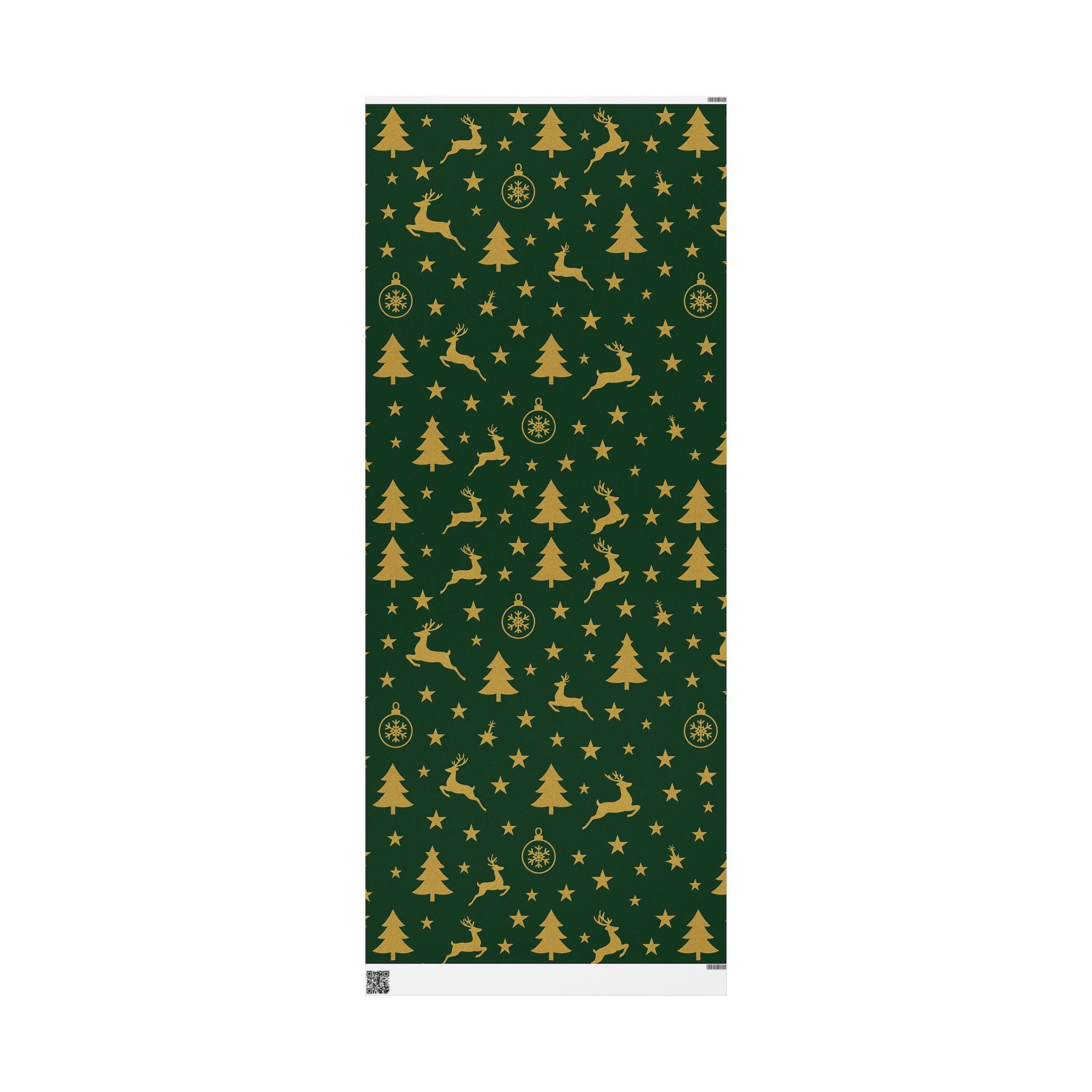 Deep green wrapping paper patterned with warm gold illustrations — tiny trees, stars, and woodland motifs that catch the eye without shouting. The smooth, high-definition print sits on substantial 90 gsm fine art paper that feels weighty as you fold and crease. Choose a glossy sheen for a luminous holiday shimmer or a matte finish for a refined, tactile look. Long panels (available in three lengths) let you wrap tall bottles, long boxes, or multiple smaller gifts with a single continuous sheet. Little white margins with a subtle bar and QR code appear at the ends — an honest manufacturing detail that doesn’t interfere with the main design. Use it when you want a quiet, classic holiday atmosphere that reads handcrafted and thoughtful.