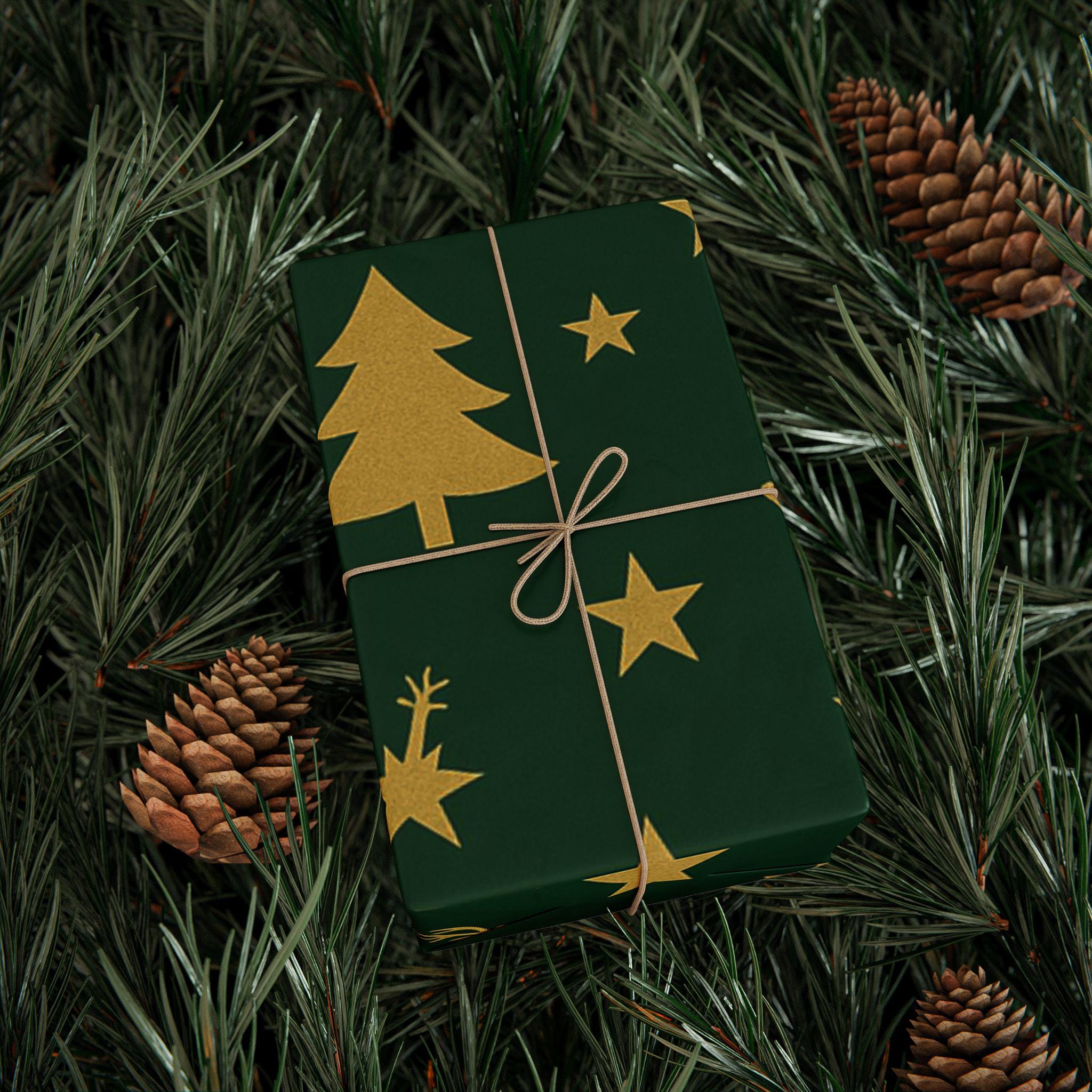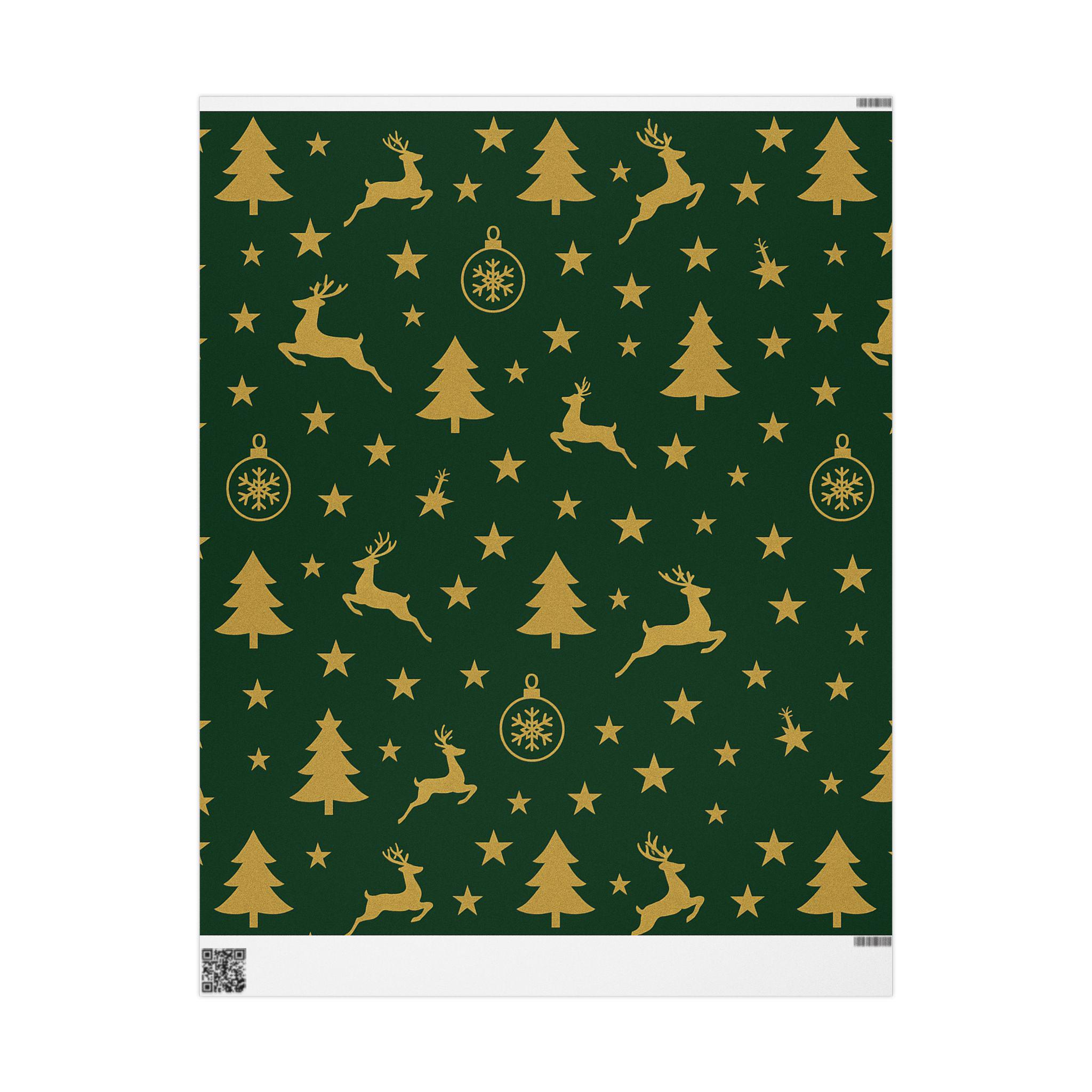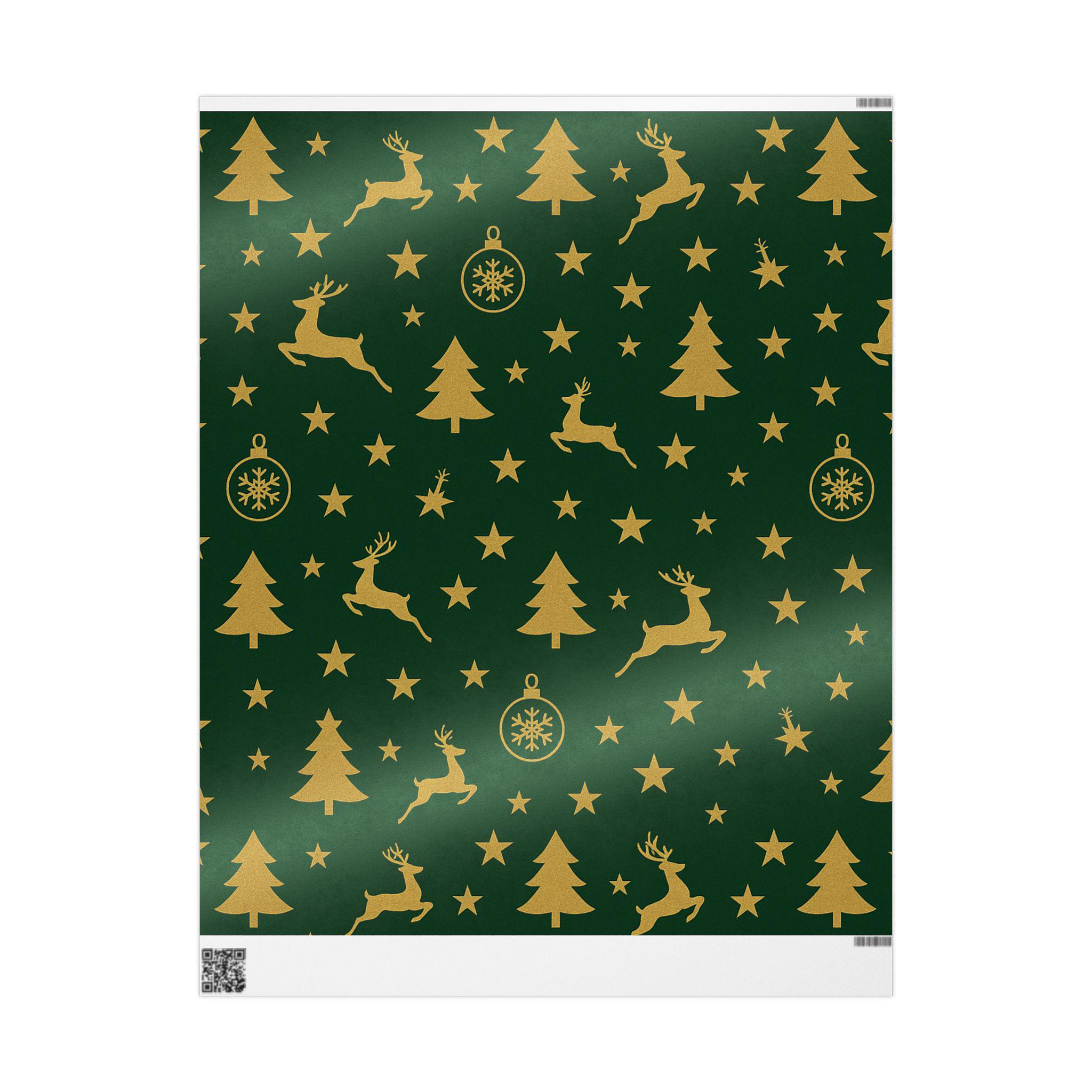 Deep green wrapping paper patterned with warm gold illustrations — tiny trees, stars, and woodland motifs that catch the eye without shouting. The smooth, high-definition print sits on substantial 90 gsm fine art paper that feels weighty as you fold and crease. Choose a glossy sheen for a luminous holiday shimmer or a matte finish for a refined, tactile look. Long panels (available in three lengths) let you wrap tall bottles, long boxes, or multiple smaller gifts with a single continuous sheet. Little white margins with a subtle bar and QR code appear at the ends — an honest manufacturing detail that doesn’t interfere with the main design. Use it when you want a quiet, classic holiday atmosphere that reads handcrafted and thoughtful.