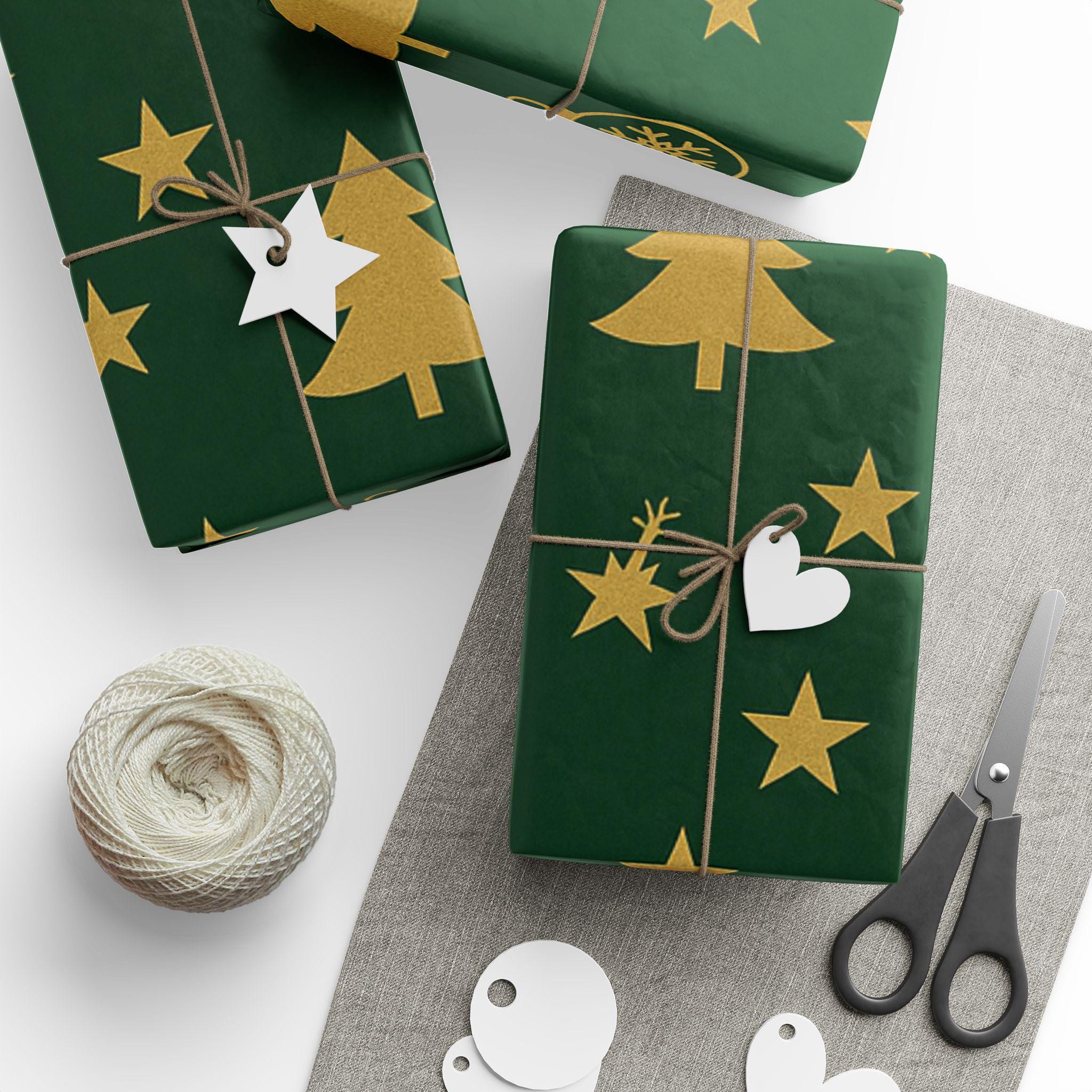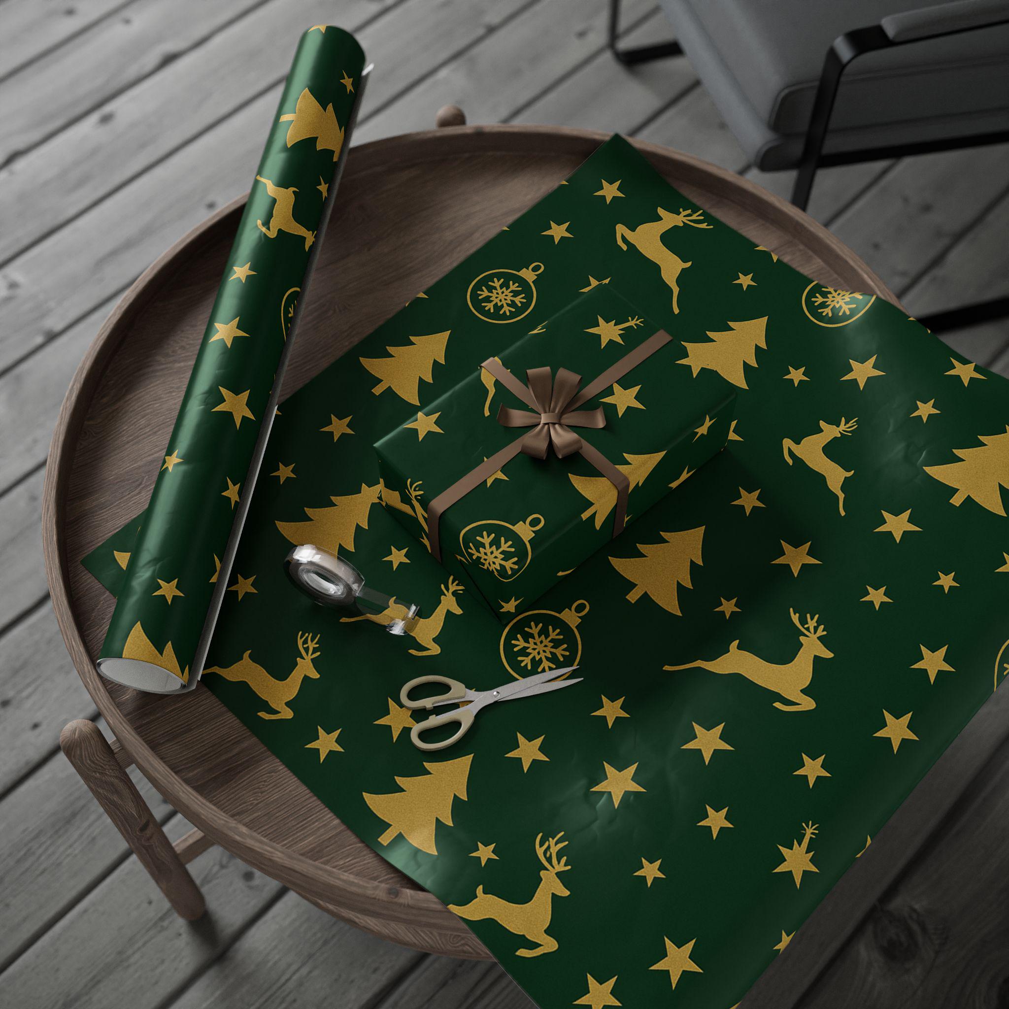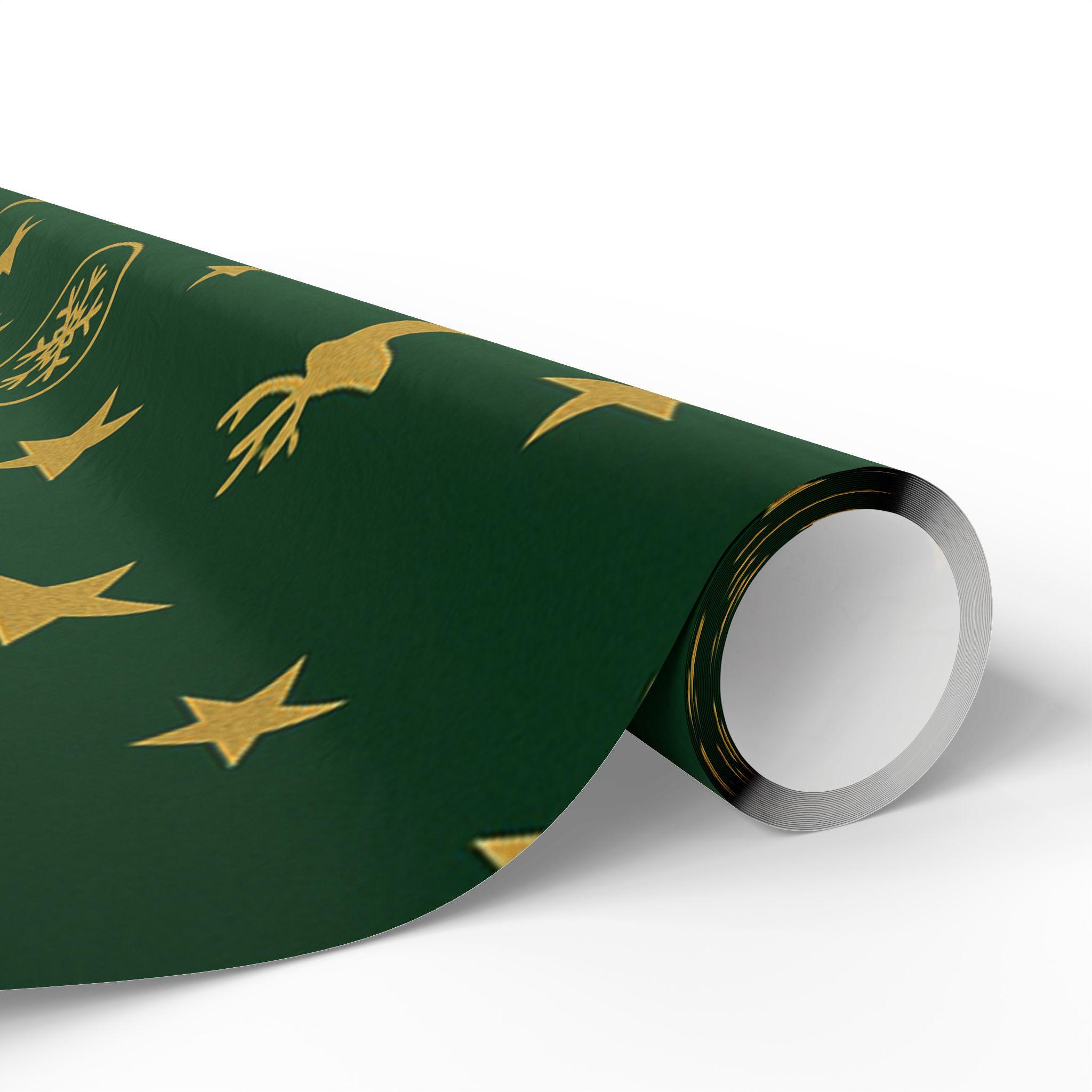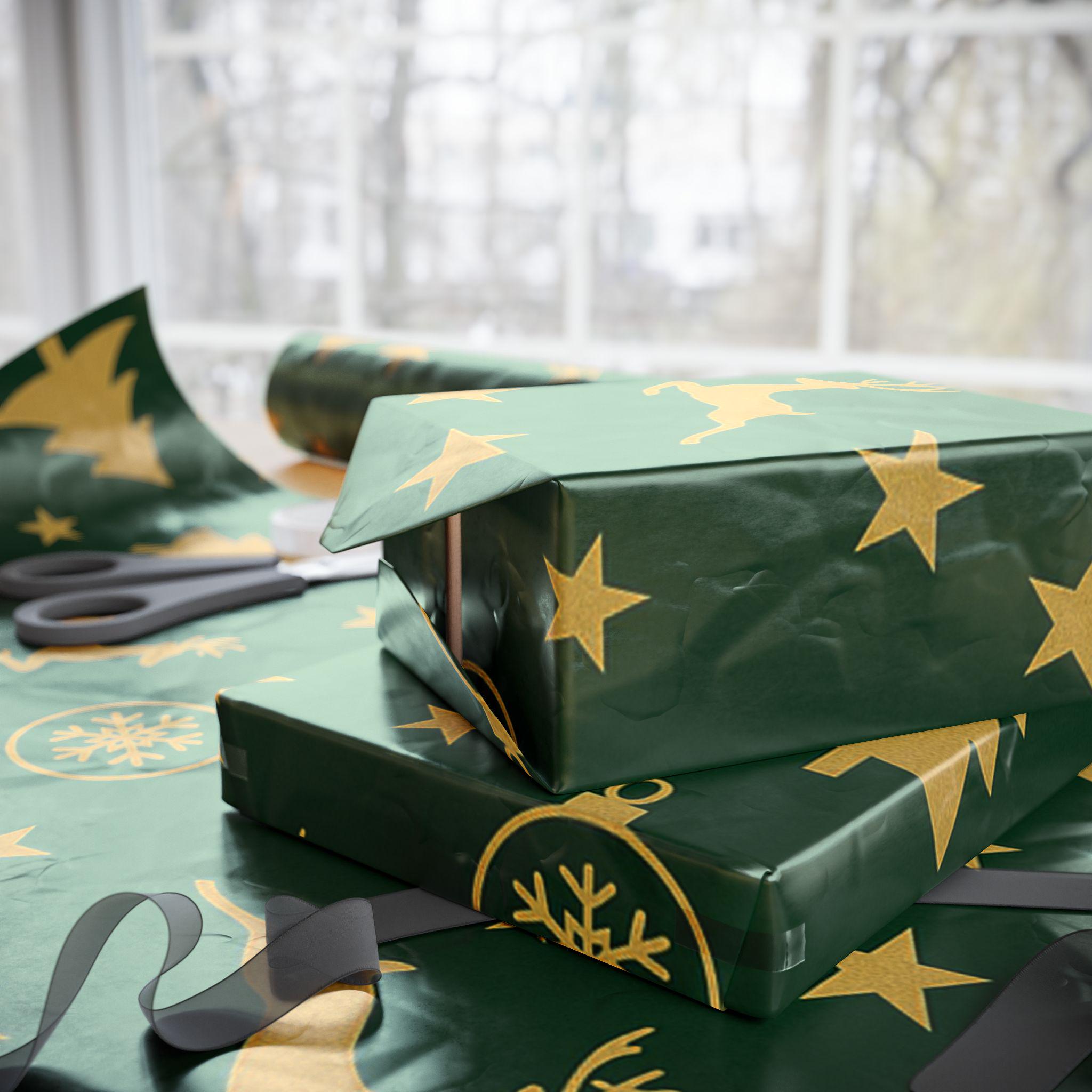 Deep green wrapping paper patterned with warm gold illustrations — tiny trees, stars, and woodland motifs that catch the eye without shouting. The smooth, high-definition print sits on substantial 90 gsm fine art paper that feels weighty as you fold and crease. Choose a glossy sheen for a luminous holiday shimmer or a matte finish for a refined, tactile look. Long panels (available in three lengths) let you wrap tall bottles, long boxes, or multiple smaller gifts with a single continuous sheet. Little white margins with a subtle bar and QR code appear at the ends — an honest manufacturing detail that doesn’t interfere with the main design. Use it when you want a quiet, classic holiday atmosphere that reads handcrafted and thoughtful.