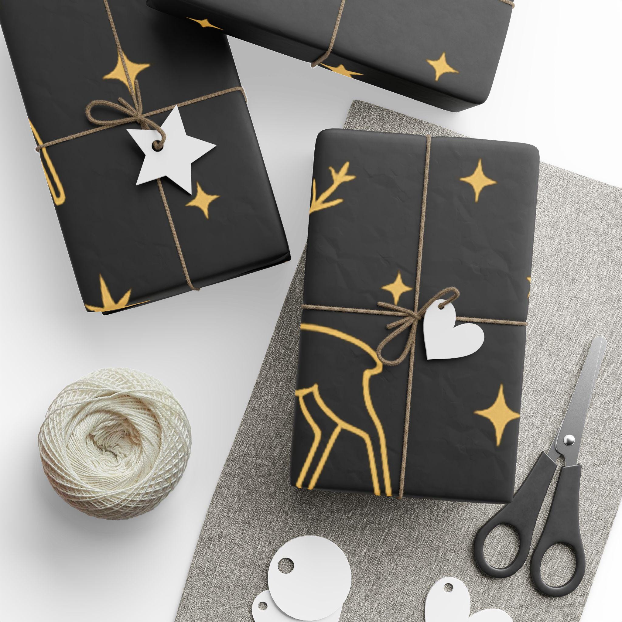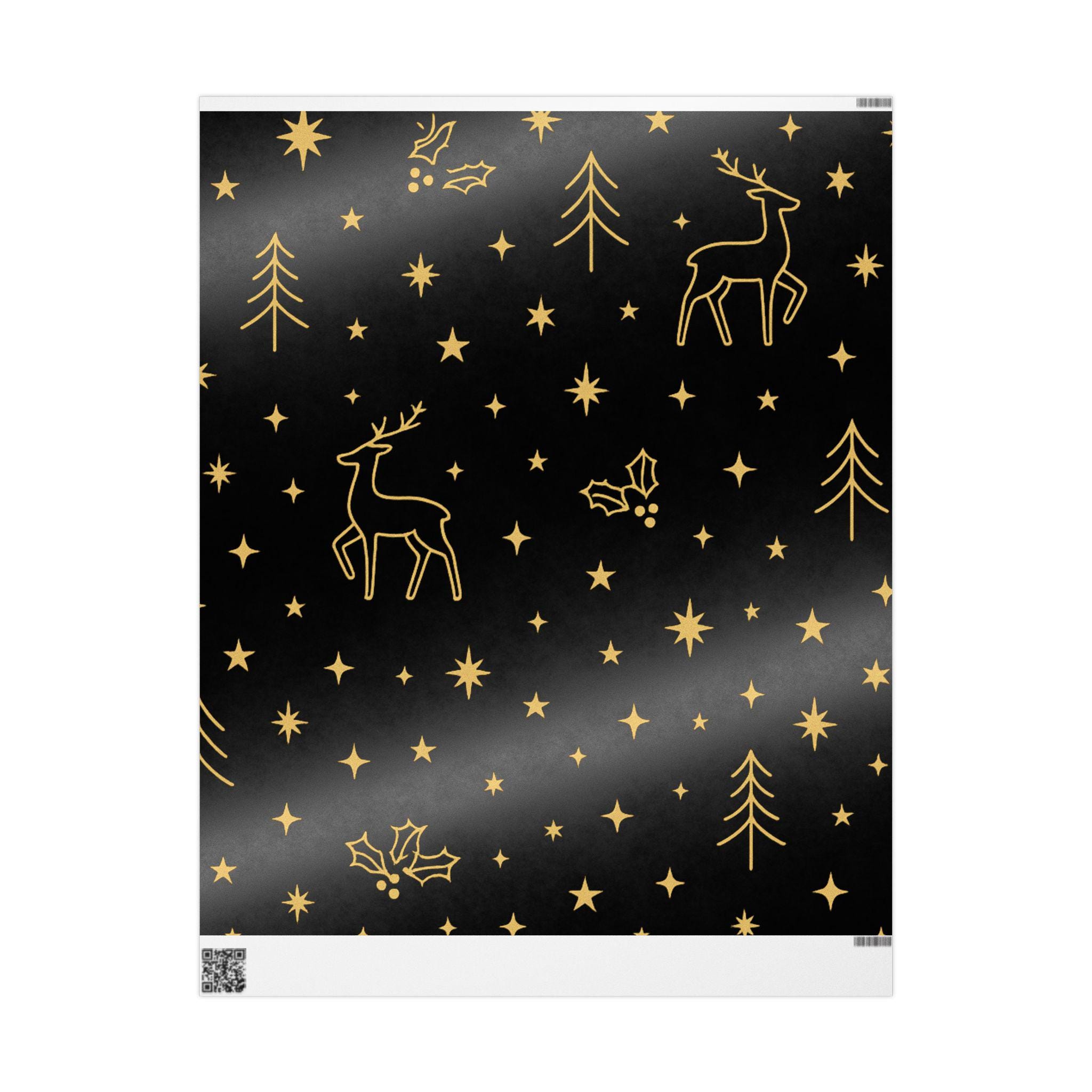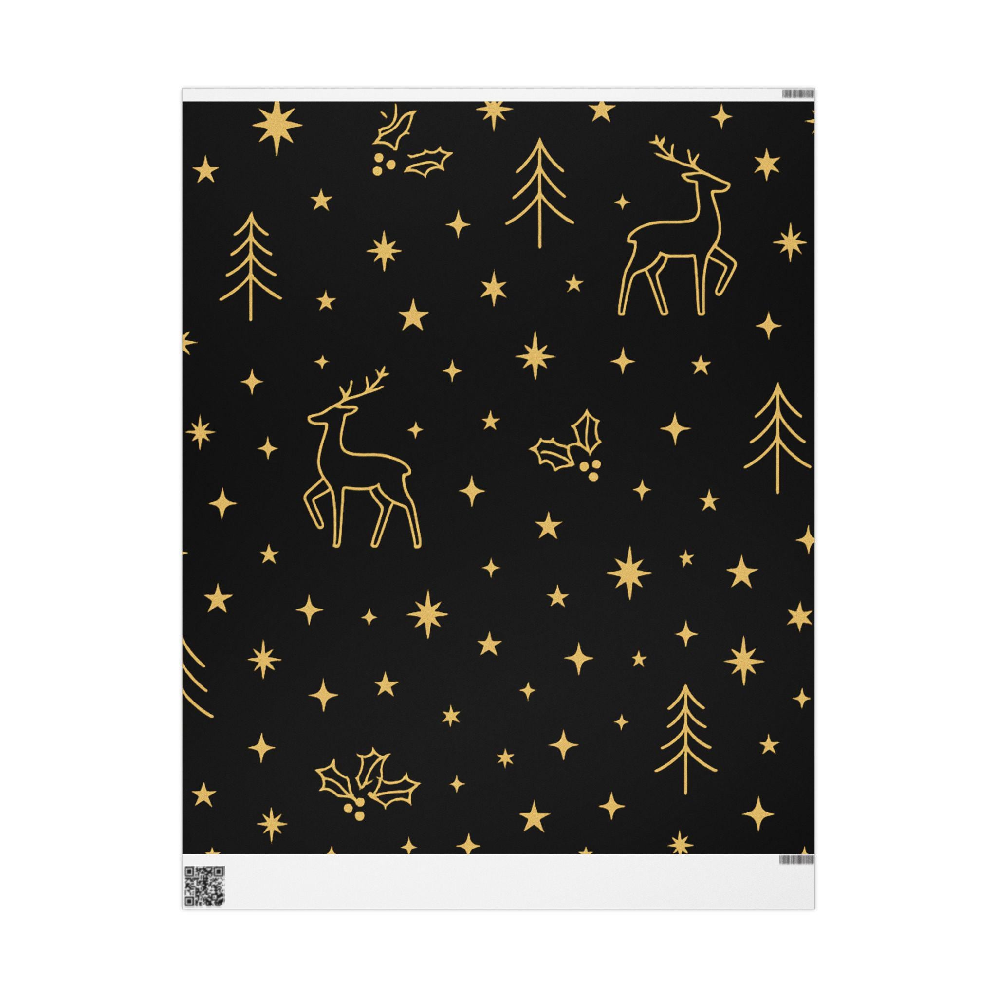 Midnight shimmer on matte or glossy paper — this wrapping paper turns a simple present into a quiet, elegant moment. Deep black fills the sheet while fine gold line drawings of deer, evergreen silhouettes, holly sprigs, and twinkling stars scatter across the surface like a winter night sky. The pattern reads refined from a distance and reveals delicate, hand-drawn detail up close. Use it to dress holiday gifts, anniversary surprises, or small tokens meant to feel thoughtful and grown-up. The substantial 90 gsm fine art stock holds neat folds and crisp edges, so bows sit tight and corners stay sharp.