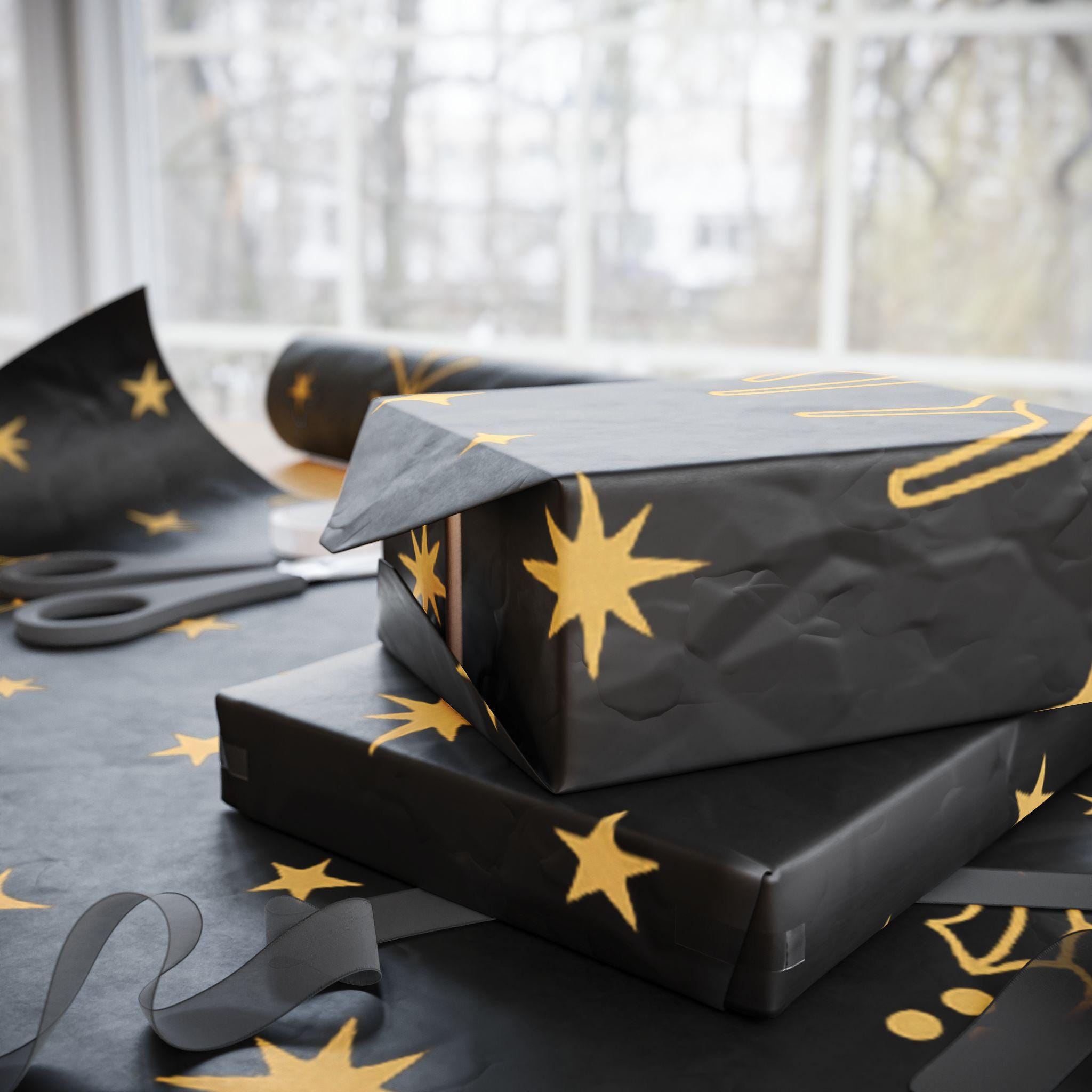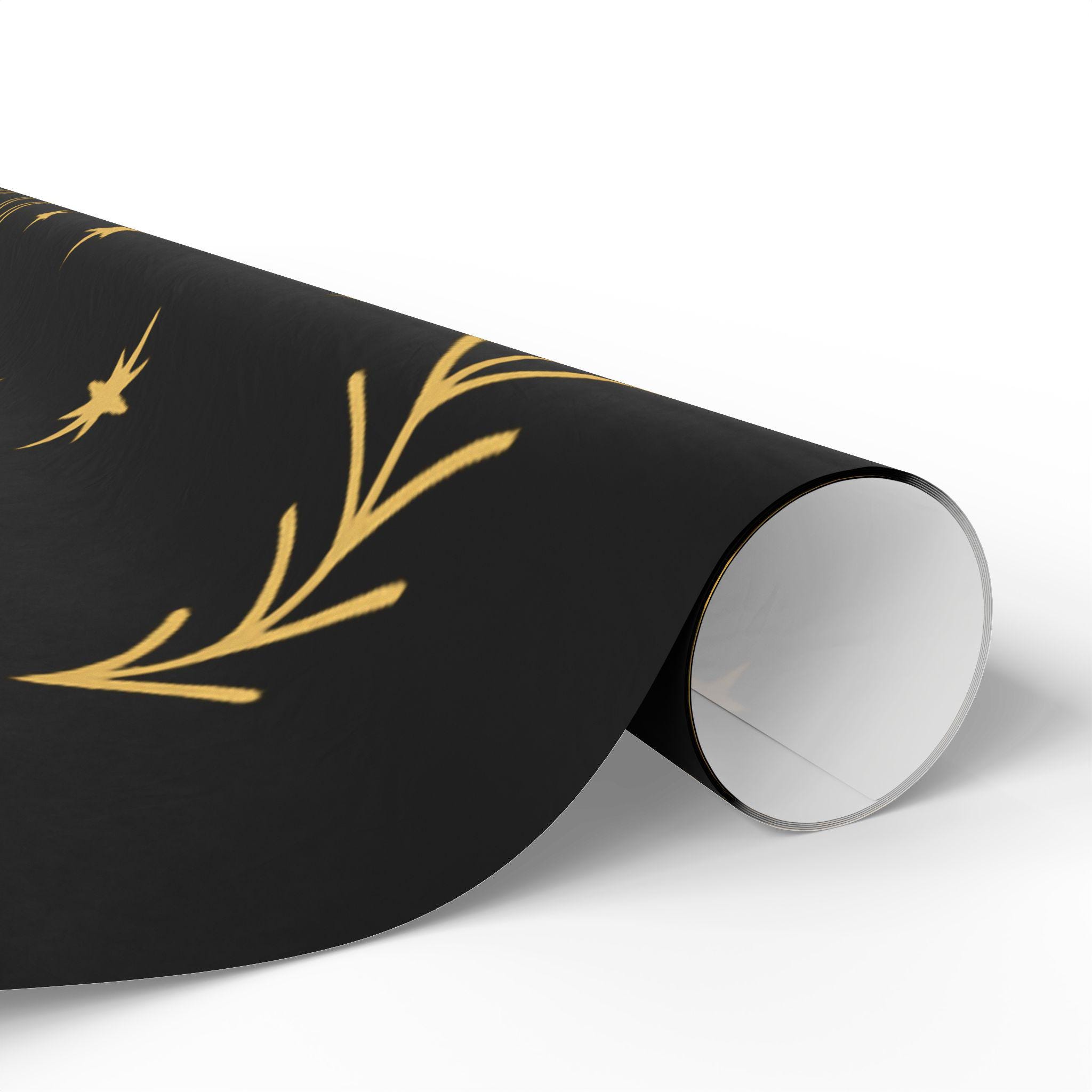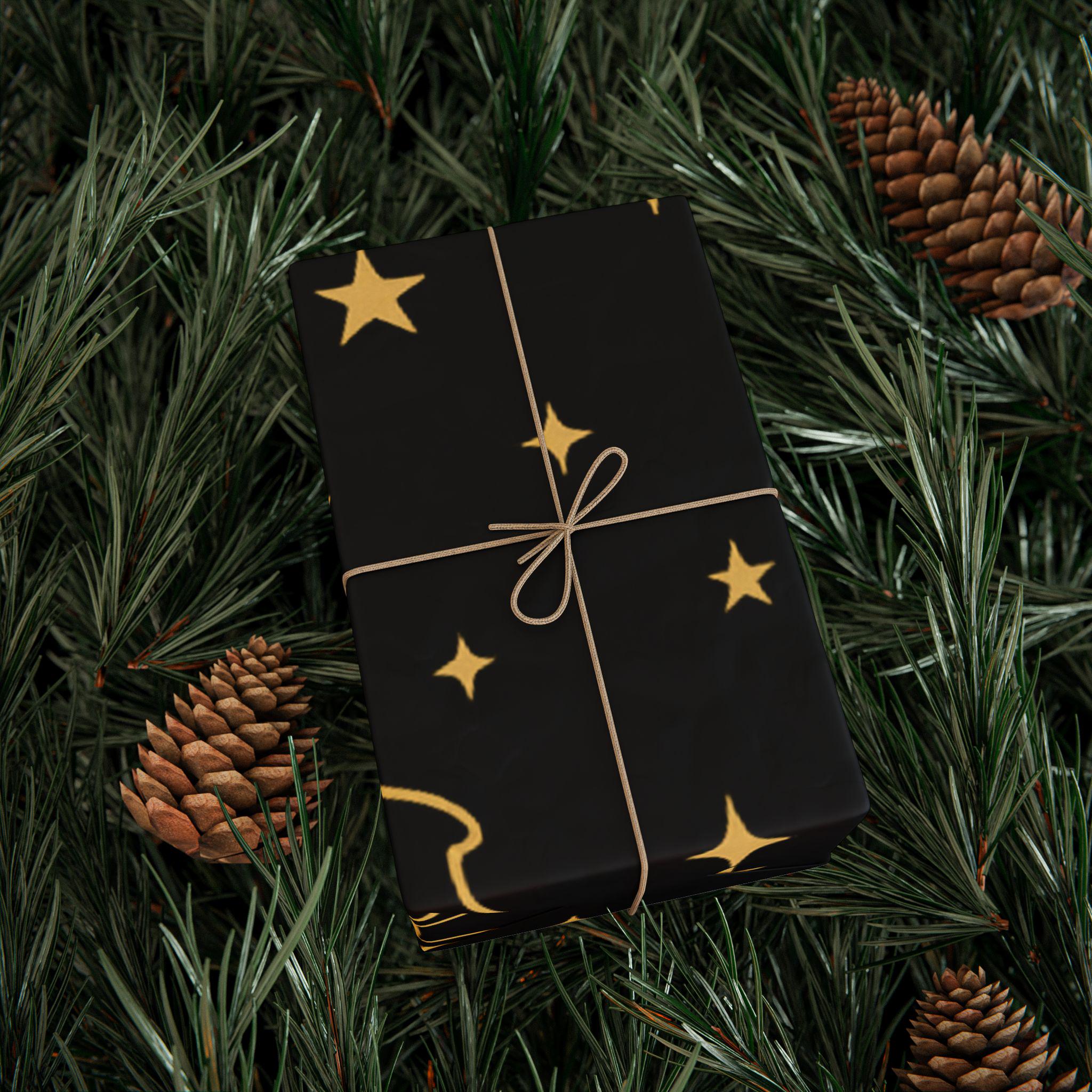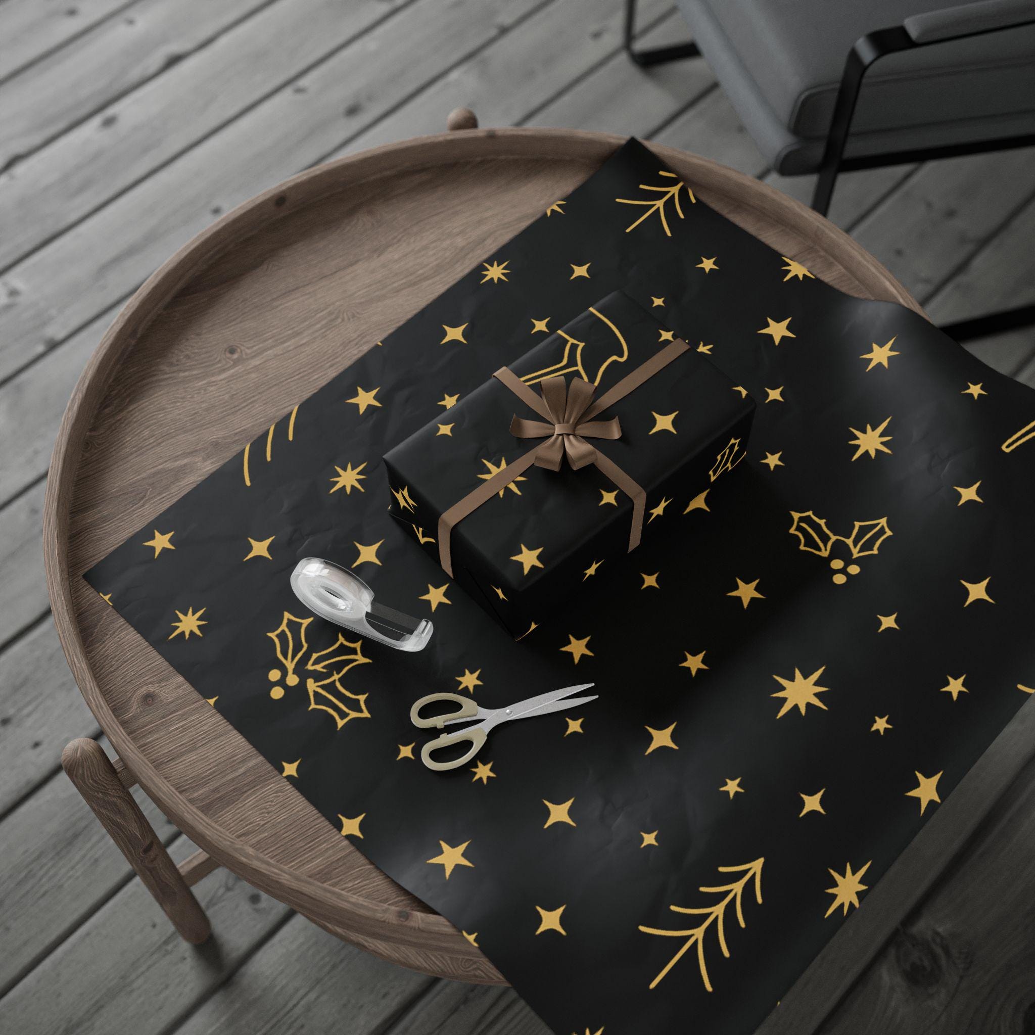 Midnight shimmer on matte or glossy paper — this wrapping paper turns a simple present into a quiet, elegant moment. Deep black fills the sheet while fine gold line drawings of deer, evergreen silhouettes, holly sprigs, and twinkling stars scatter across the surface like a winter night sky. The pattern reads refined from a distance and reveals delicate, hand-drawn detail up close. Use it to dress holiday gifts, anniversary surprises, or small tokens meant to feel thoughtful and grown-up. The substantial 90 gsm fine art stock holds neat folds and crisp edges, so bows sit tight and corners stay sharp.