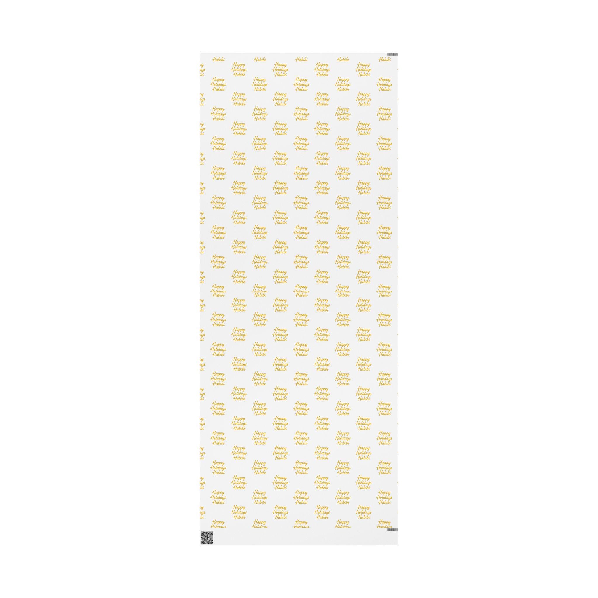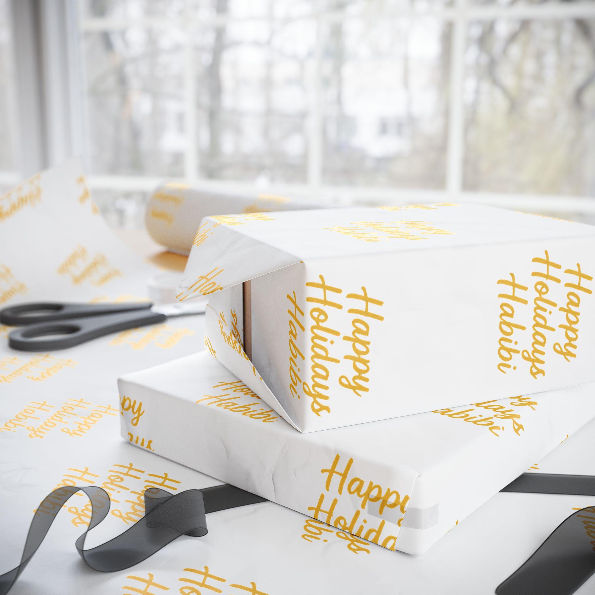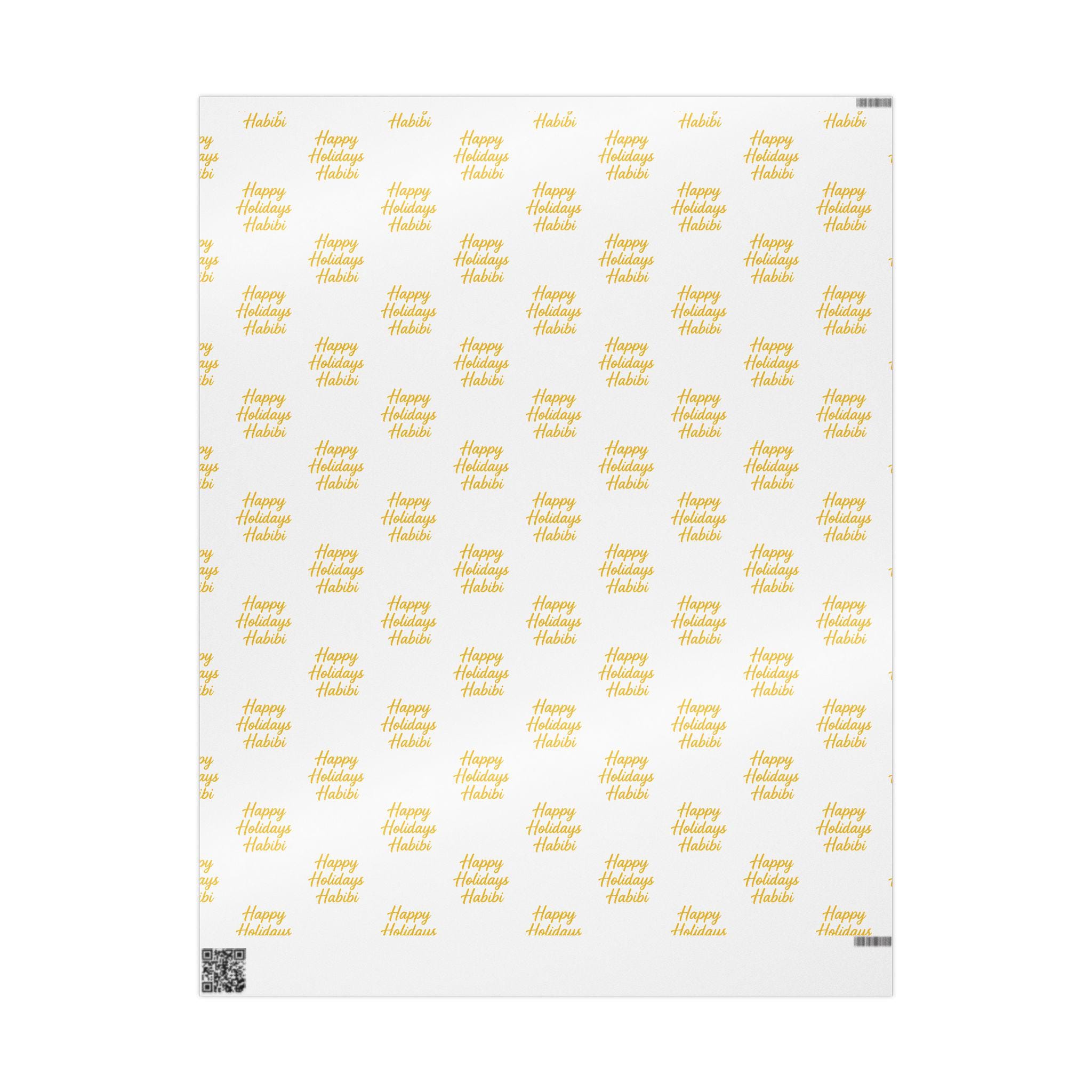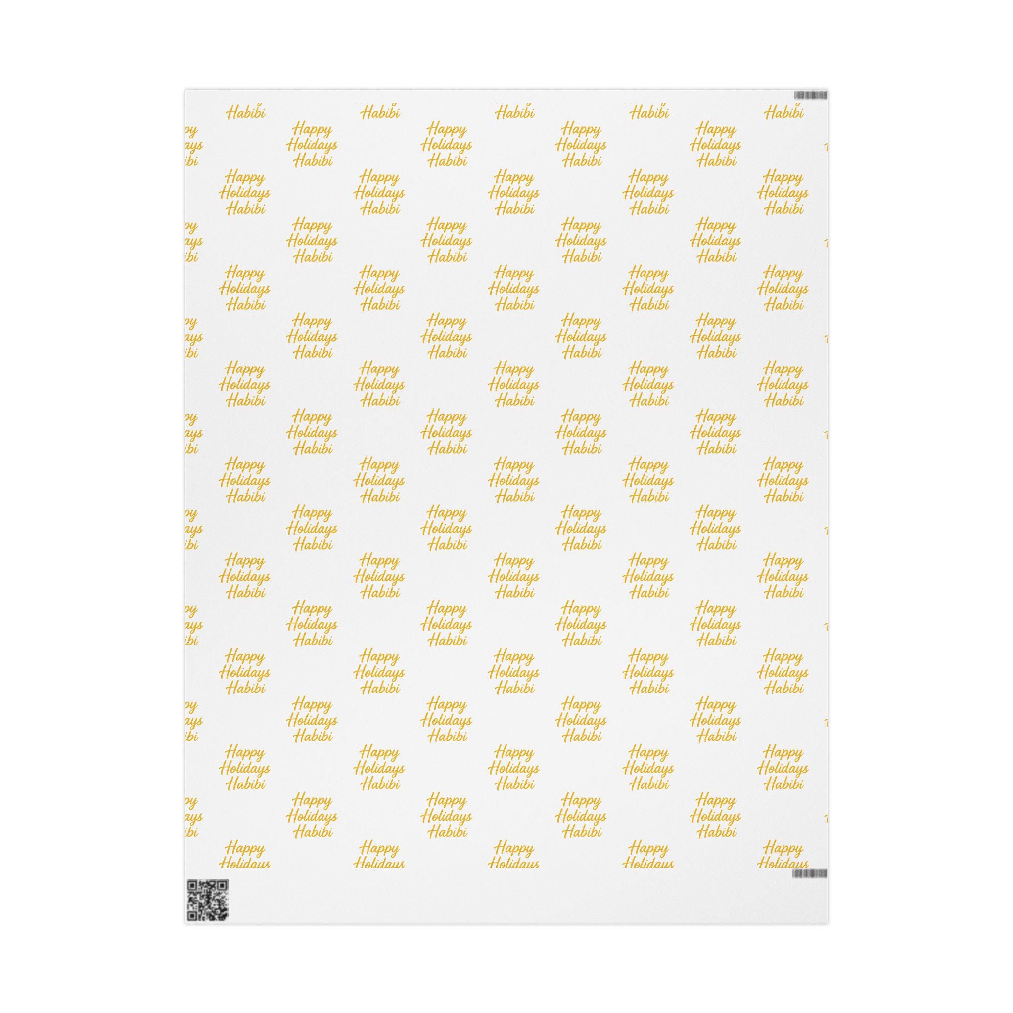 Soft, joyful gold script repeats “Happy Holidays Habibi” across a bright white field, turning every gift into a warm, personal celebration. The clean, handwritten lettering feels intimate and familiar — like a note slipped into a gift — while the white background keeps the look modern and versatile. Use the glossy finish when you want the gold to pop and catch light, or choose matte for a softer, paper-like feel that reads more like stationery. Comes in three generous widths to wrap small boxes or long bouquets, and prints on a sturdy 90 gsm fine art stock so folds stay crisp and colors stay true. Small white trim with a barcode and QR code appears at the roll edges from production.