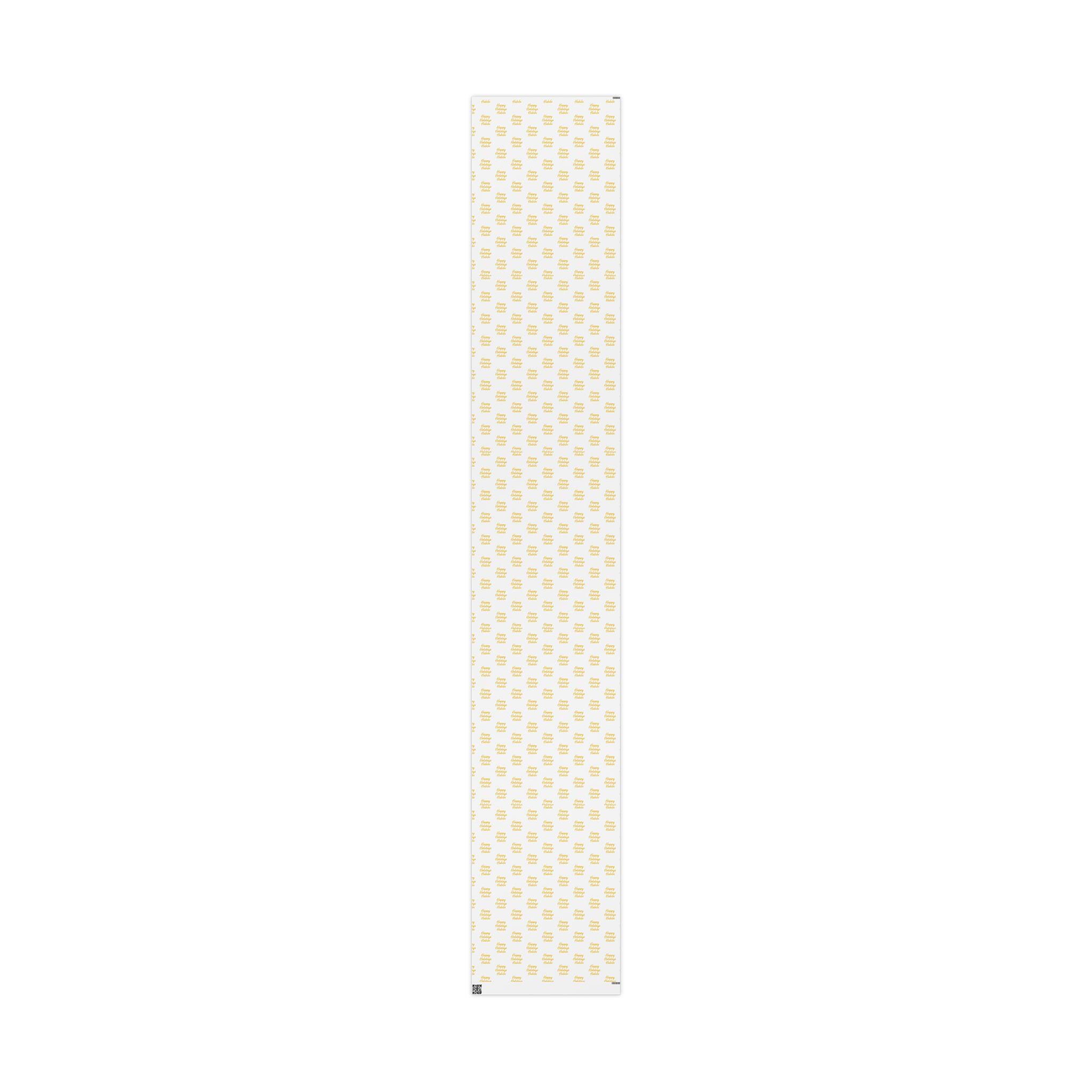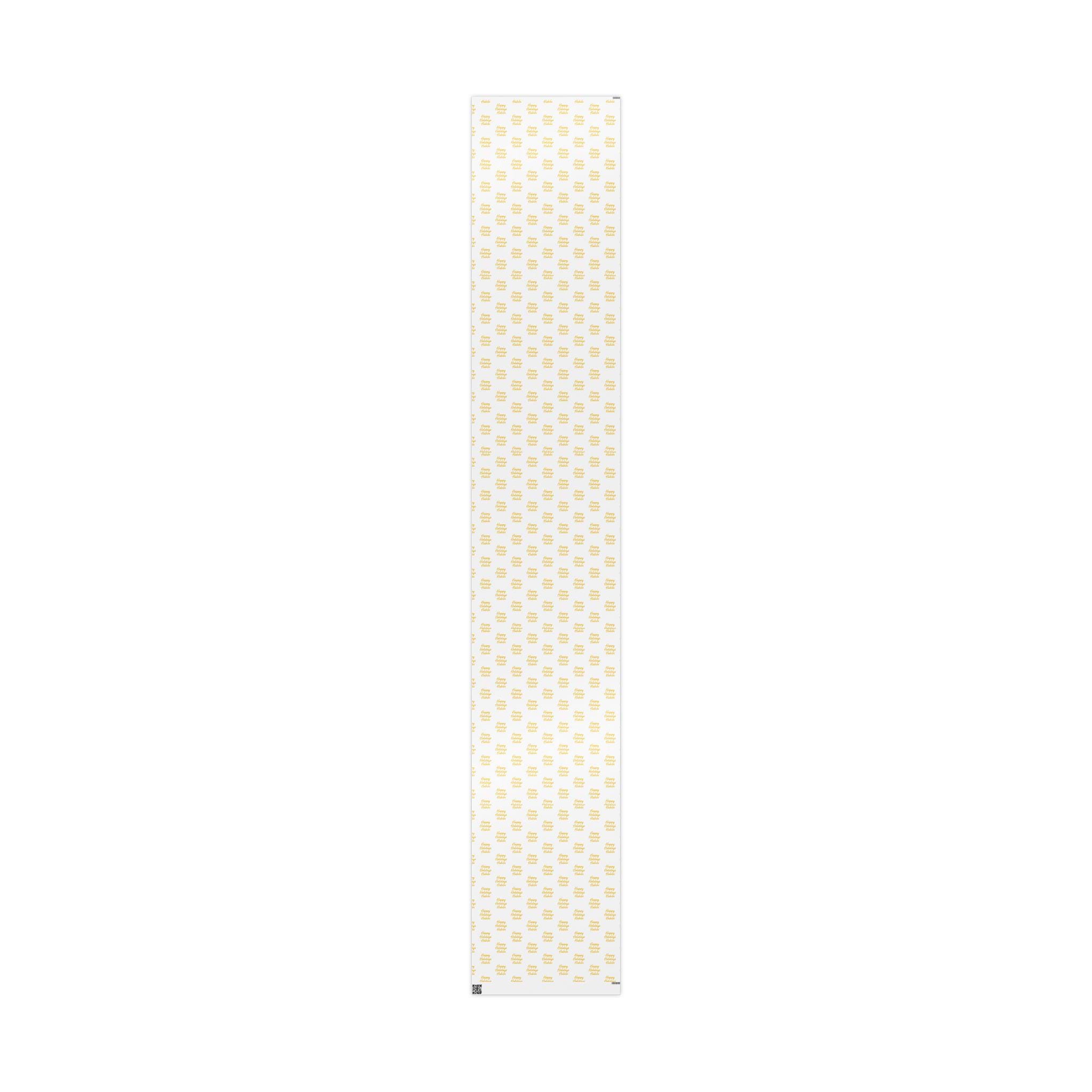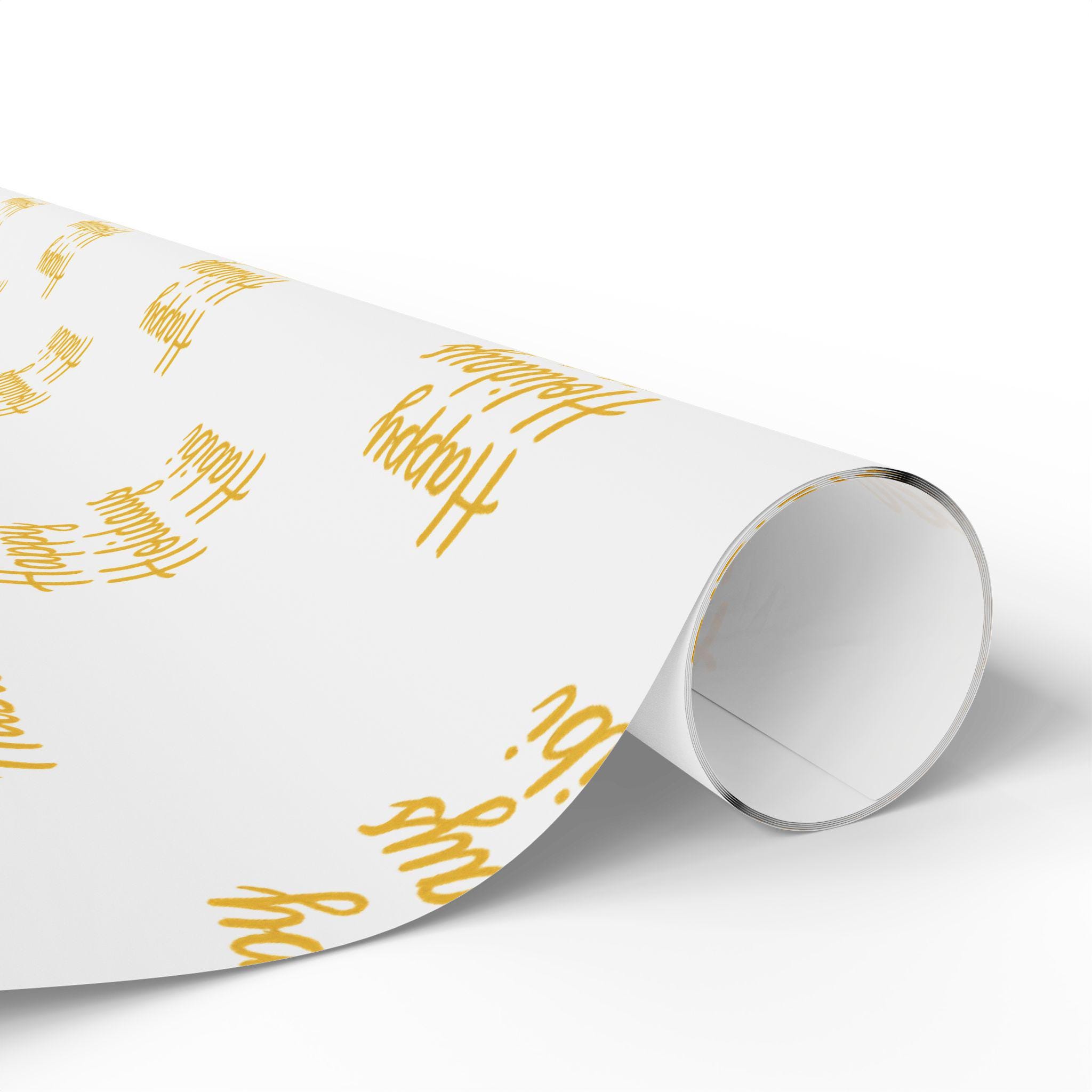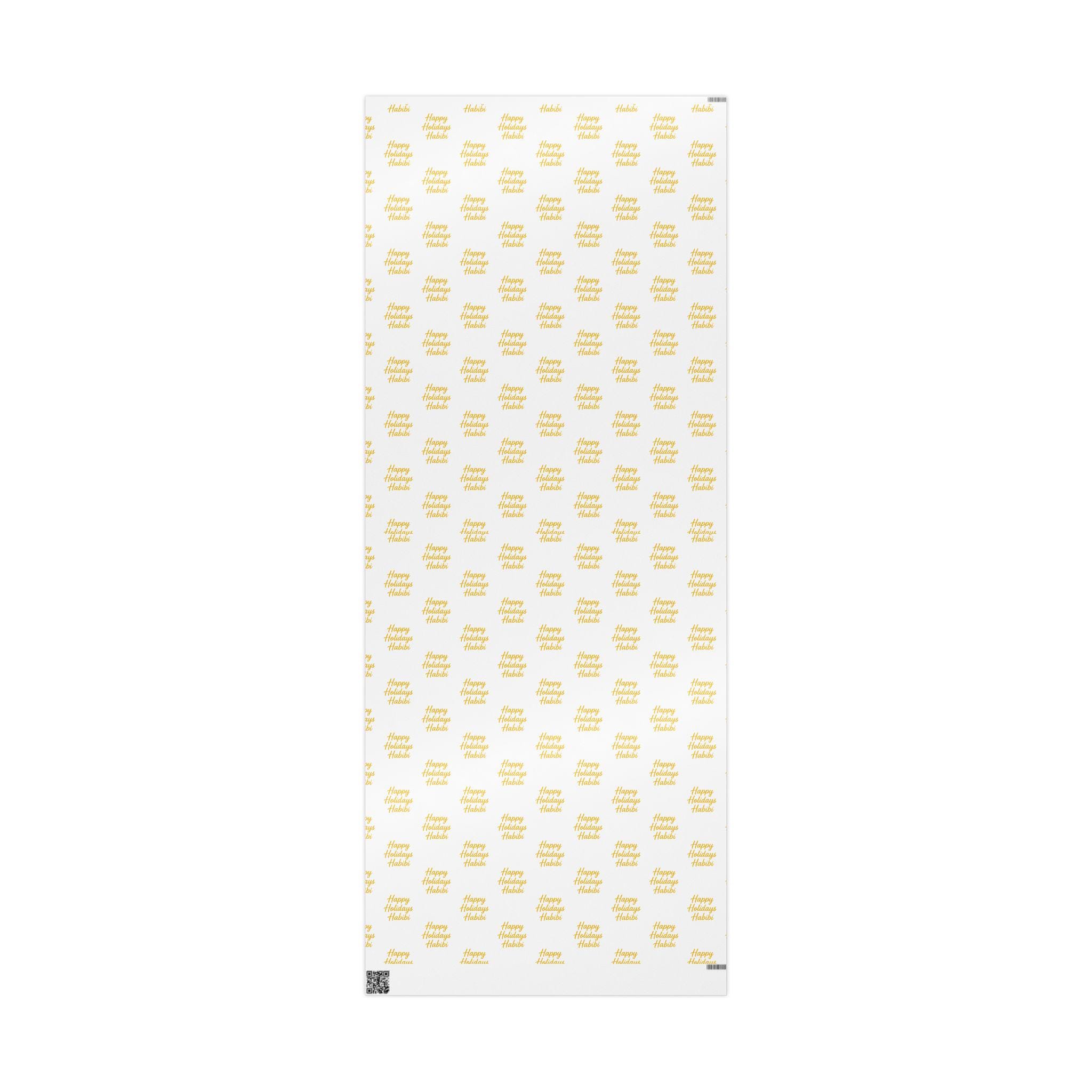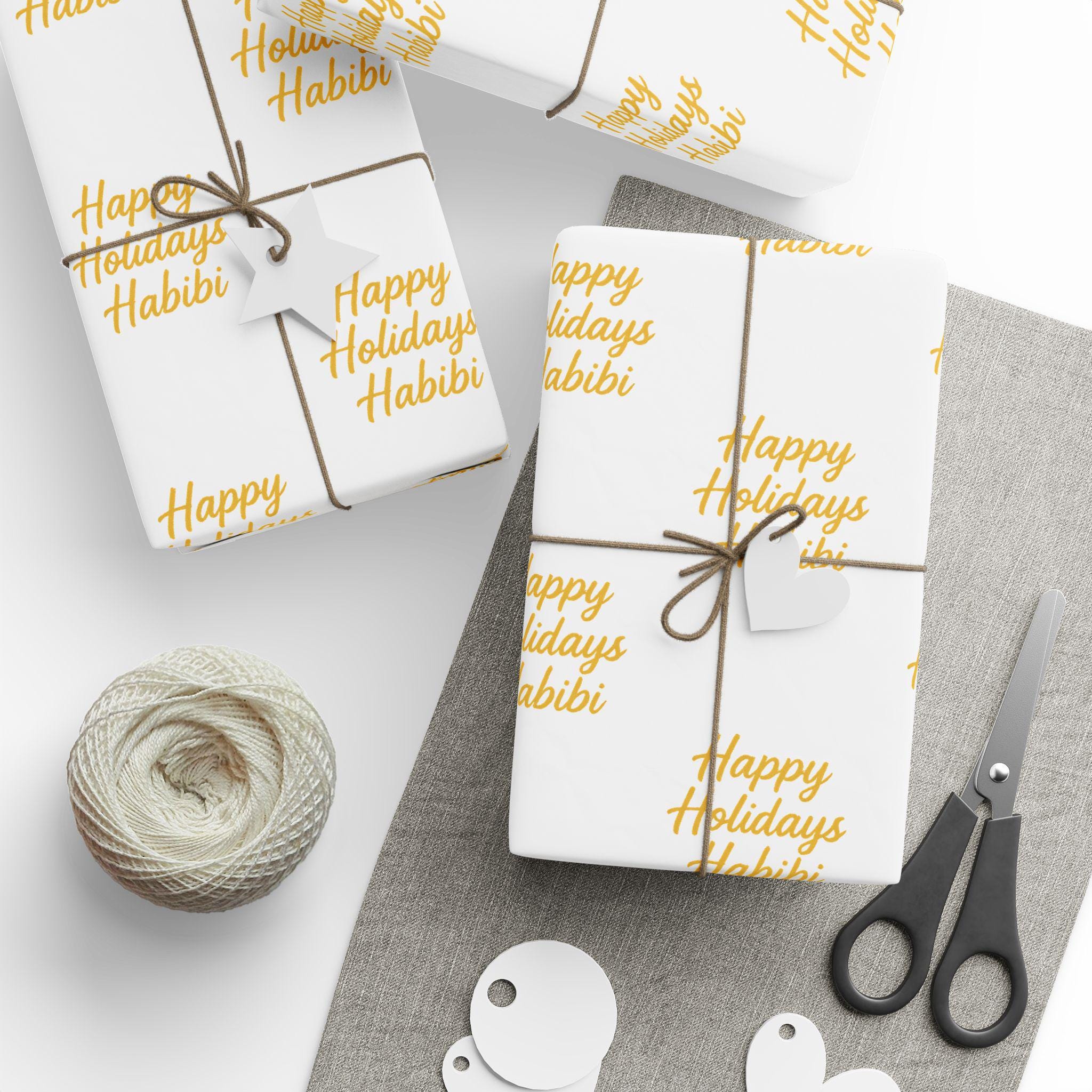 Soft, joyful gold script repeats “Happy Holidays Habibi” across a bright white field, turning every gift into a warm, personal celebration. The clean, handwritten lettering feels intimate and familiar — like a note slipped into a gift — while the white background keeps the look modern and versatile. Use the glossy finish when you want the gold to pop and catch light, or choose matte for a softer, paper-like feel that reads more like stationery. Comes in three generous widths to wrap small boxes or long bouquets, and prints on a sturdy 90 gsm fine art stock so folds stay crisp and colors stay true. Small white trim with a barcode and QR code appears at the roll edges from production.