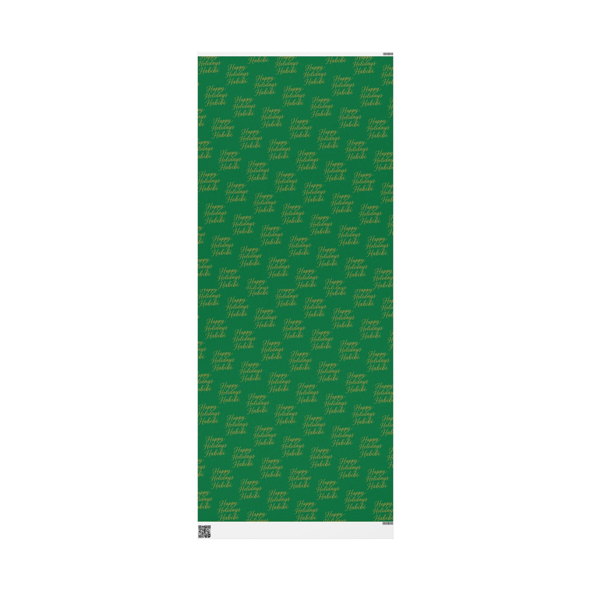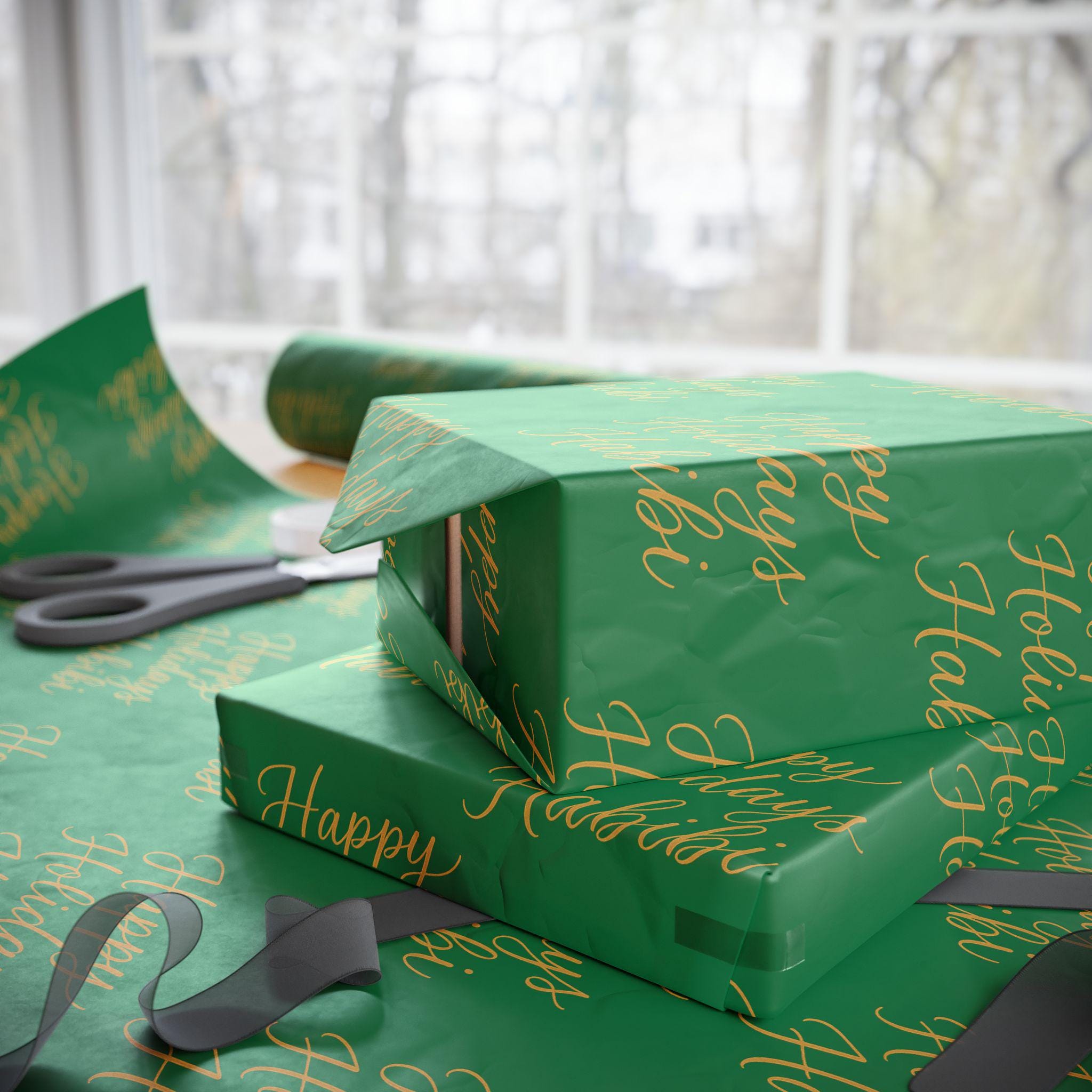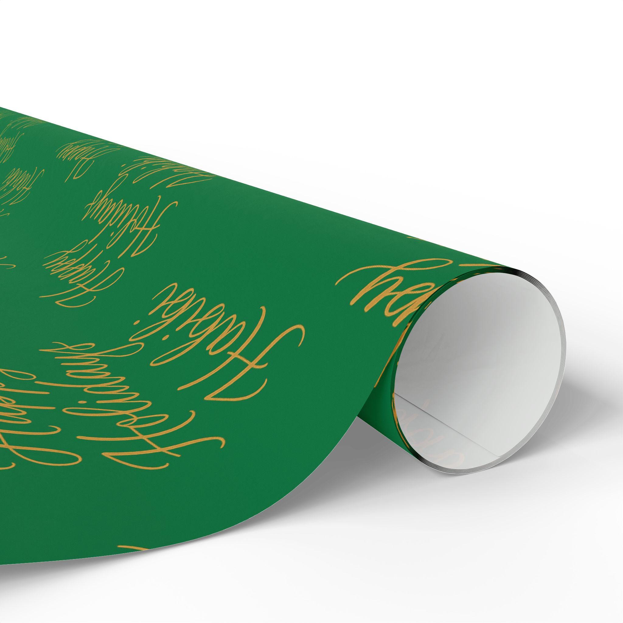 Emerald green wrapping paper printed with flowing gold script that reads “Happy Holidays.” The deep green backdrop and warm metallic lettering create a cozy, traditional holiday vibe—like a mantel lit with candles and a hot cup of tea on a frosty evening. Lightweight but substantial, the paper wraps smoothly around boxes and tubes, and the high-definition print keeps the script crisp and elegant. Choose glossy for a reflective, festive sheen or matte for a velvety, refined finish. Sized to fit small to extra-large gifts and printed one-sided with a neat production barcode and white trim at the roll edges.