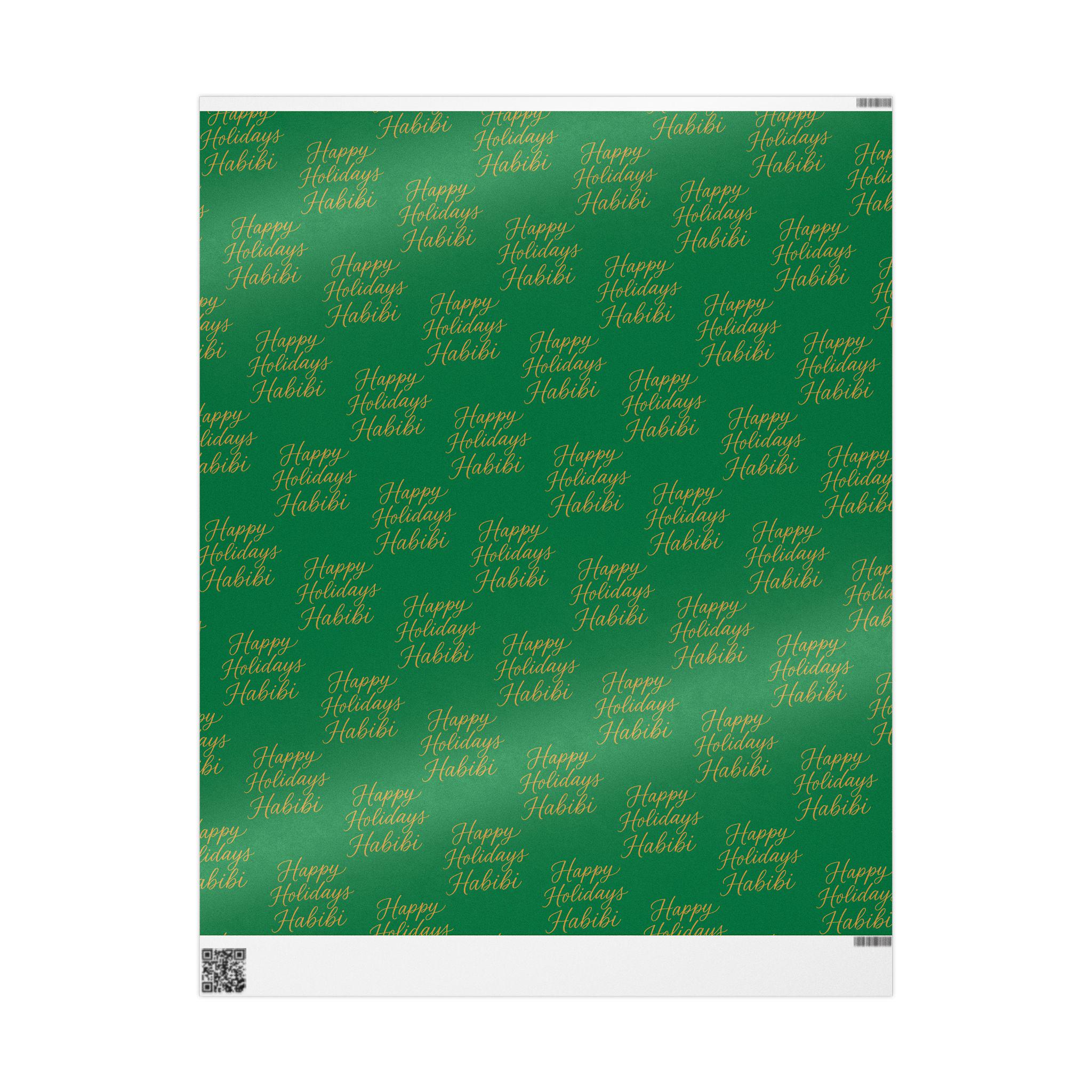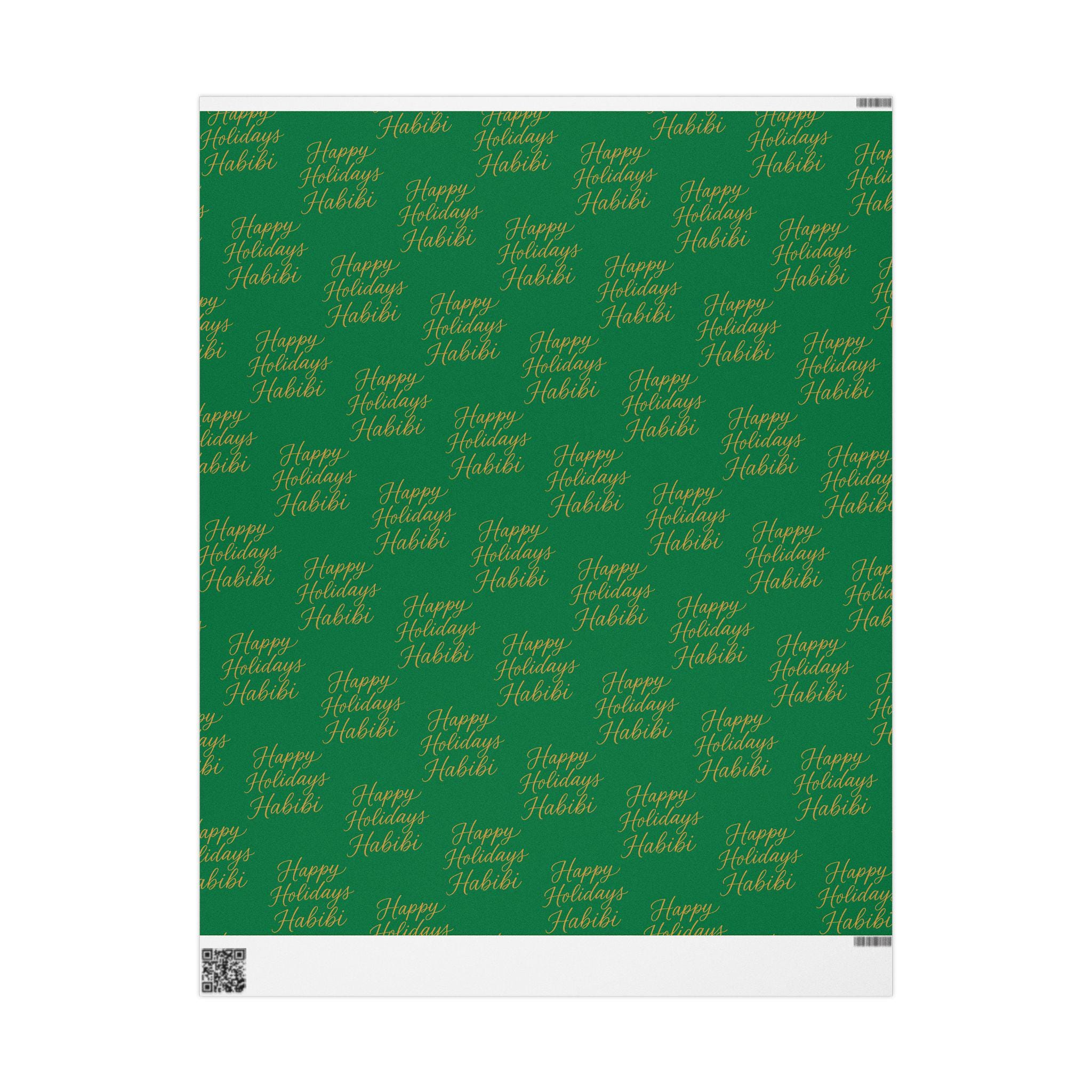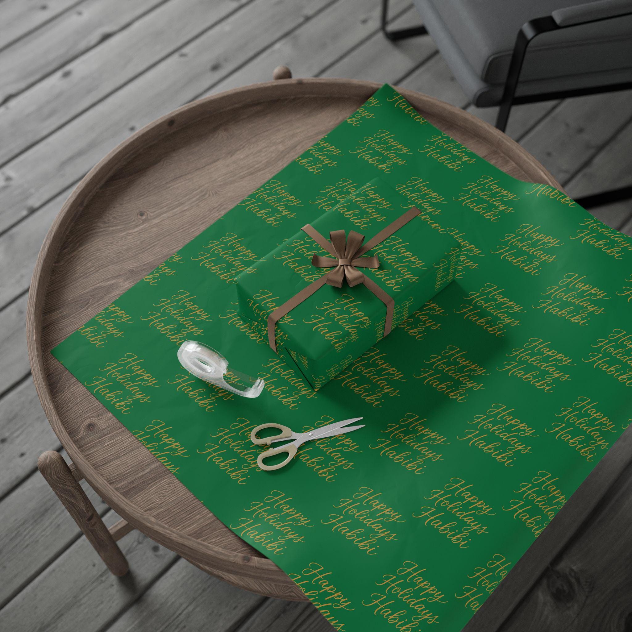 Emerald green wrapping paper printed with flowing gold script that reads “Happy Holidays.” The deep green backdrop and warm metallic lettering create a cozy, traditional holiday vibe—like a mantel lit with candles and a hot cup of tea on a frosty evening. Lightweight but substantial, the paper wraps smoothly around boxes and tubes, and the high-definition print keeps the script crisp and elegant. Choose glossy for a reflective, festive sheen or matte for a velvety, refined finish. Sized to fit small to extra-large gifts and printed one-sided with a neat production barcode and white trim at the roll edges.