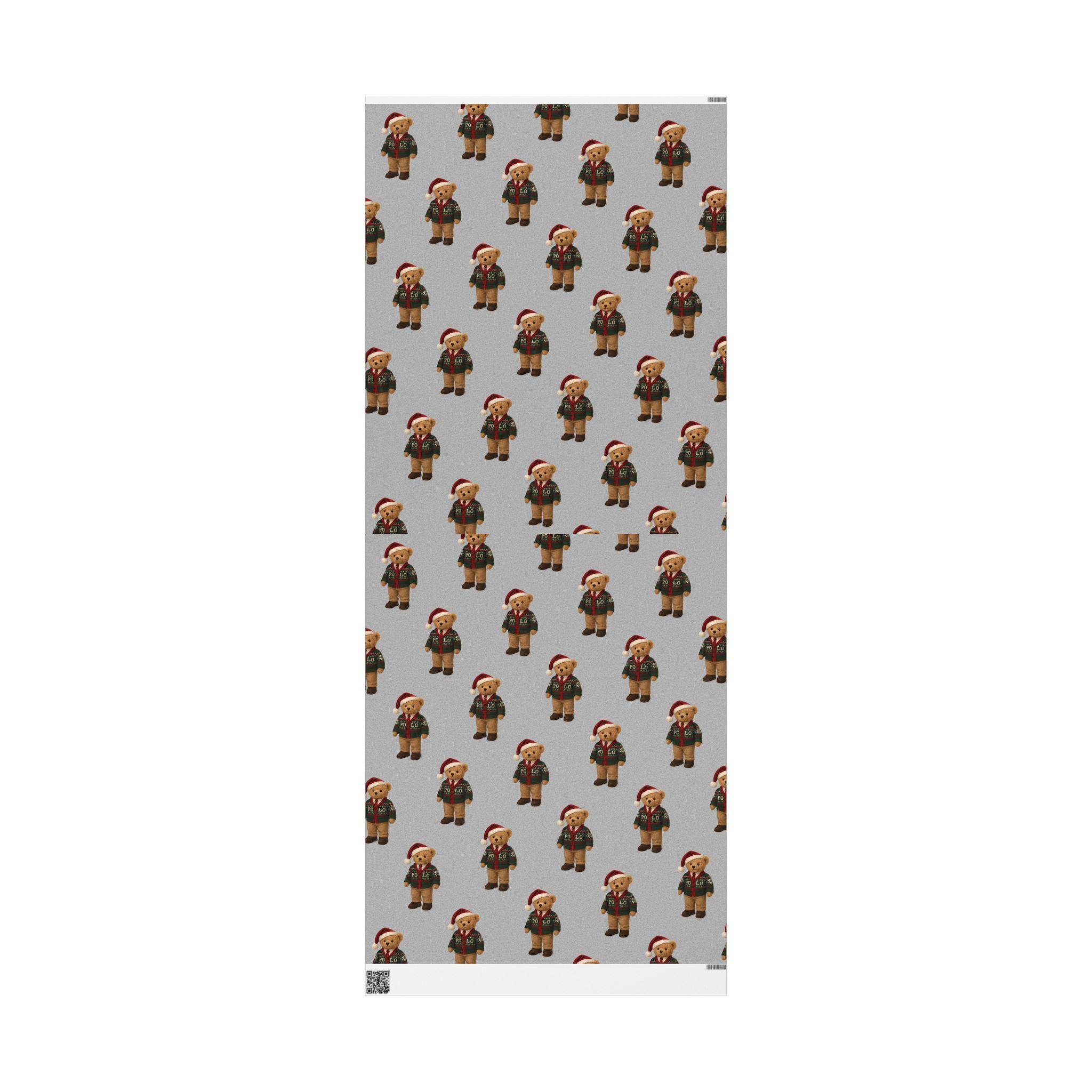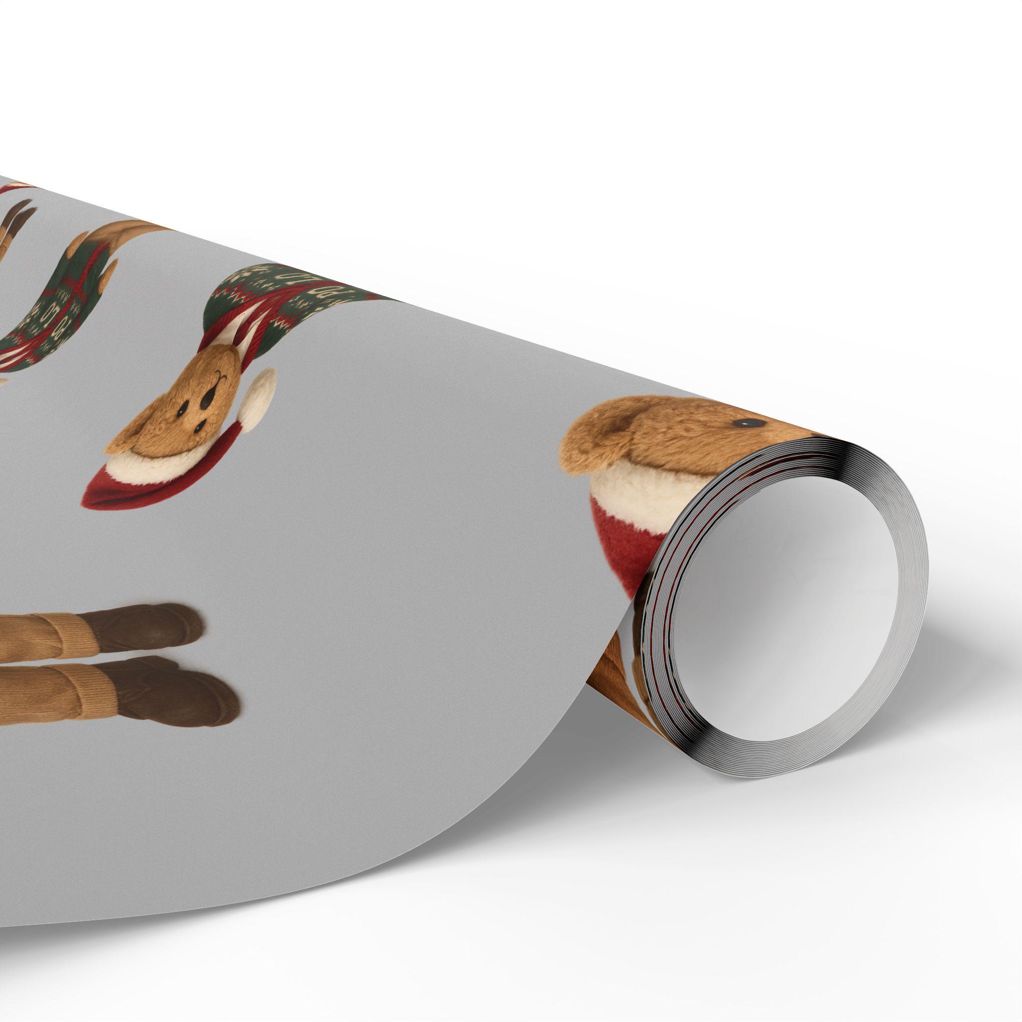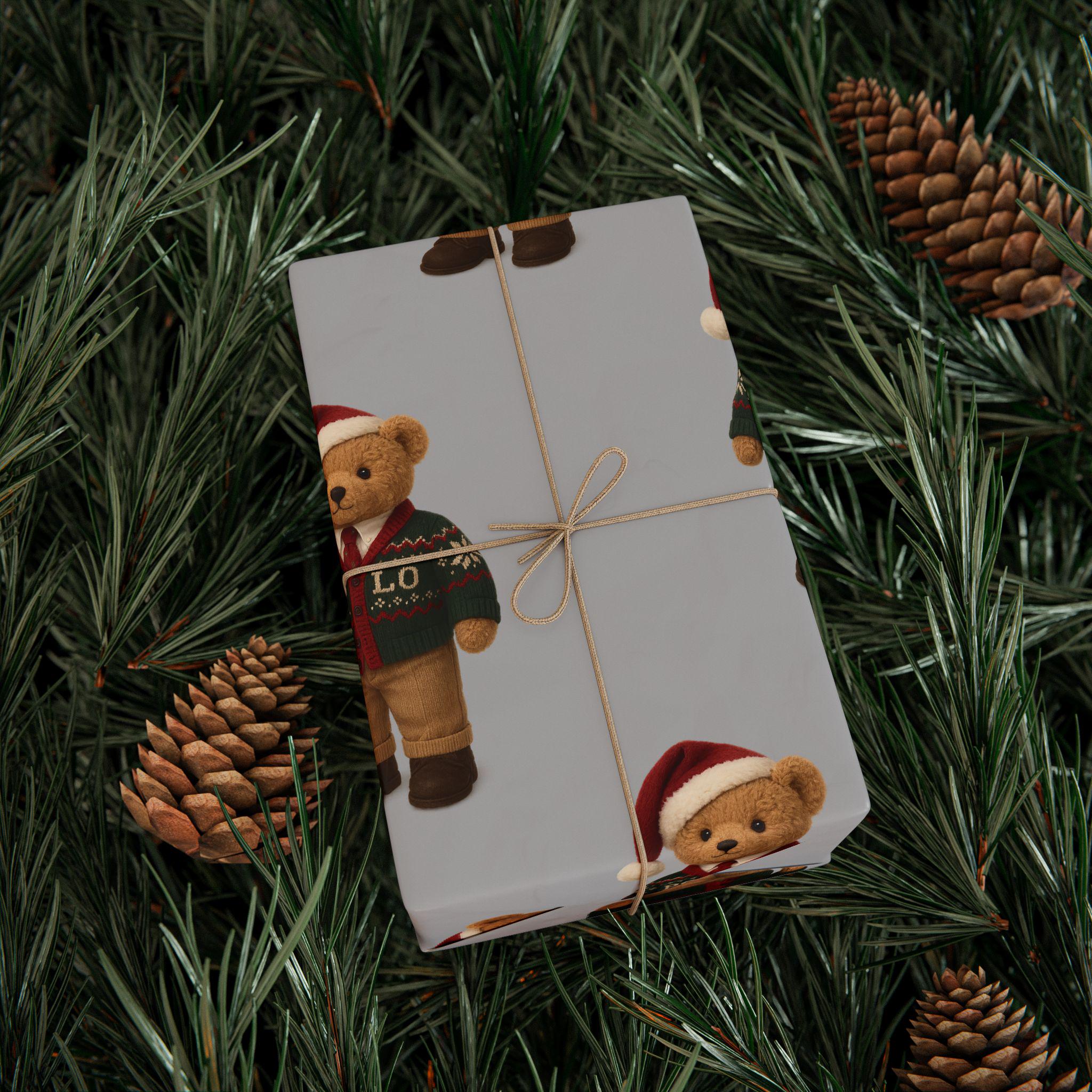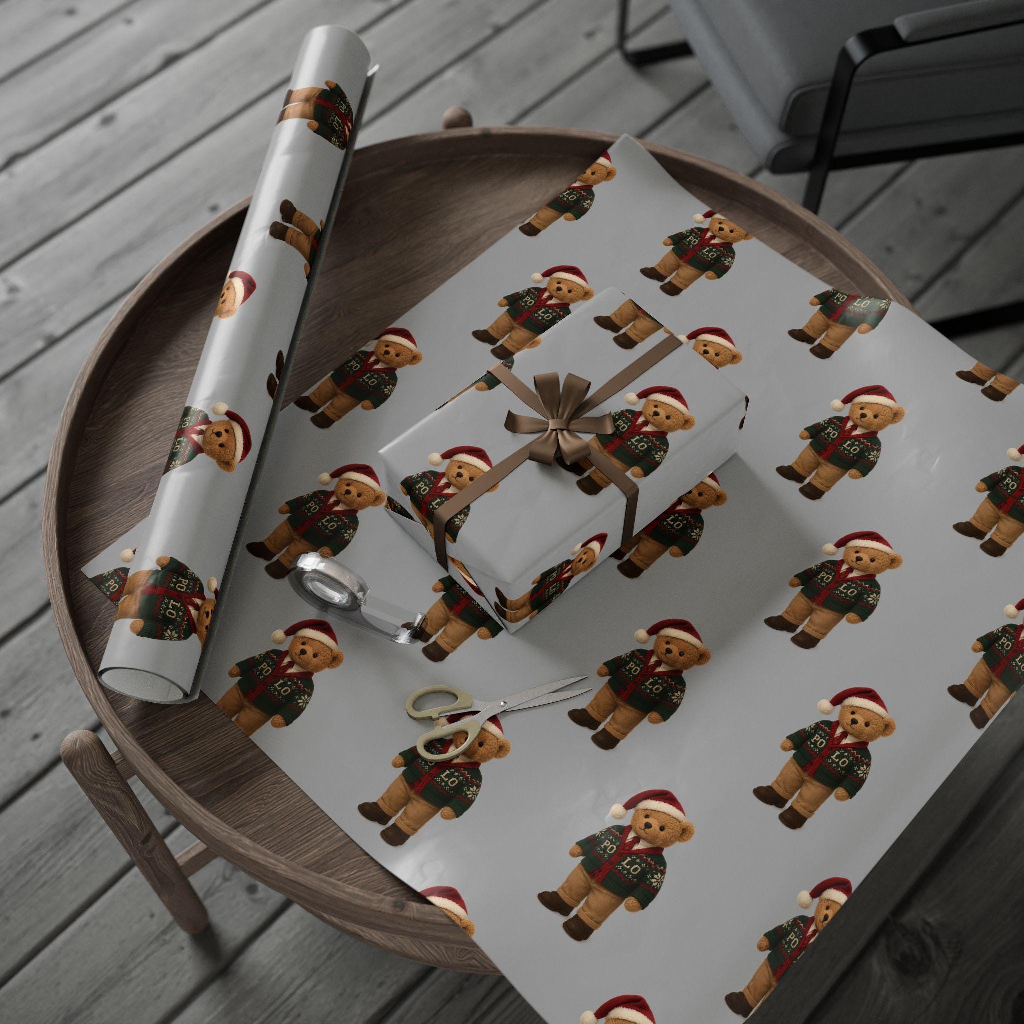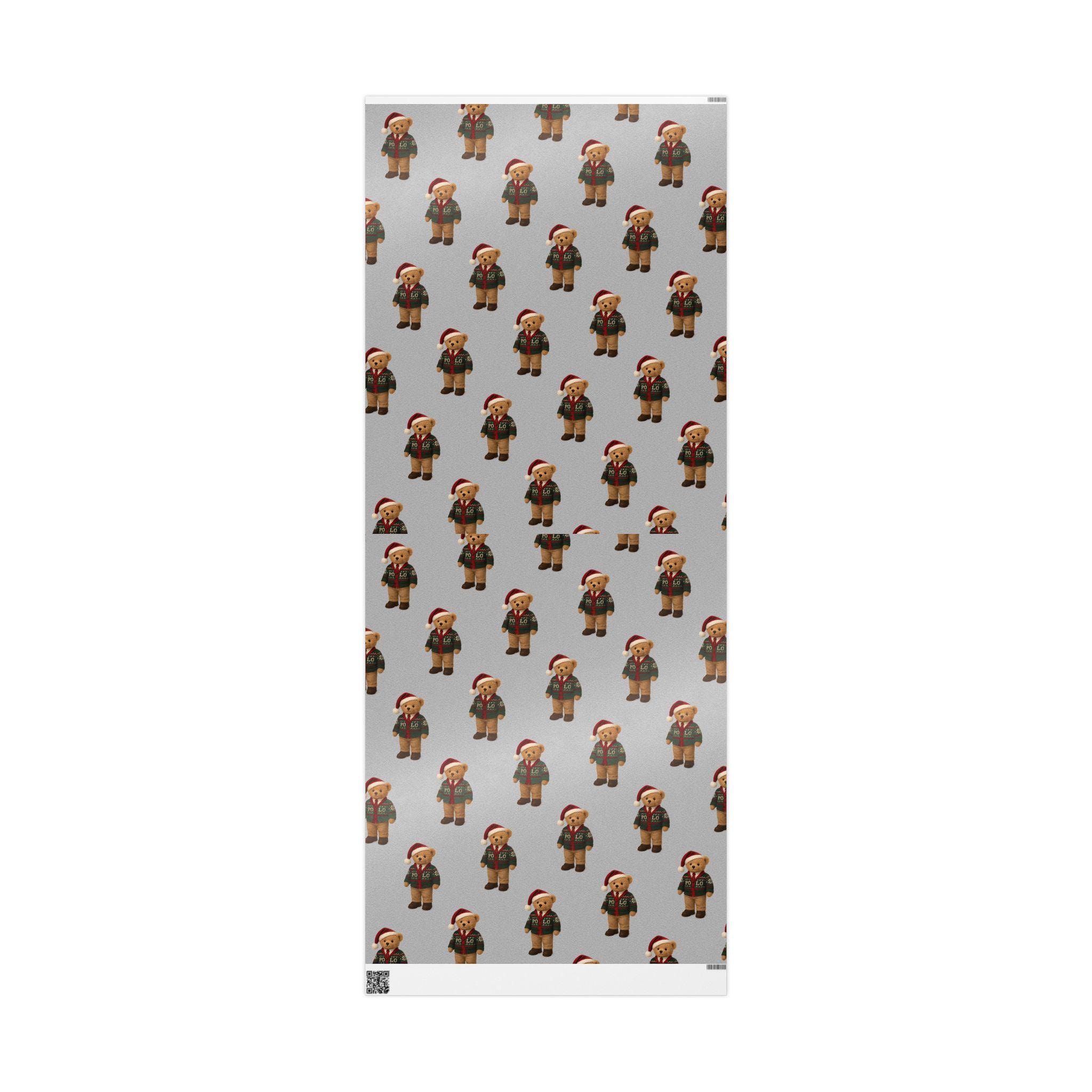 Soft, cozy cheer for holiday moments. This lightweight wrapping paper features a repeating pattern of adorable teddy bears dressed in scarves and Santa hats against a neutral gray field. Each roll carries a warm, handmade vibe — the kind that makes recipients smile before they even lift the bow. Use it to wrap stockings, long boxes, or small bundles; the gentle palette and charming characters bring a quiet, nostalgic feel to mantel displays and under-tree scenes. The one-sided, high-definition print keeps the design crisp, whether you choose a glossy shimmer or a muted matte finish. Small details like the visible white trim with barcode and QR code remain discreet at the roll edges while the main pattern stays uninterrupted.