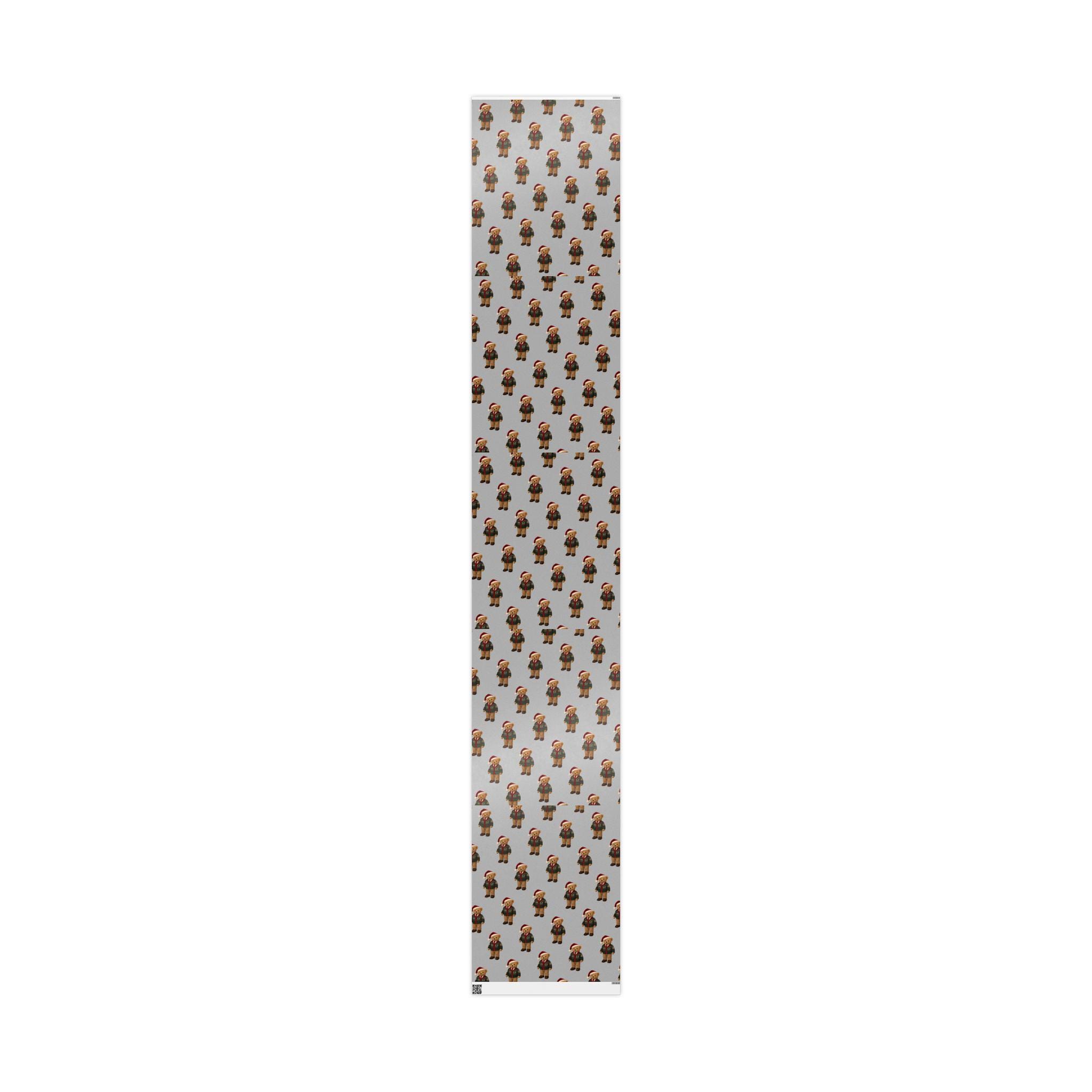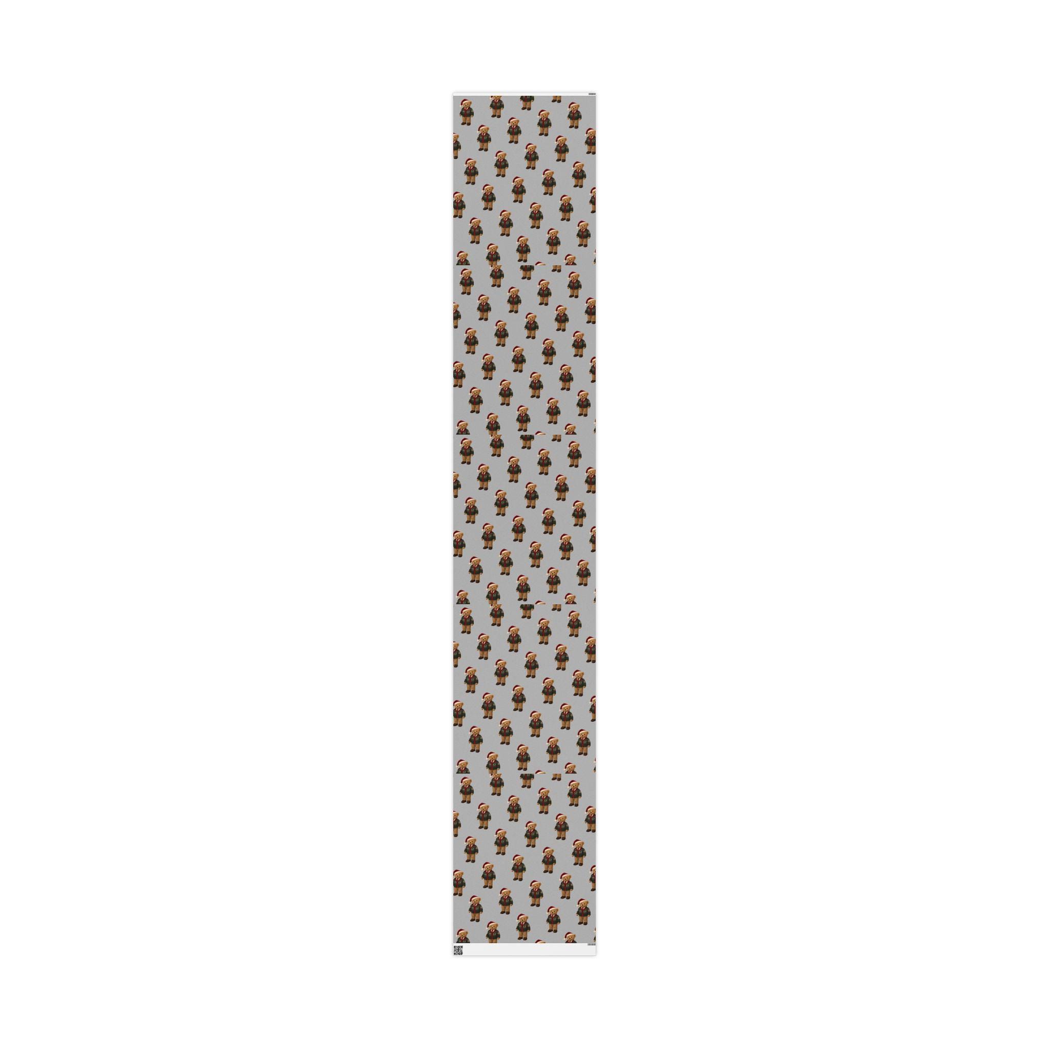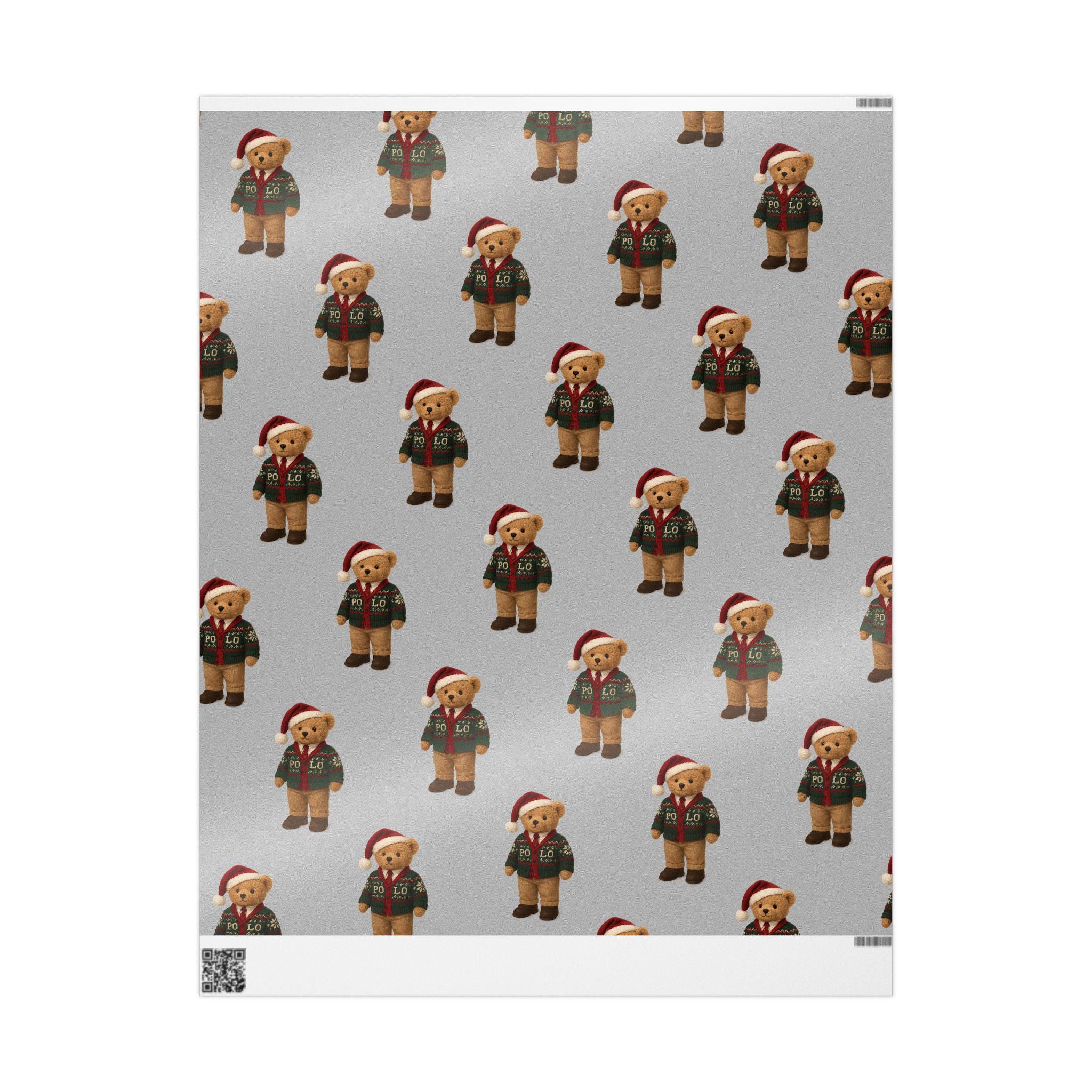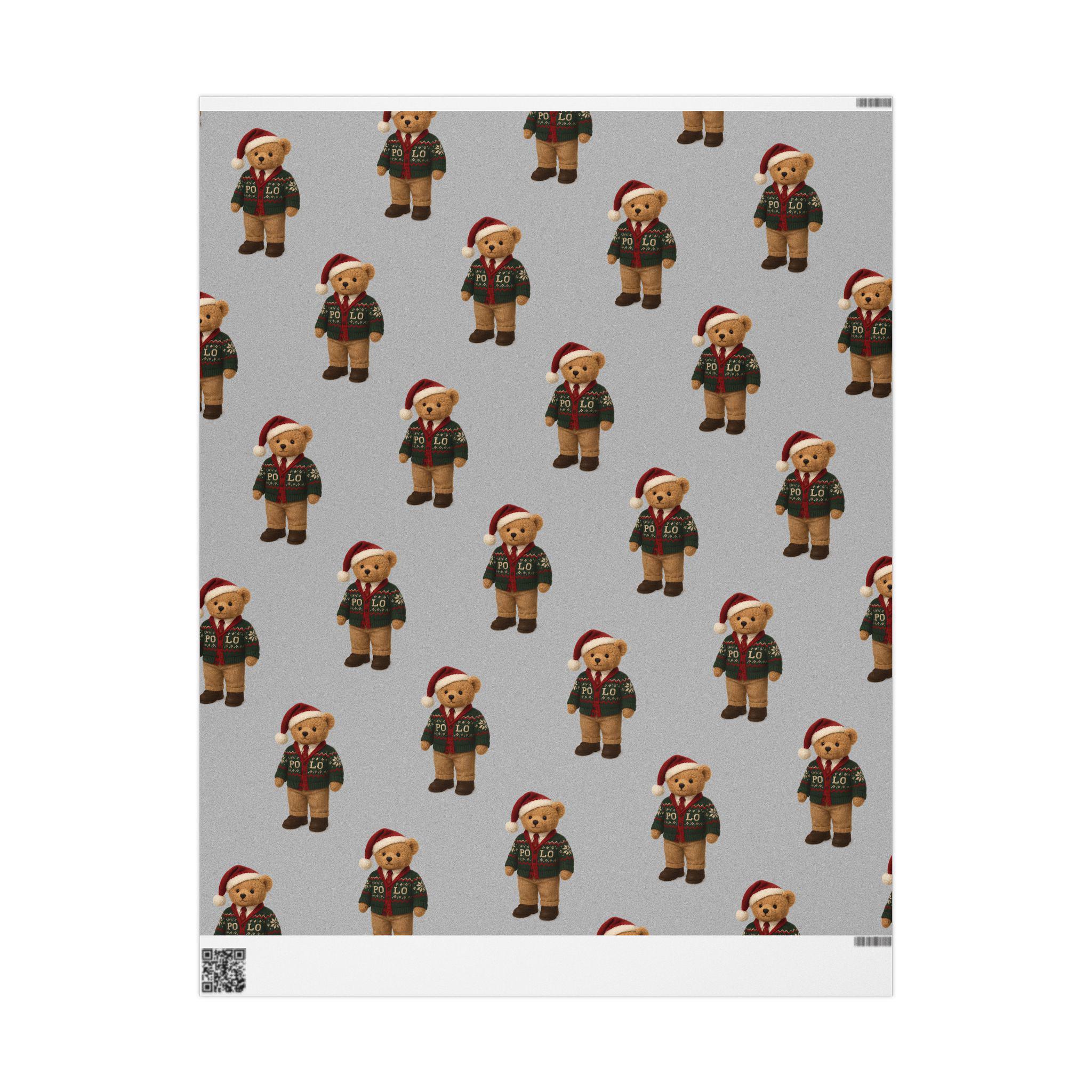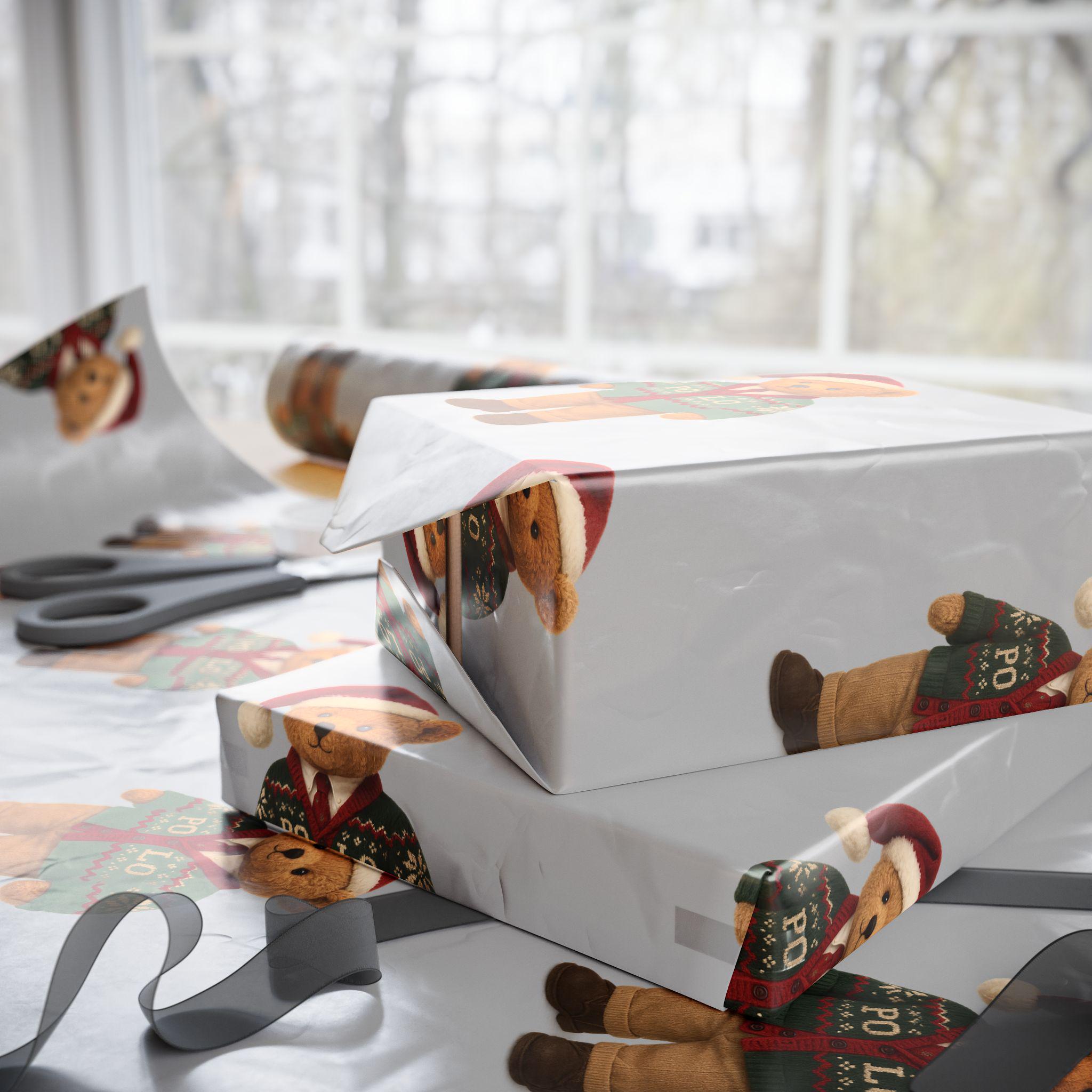 Soft, cozy cheer for holiday moments. This lightweight wrapping paper features a repeating pattern of adorable teddy bears dressed in scarves and Santa hats against a neutral gray field. Each roll carries a warm, handmade vibe — the kind that makes recipients smile before they even lift the bow. Use it to wrap stockings, long boxes, or small bundles; the gentle palette and charming characters bring a quiet, nostalgic feel to mantel displays and under-tree scenes. The one-sided, high-definition print keeps the design crisp, whether you choose a glossy shimmer or a muted matte finish. Small details like the visible white trim with barcode and QR code remain discreet at the roll edges while the main pattern stays uninterrupted.