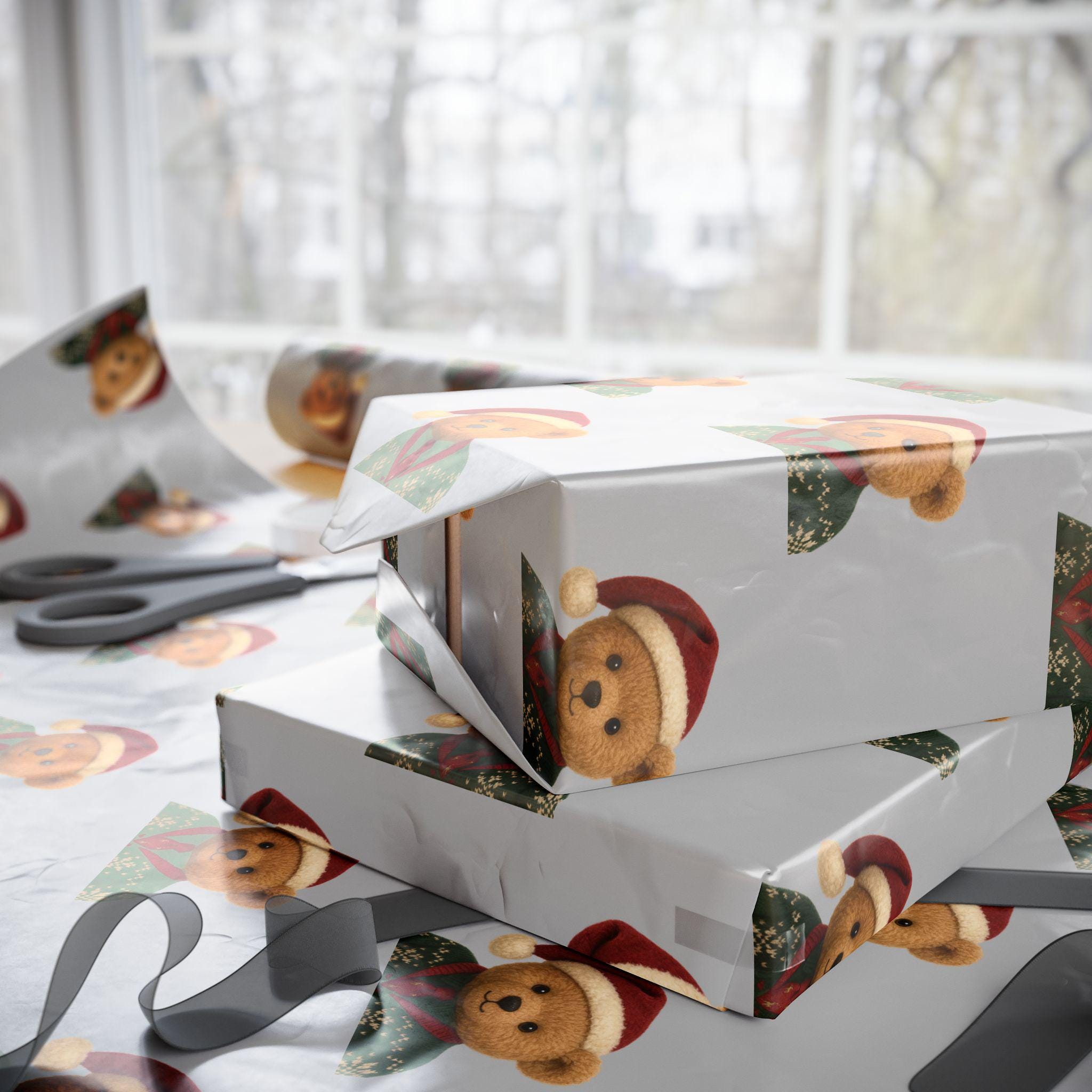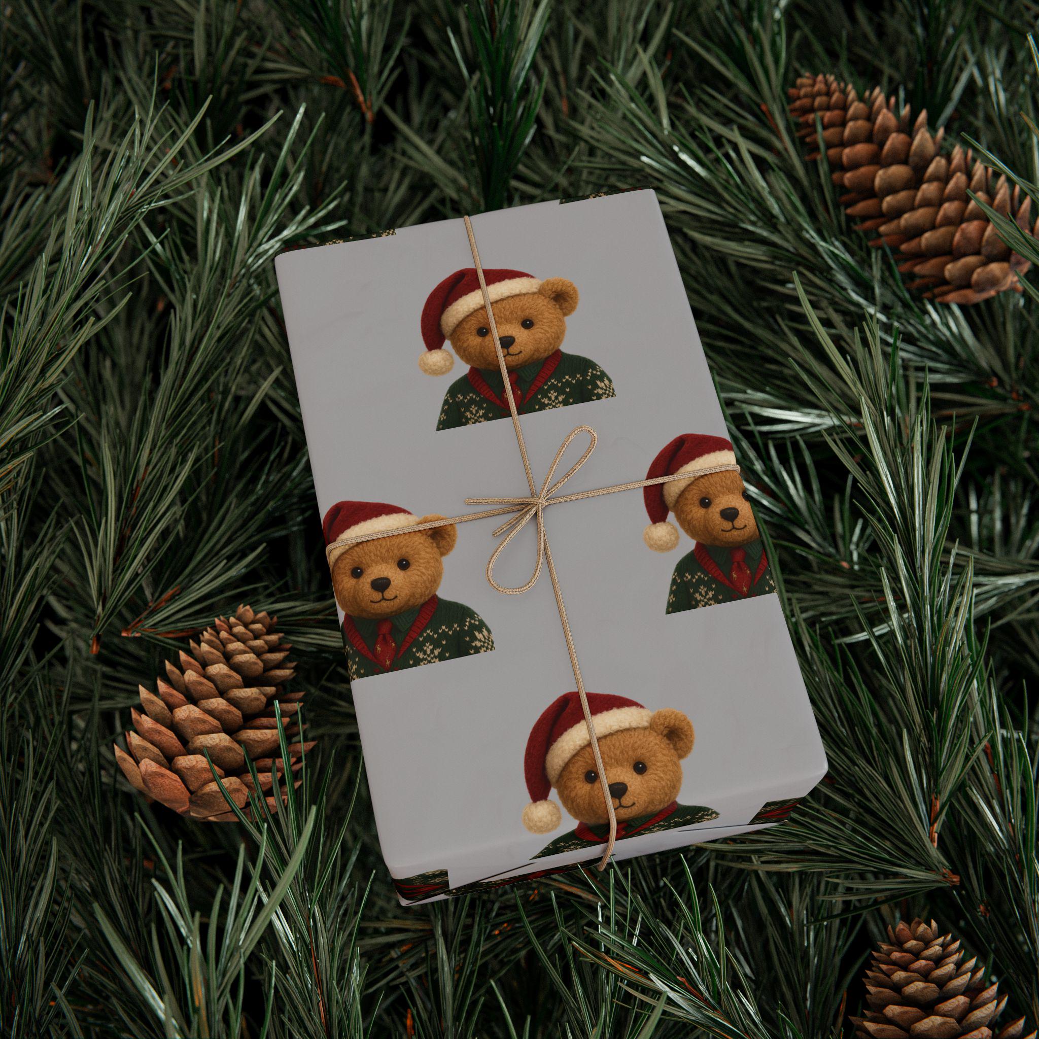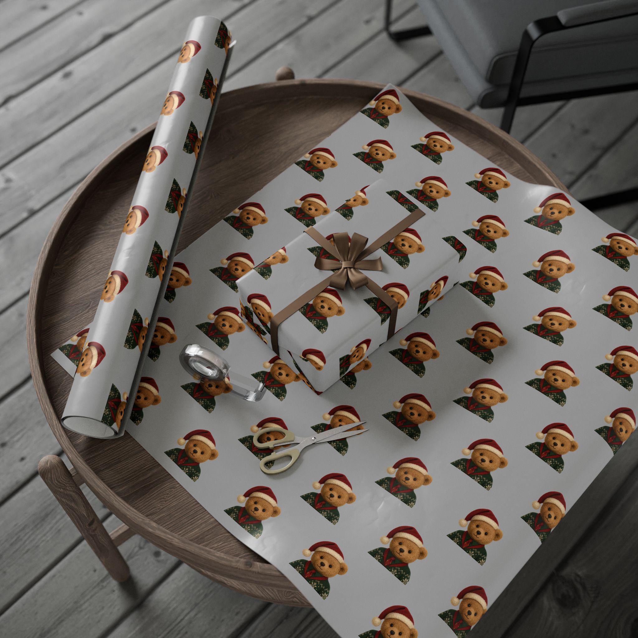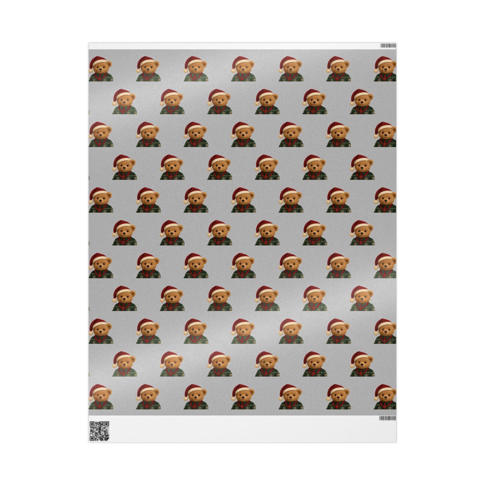 A charming roll of gift wrap that turns every present into a cozy, heartwarming moment. Soft gray paper is patterned with small, smiling teddy bears wearing festive hats and knit sweaters — a gentle, nostalgic design that brings childhood comfort to holiday mornings and winter gatherings. The print sits on one side of sturdy 90gsm fine art paper, available in either glossy or matte finish, and comes in three long sizes to wrap anything from books to boxed treasures. The subtle repeat and neutral background let ribbons and tags stand out while the tiny bears add a touch of whimsy and warmth to each unwrapping.