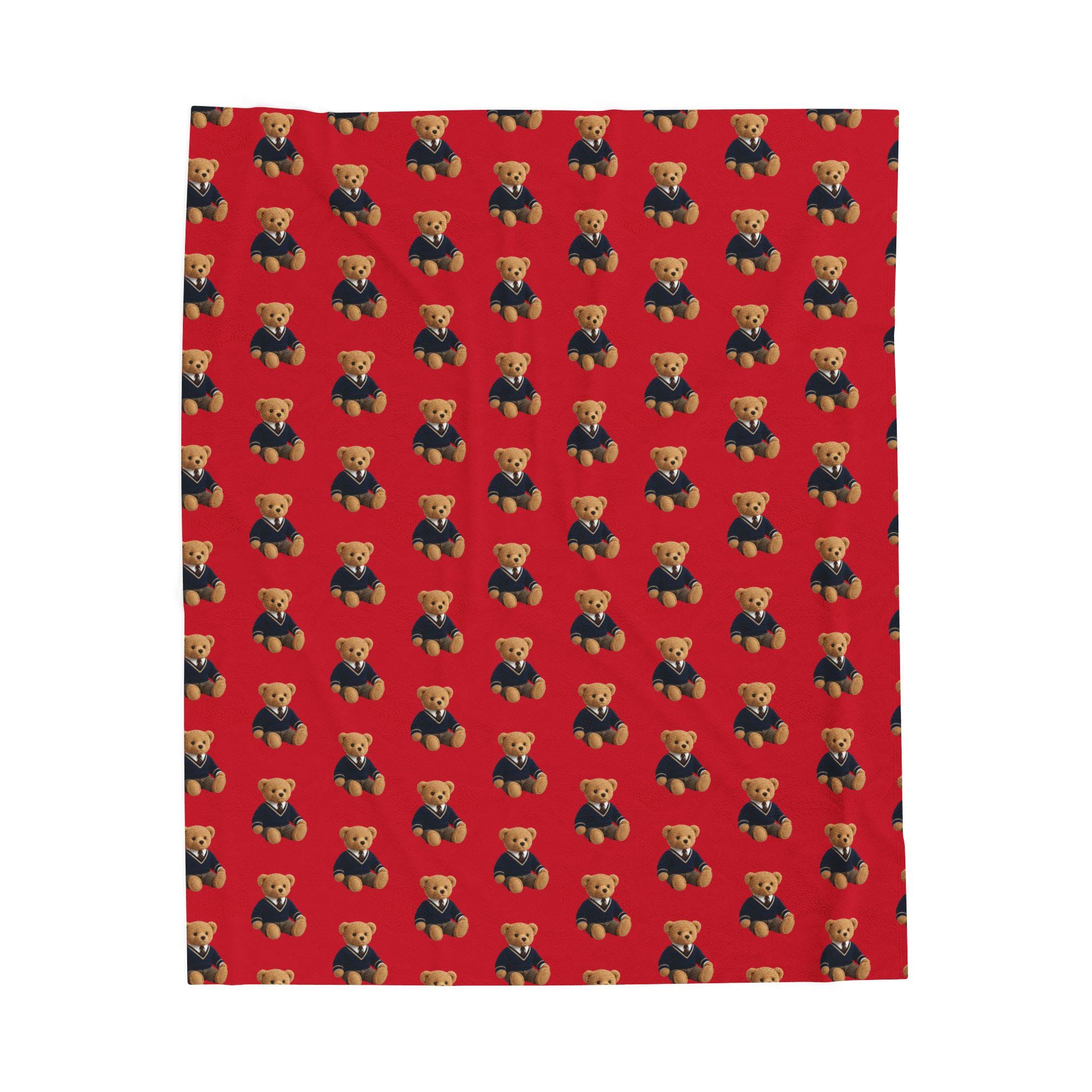 Wrap yourself in nostalgic warmth with this velveteen plush blanket. A repeating vintage teddy-bear motif sits against a rich red field, creating a cozy, storybook vibe that feels both playful and comforting. The fabric is sumptuously soft with a medium-heavy weight that drapes easily over laps, couches, and beds. Because the design is printed on one side in vivid, high-detail color, the pattern stands out while the reverse stays soft and neutral — excellent for curling up with a hot drink, reading by lamplight, or layering during quiet movie nights. Thoughtfully stitched with double-needle topstitching for durability, this blanket is made to be lived with and loved through many quiet, shared moments.