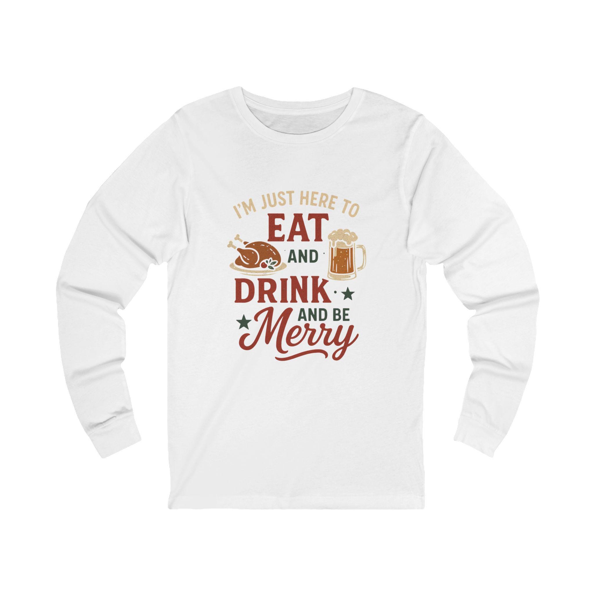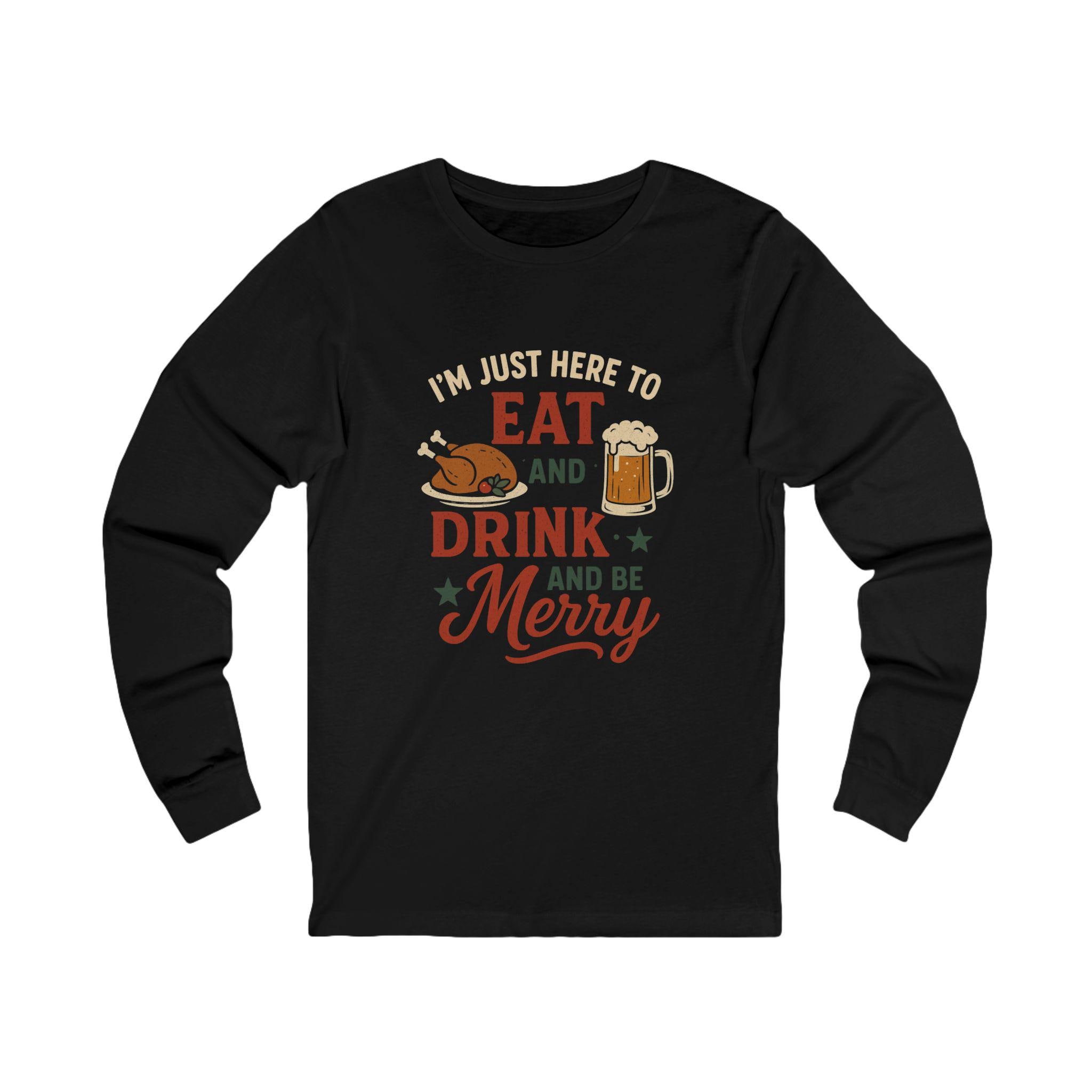 Lightweight long-sleeve tee with a warm, festive print that reads “I’m just here to eat and drink and be merry.” The soft Airlume cotton feel and retail fit make it easy to slip on for holiday dinners, casual gatherings, or laid-back evenings by the fire. The print’s muted holiday palette and playful icons (turkey, beer mug, stars) lend a cozy, tongue-in-cheek vibe that keeps the mood cheerful without shouting for attention. Built with side seams, shoulder tape, and a ribbed collar, this shirt keeps its shape wash after wash. It’s a simple, comfortable layer that blends into family tables, seasonal parties, and relaxed winter nights while letting your lighthearted spirit show.