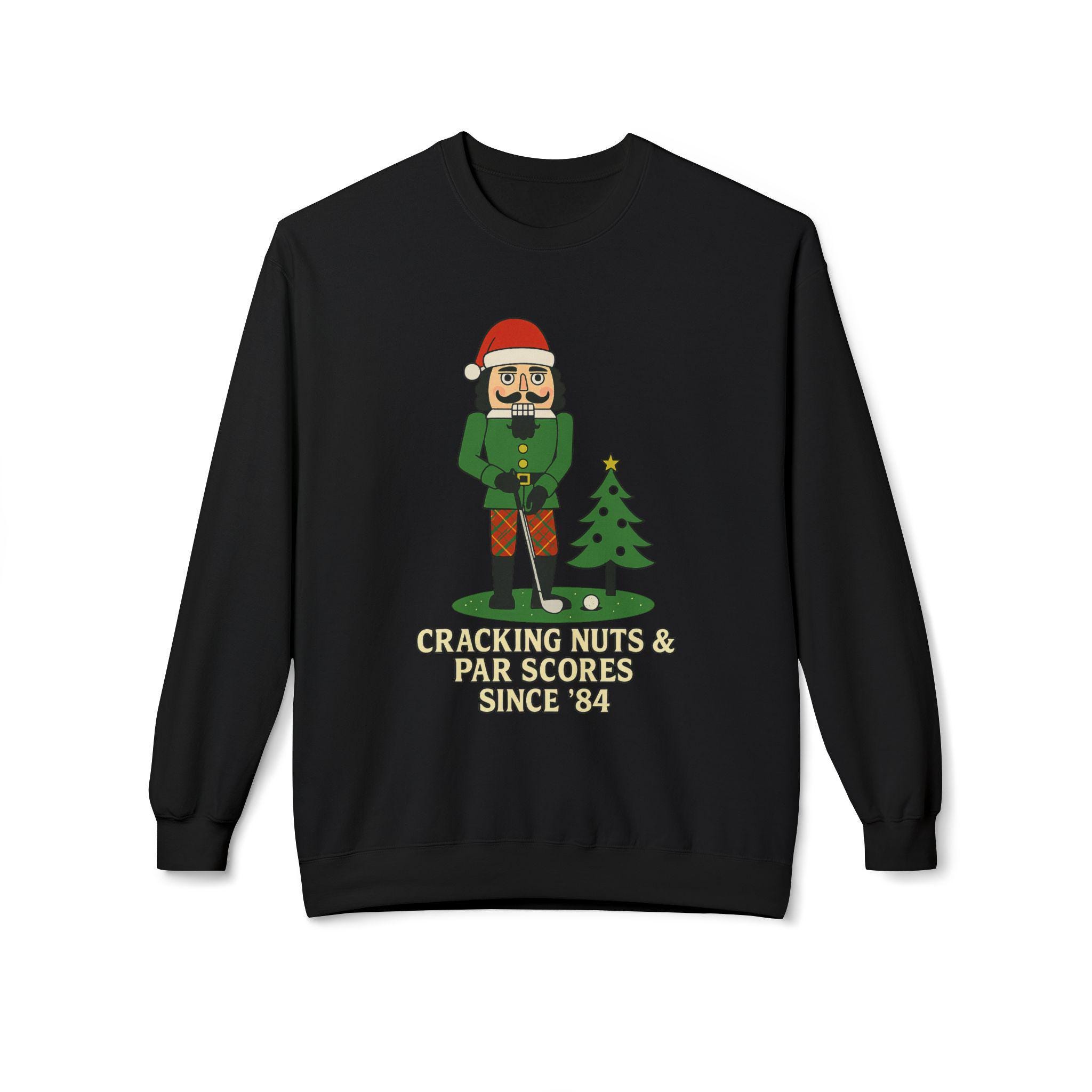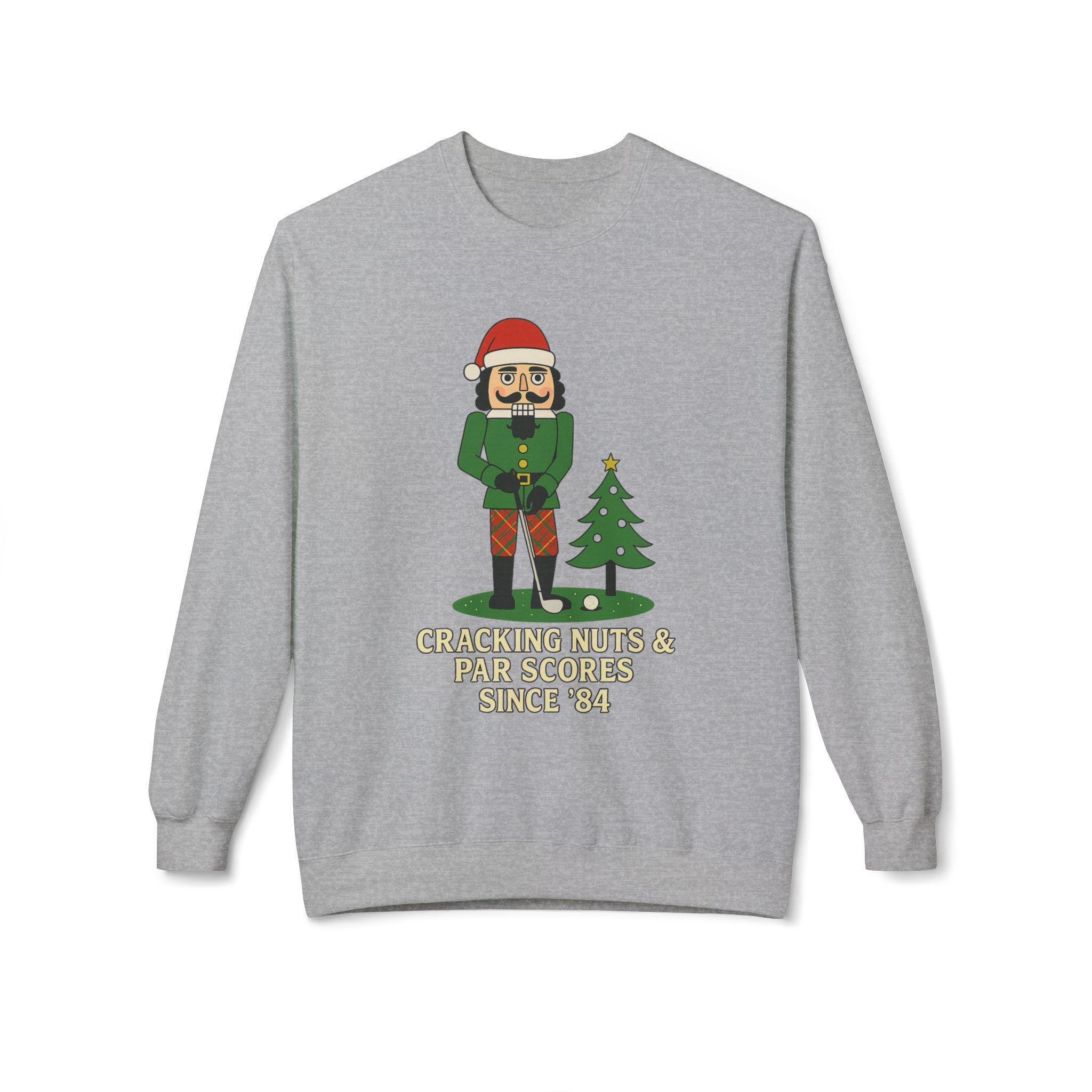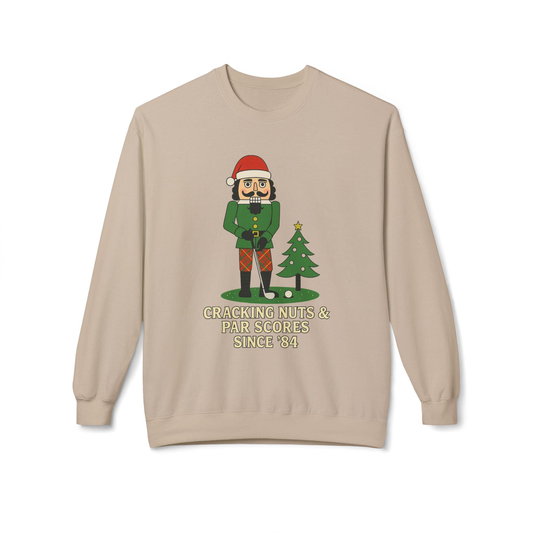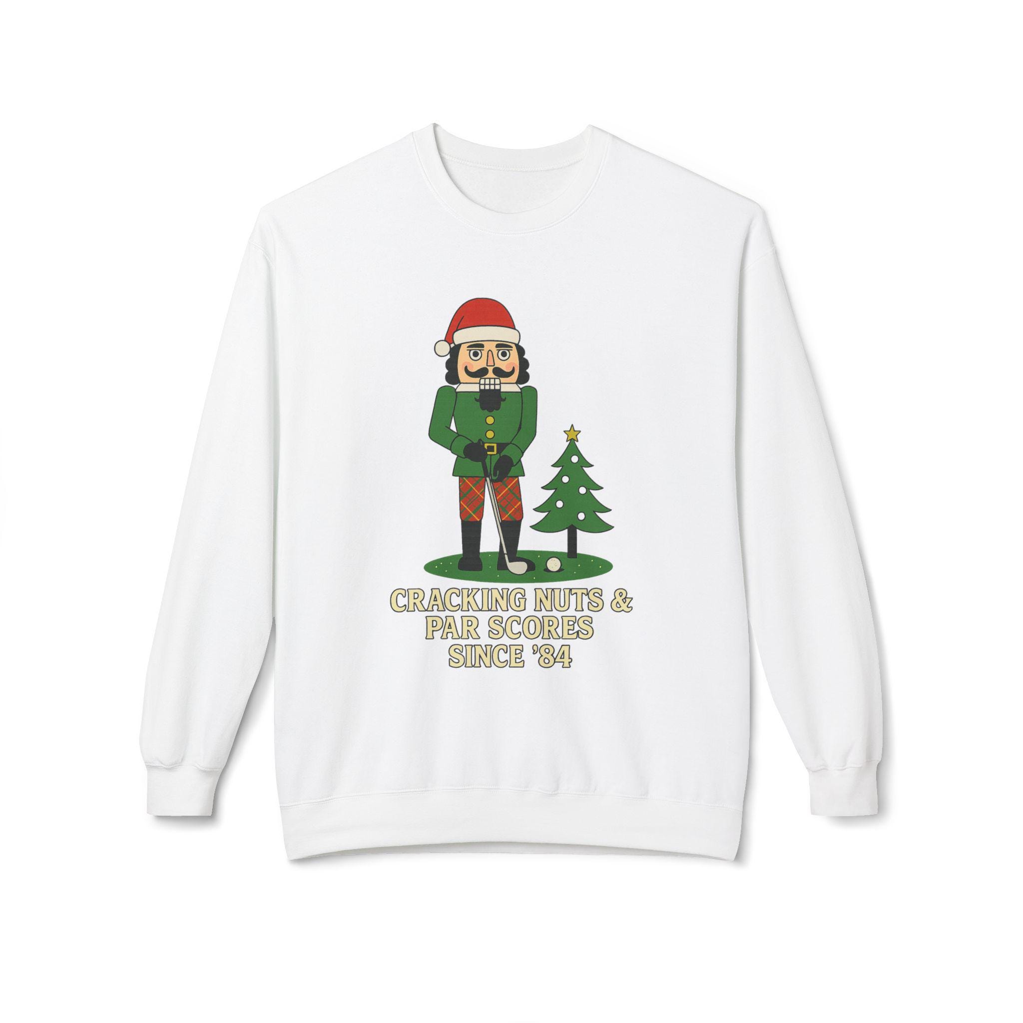 This medium-weight fleece crewneck brings cozy vintage holiday charm to cold evenings. The front features a cheerful nutcracker in a red hat beside a simple evergreen, with playful text that reads “Cracking Nuts & Fir Scores Since ’94.” The classic fit and dropped shoulders create a relaxed, lived-in silhouette that layers easily over tees or under a winter coat. Soft ring-spun cotton with a bit of polyester gives the fabric a warm, slightly pill-resistant hand and a smooth print surface for the detailed artwork. Subtle details like ribbed cuffs with spandex and a tear-away label keep comfort and wearability high. Reach-certified and made with tubular knit construction, this sweatshirt feels thoughtful and durable—something you’ll reach for during tree-trimming sessions, carol singalongs, or cozy evenings around a small, decorated living room tree.