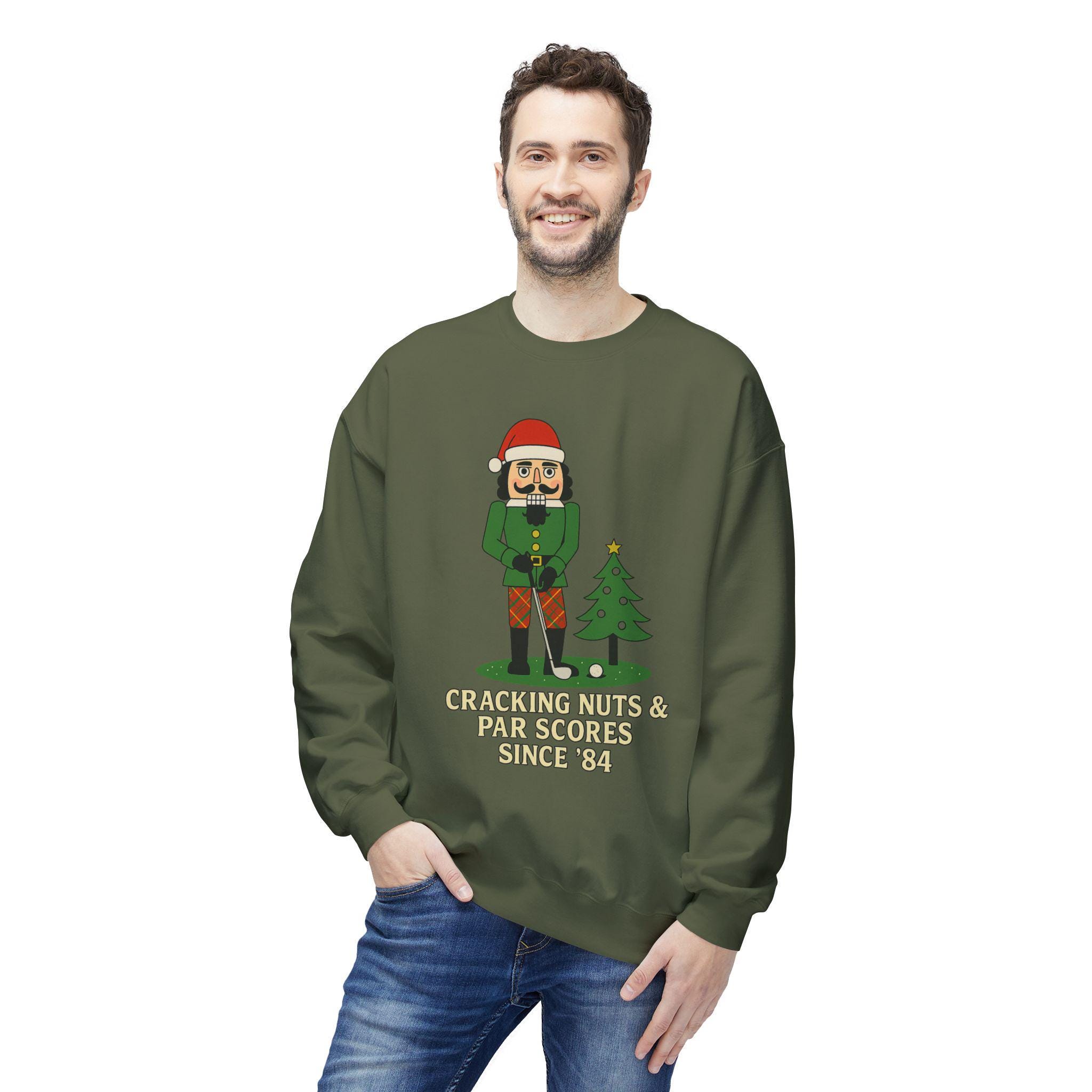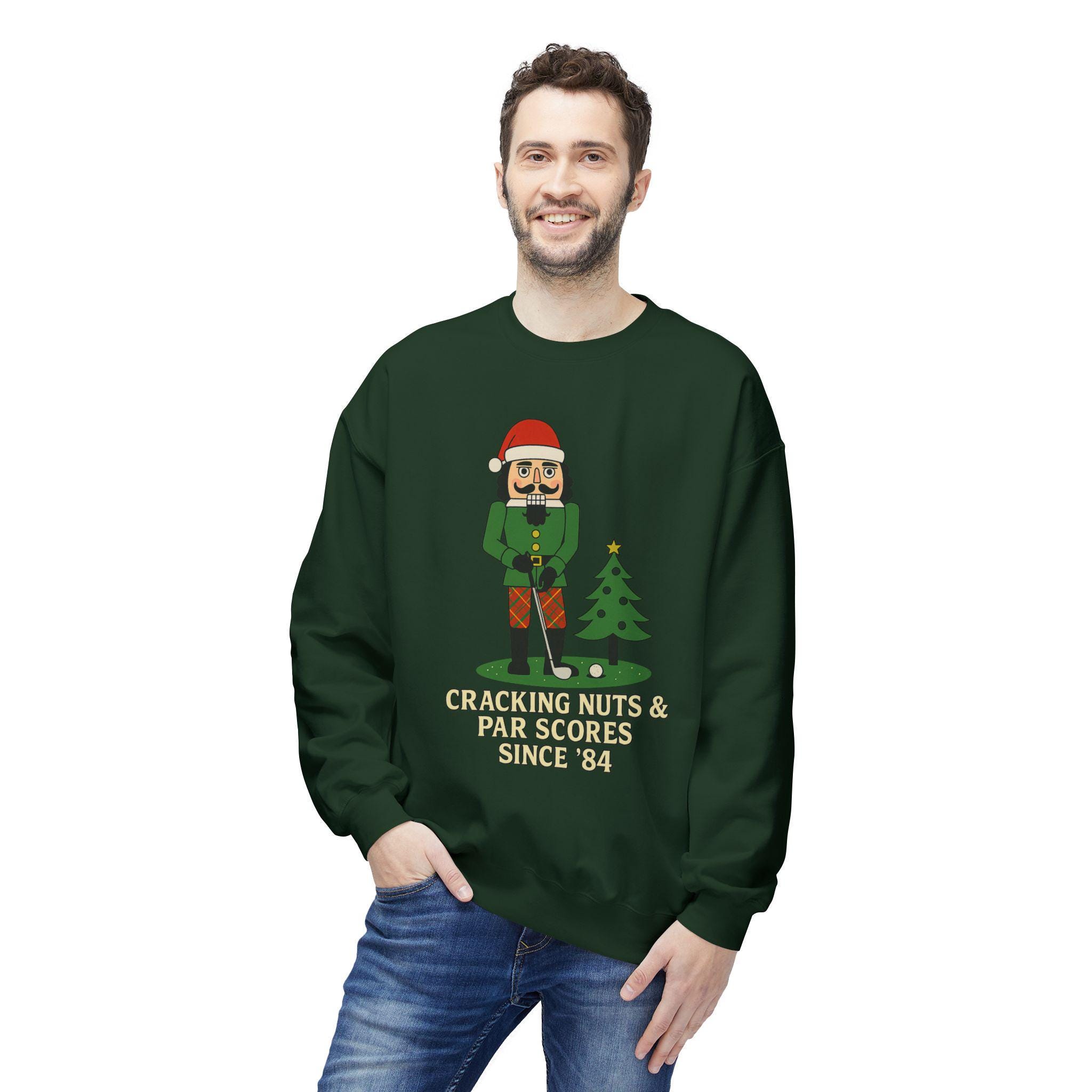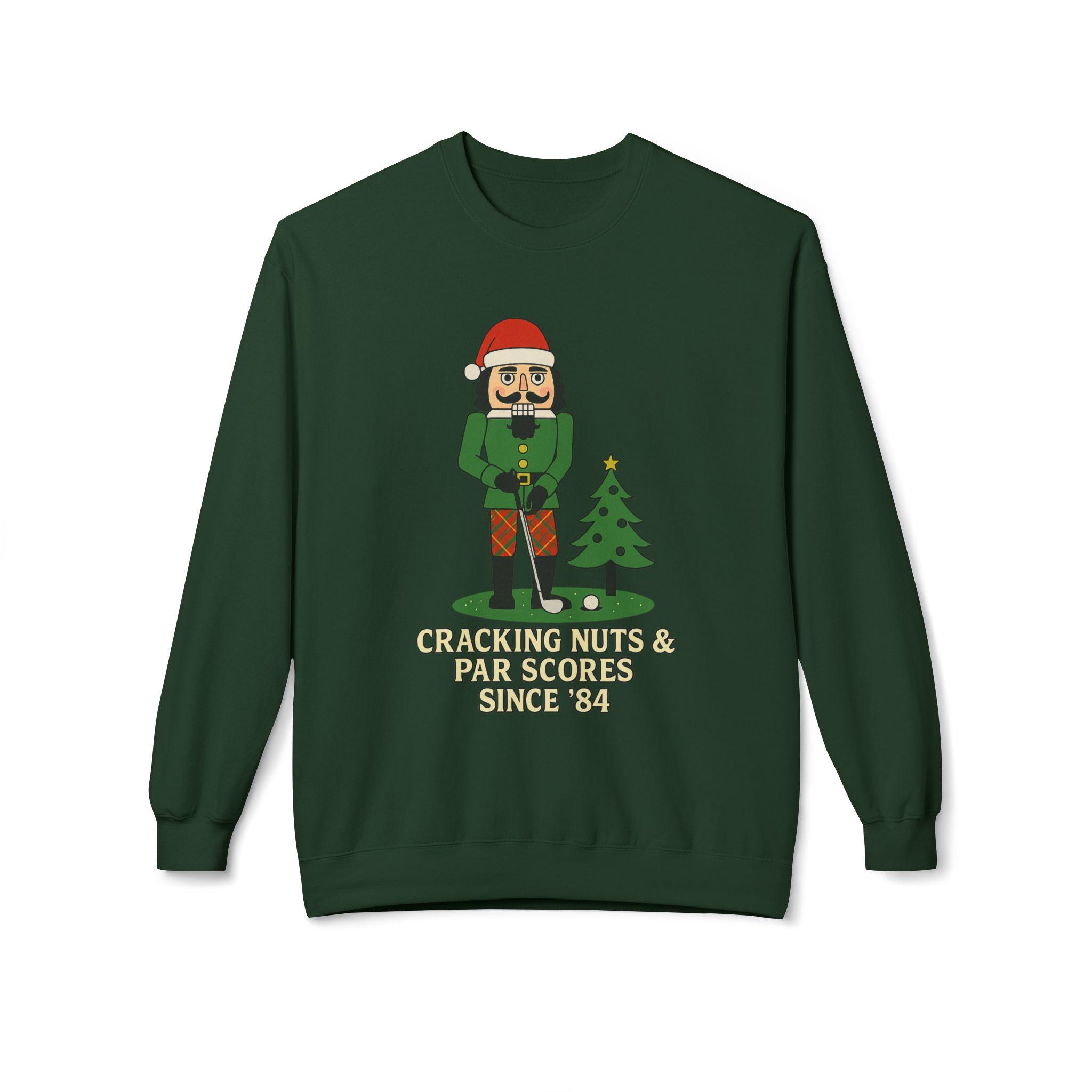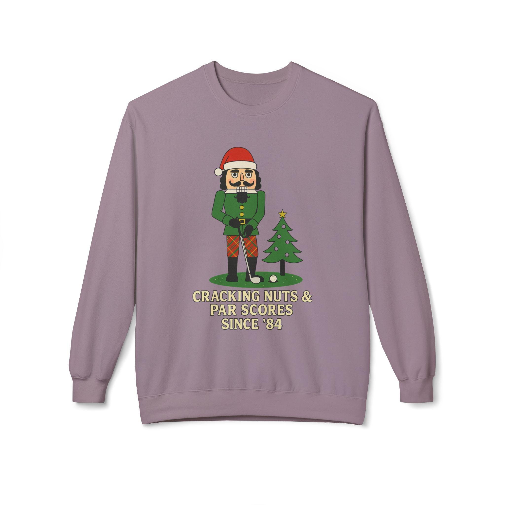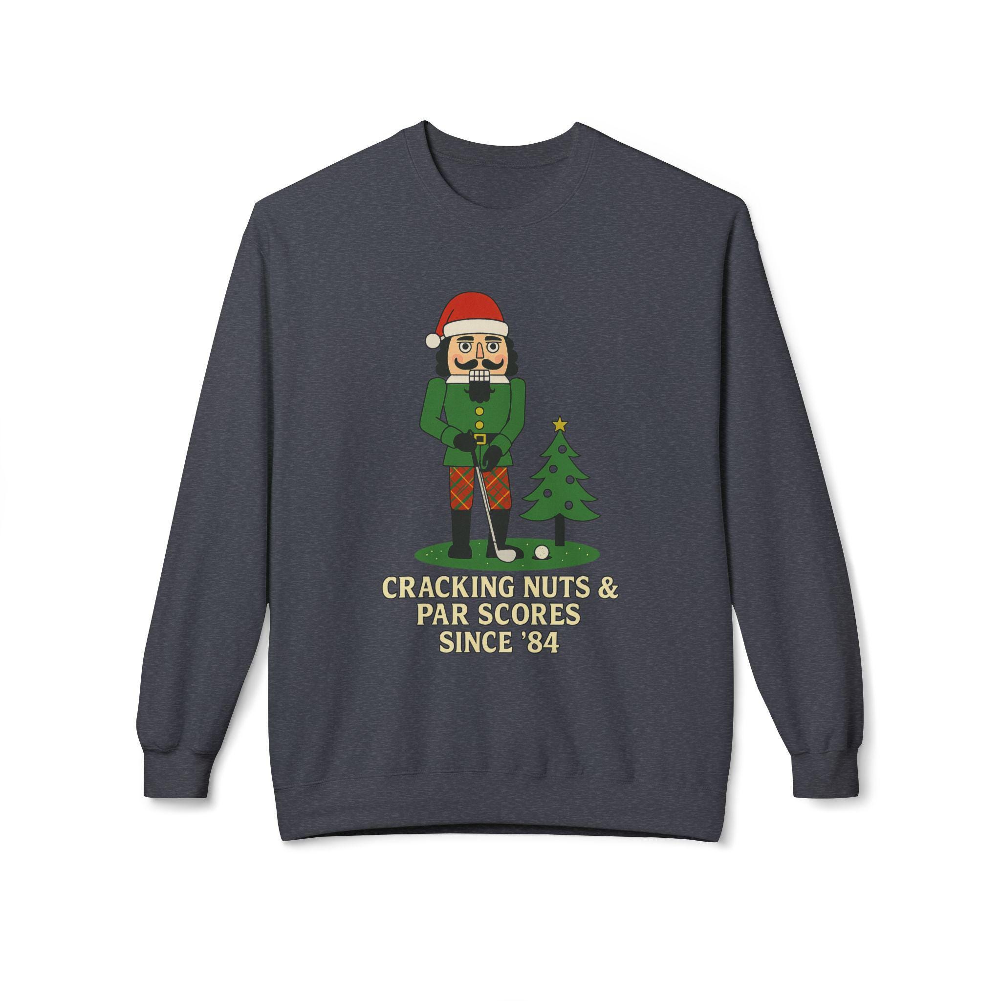 This medium-weight fleece crewneck brings cozy vintage holiday charm to cold evenings. The front features a cheerful nutcracker in a red hat beside a simple evergreen, with playful text that reads “Cracking Nuts & Fir Scores Since ’94.” The classic fit and dropped shoulders create a relaxed, lived-in silhouette that layers easily over tees or under a winter coat. Soft ring-spun cotton with a bit of polyester gives the fabric a warm, slightly pill-resistant hand and a smooth print surface for the detailed artwork. Subtle details like ribbed cuffs with spandex and a tear-away label keep comfort and wearability high. Reach-certified and made with tubular knit construction, this sweatshirt feels thoughtful and durable—something you’ll reach for during tree-trimming sessions, carol singalongs, or cozy evenings around a small, decorated living room tree.