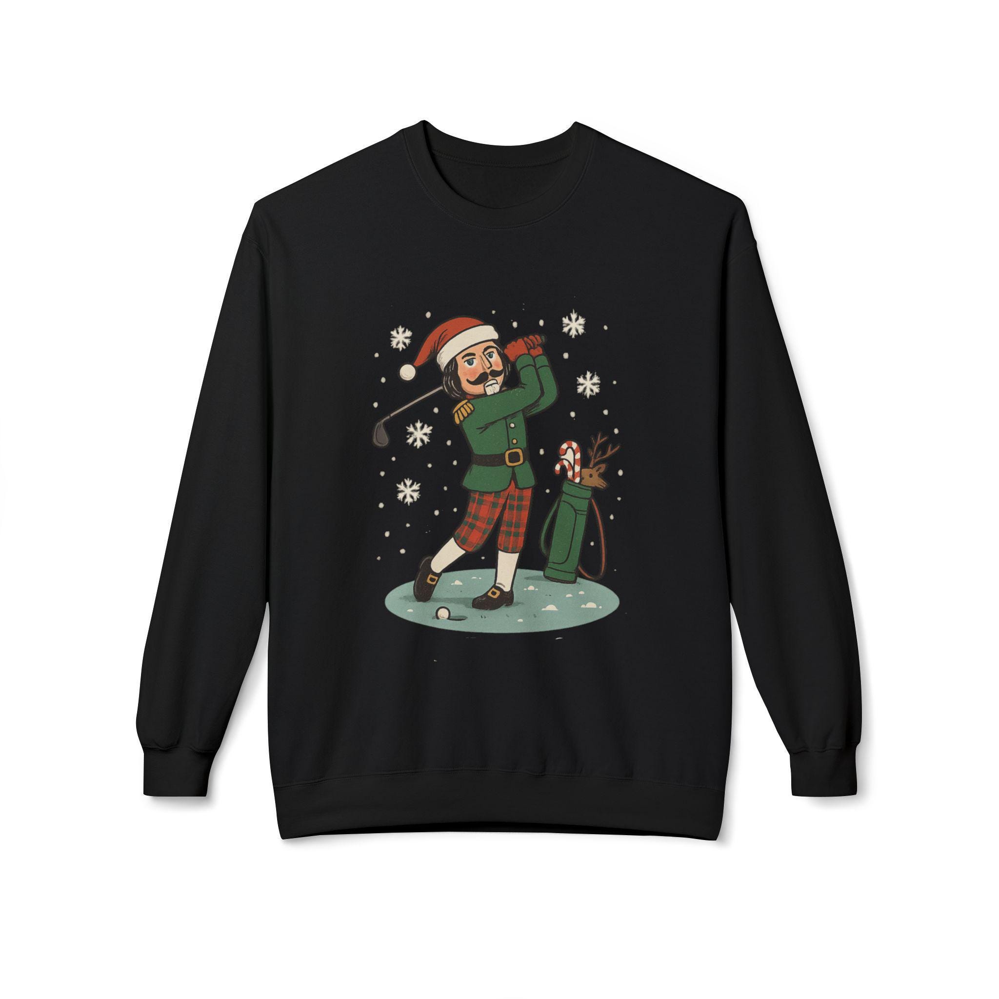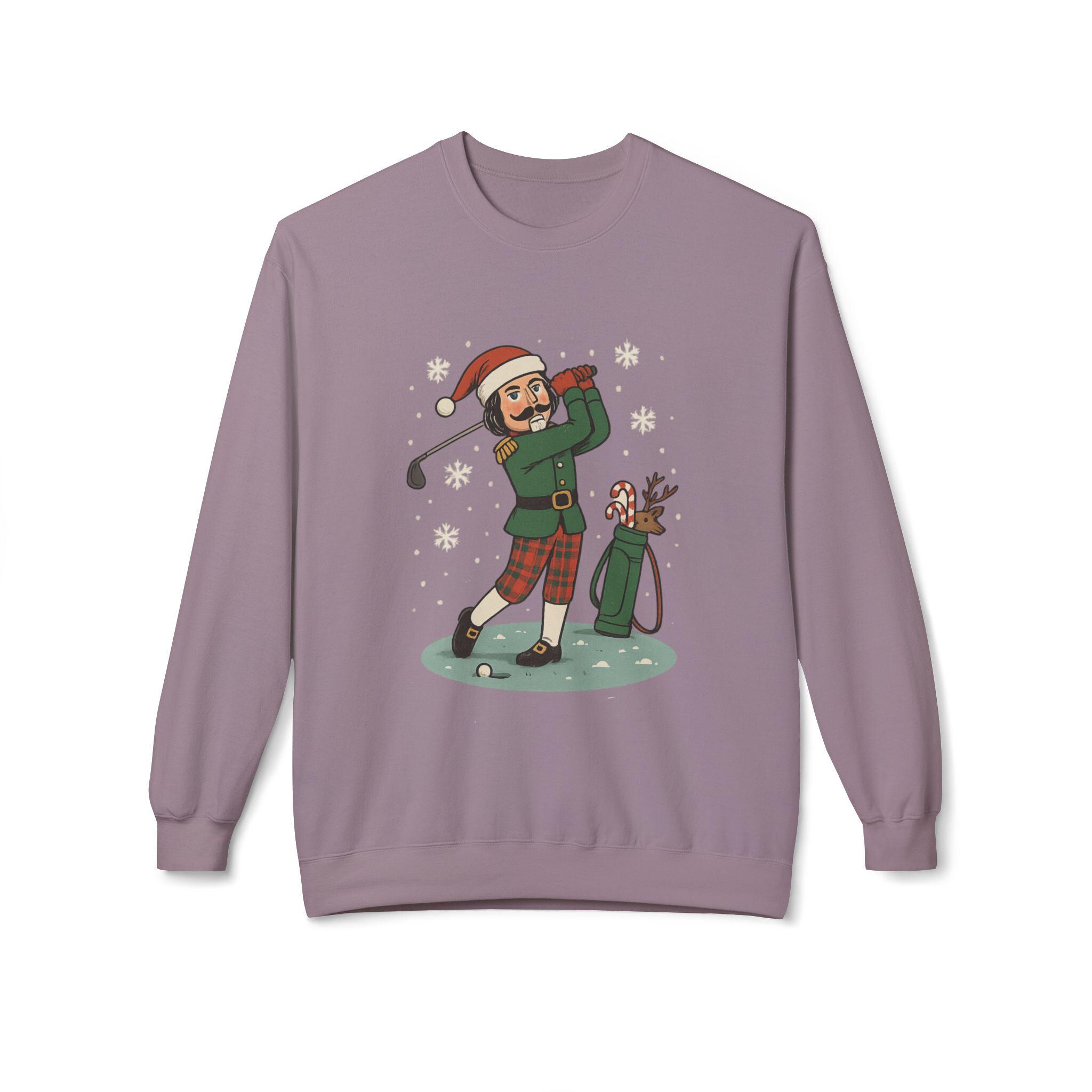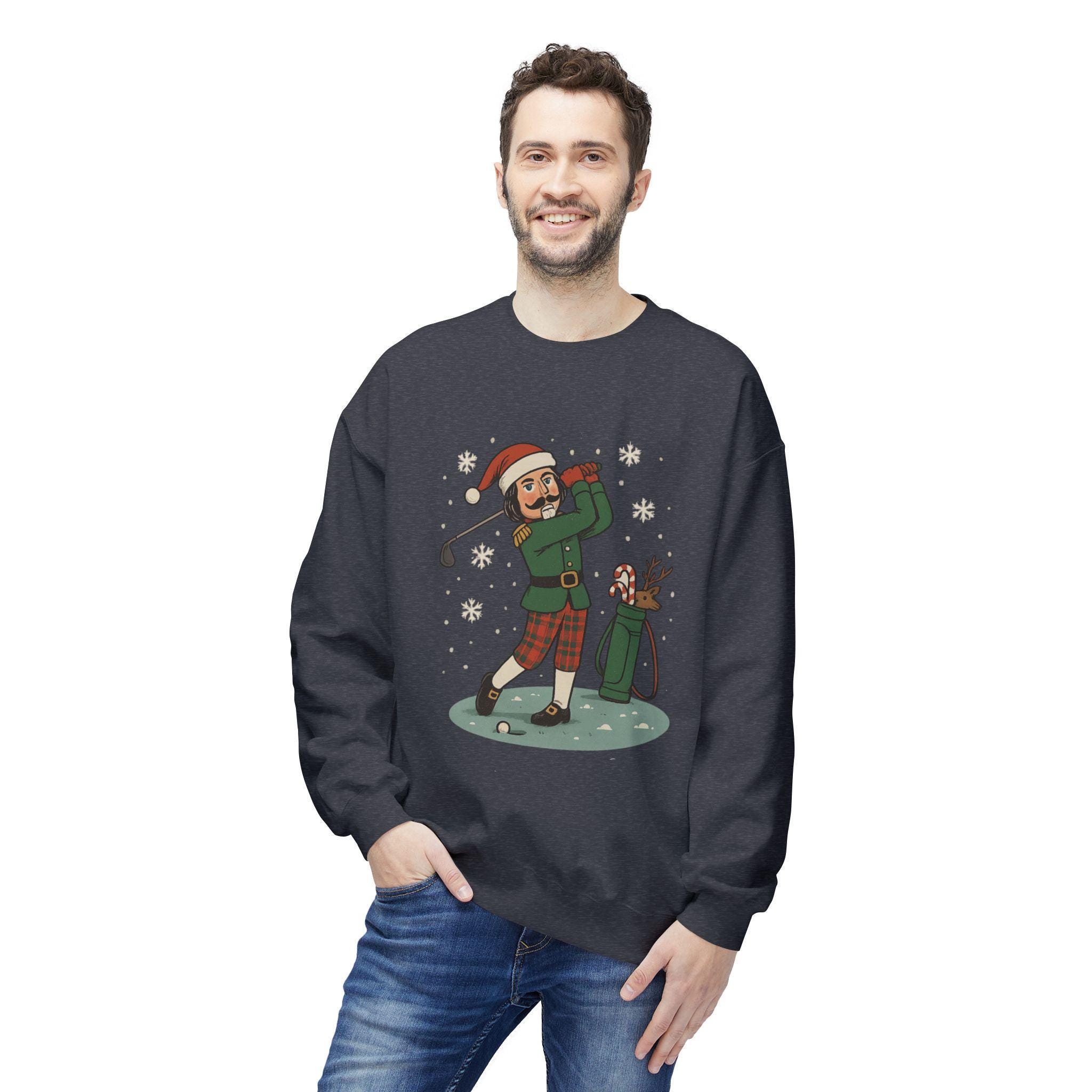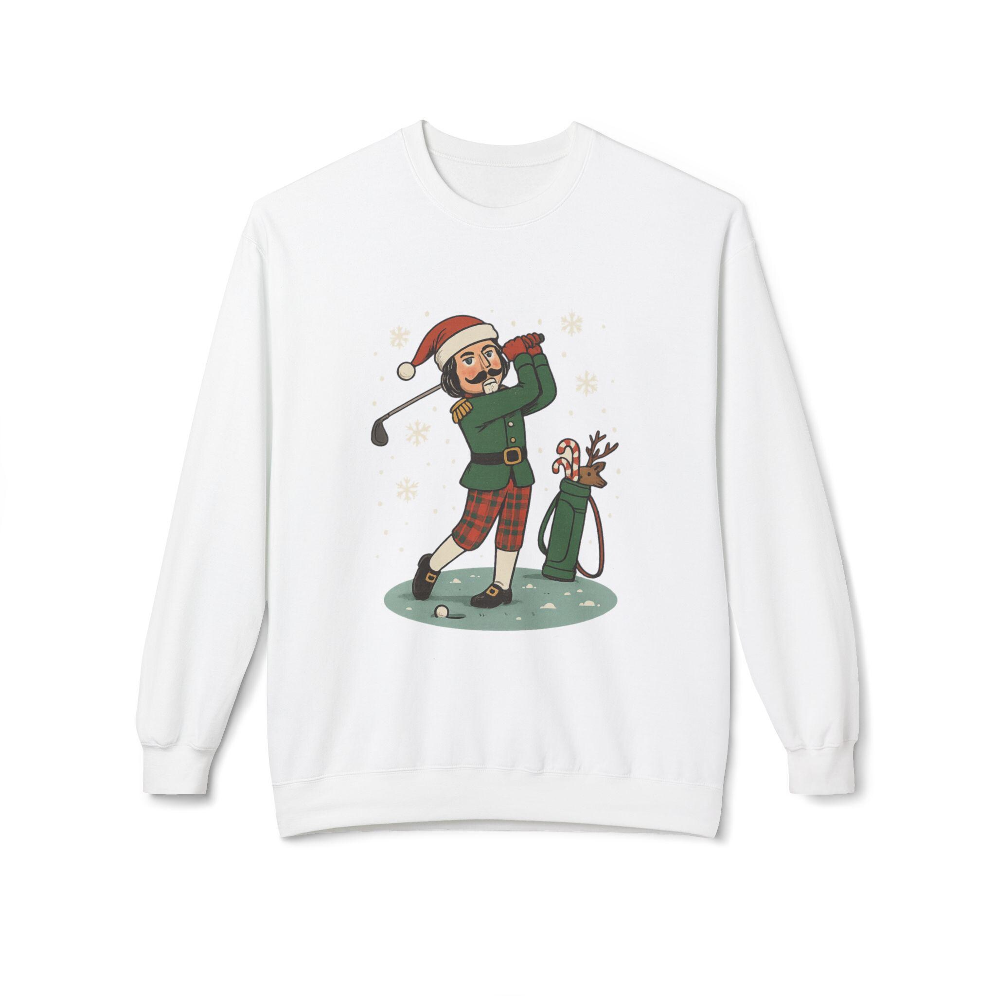 Wrap winter rounds in playful charm. This midweight fleece crewneck features a cozy, classic fit and a cheerful illustration of a holiday golfer in tartan pants — a warm nod to those who mix fairways with festive spirit. The dropped shoulders and ribbed cuffs create a relaxed silhouette that layers easily over shirts or thermals. Soft ring‑spun cotton with a polyester blend gives it that lived‑in warmth while holding its shape; tubular knitting keeps seams clean and comfortable against the skin. Wear it to casual club gatherings, after-a-round warmups, or low-key holiday parties where comfort meets lighthearted golf pride.