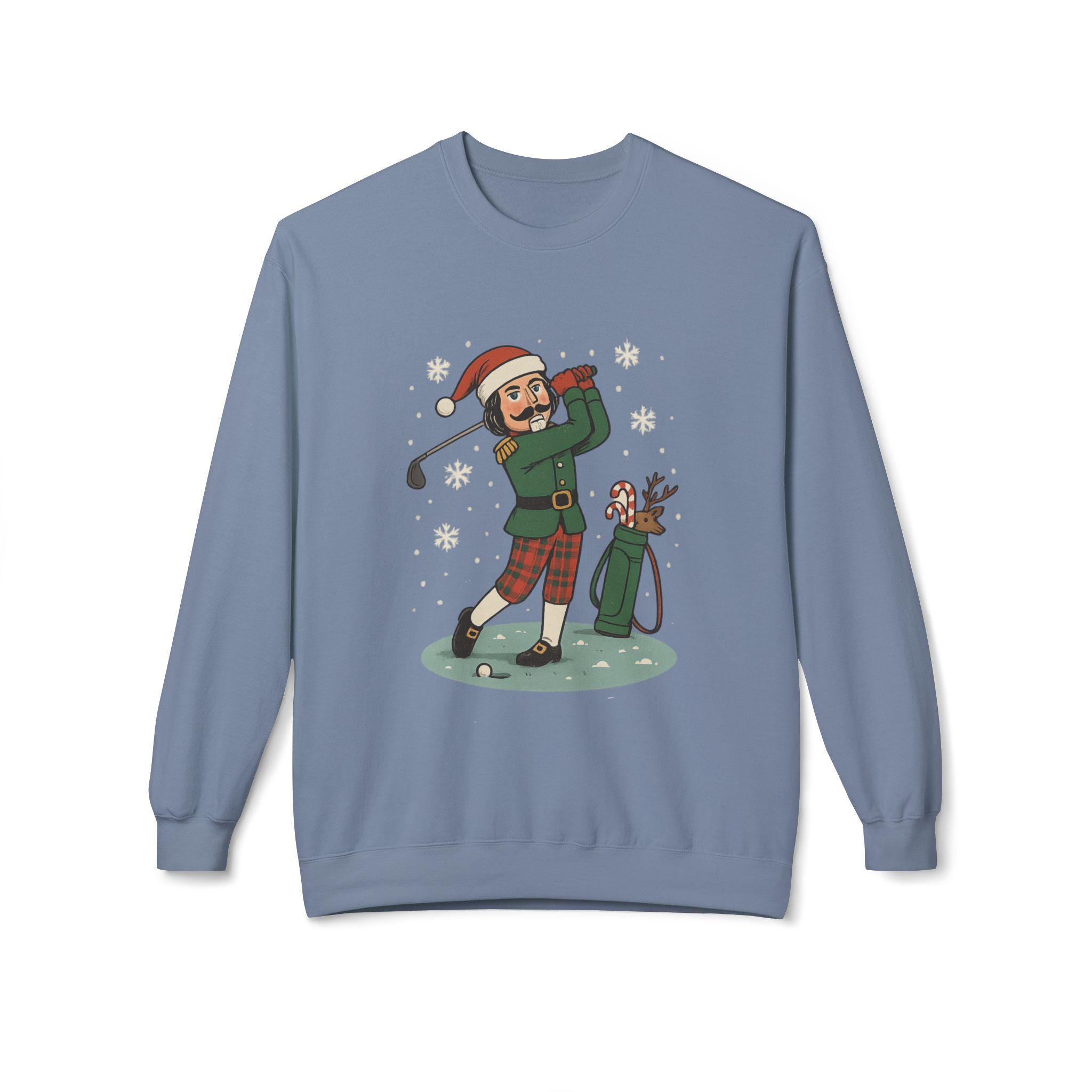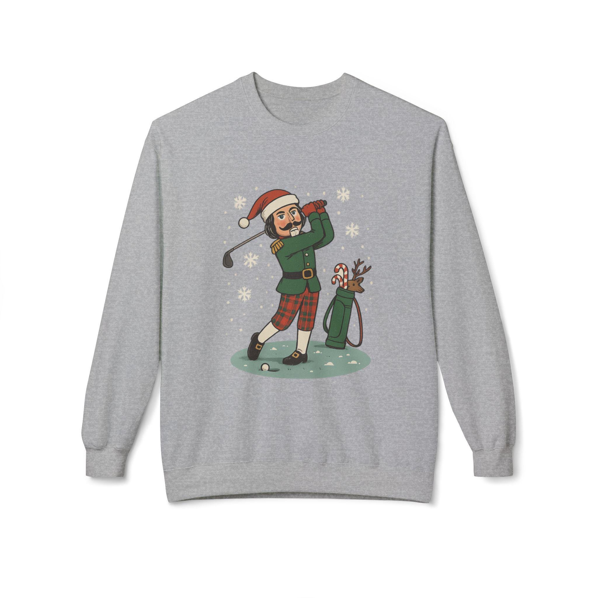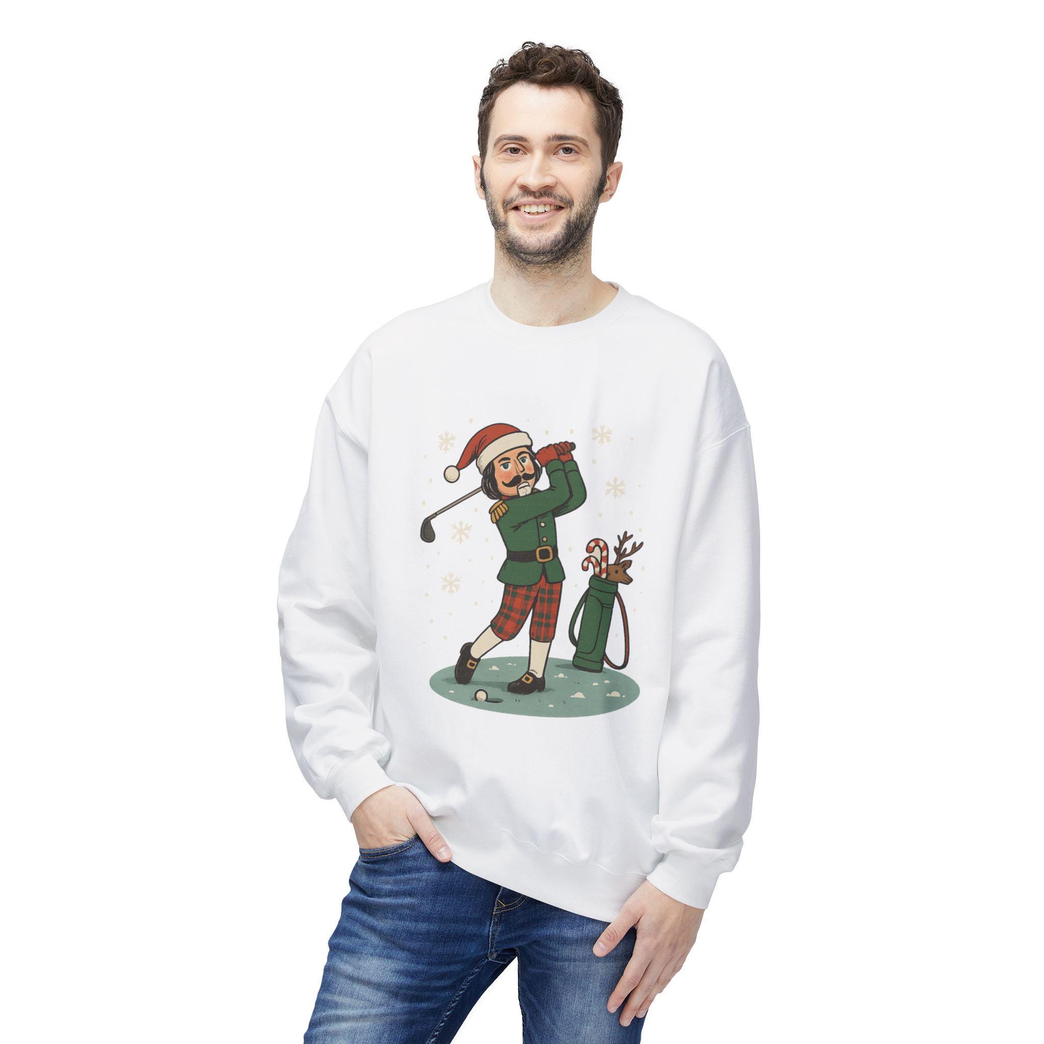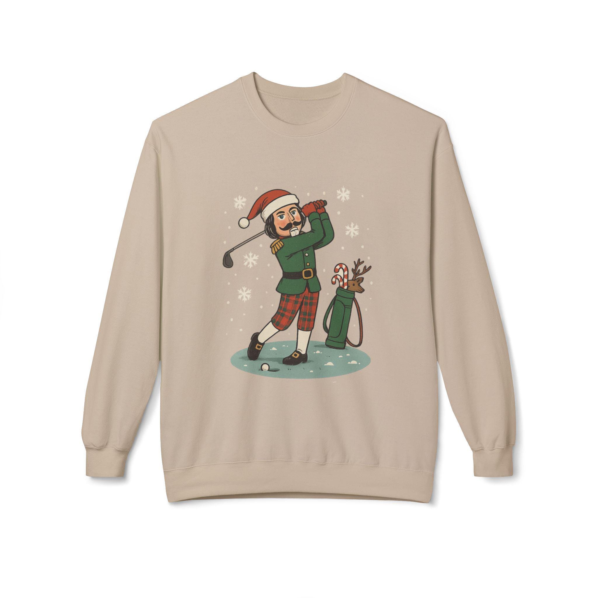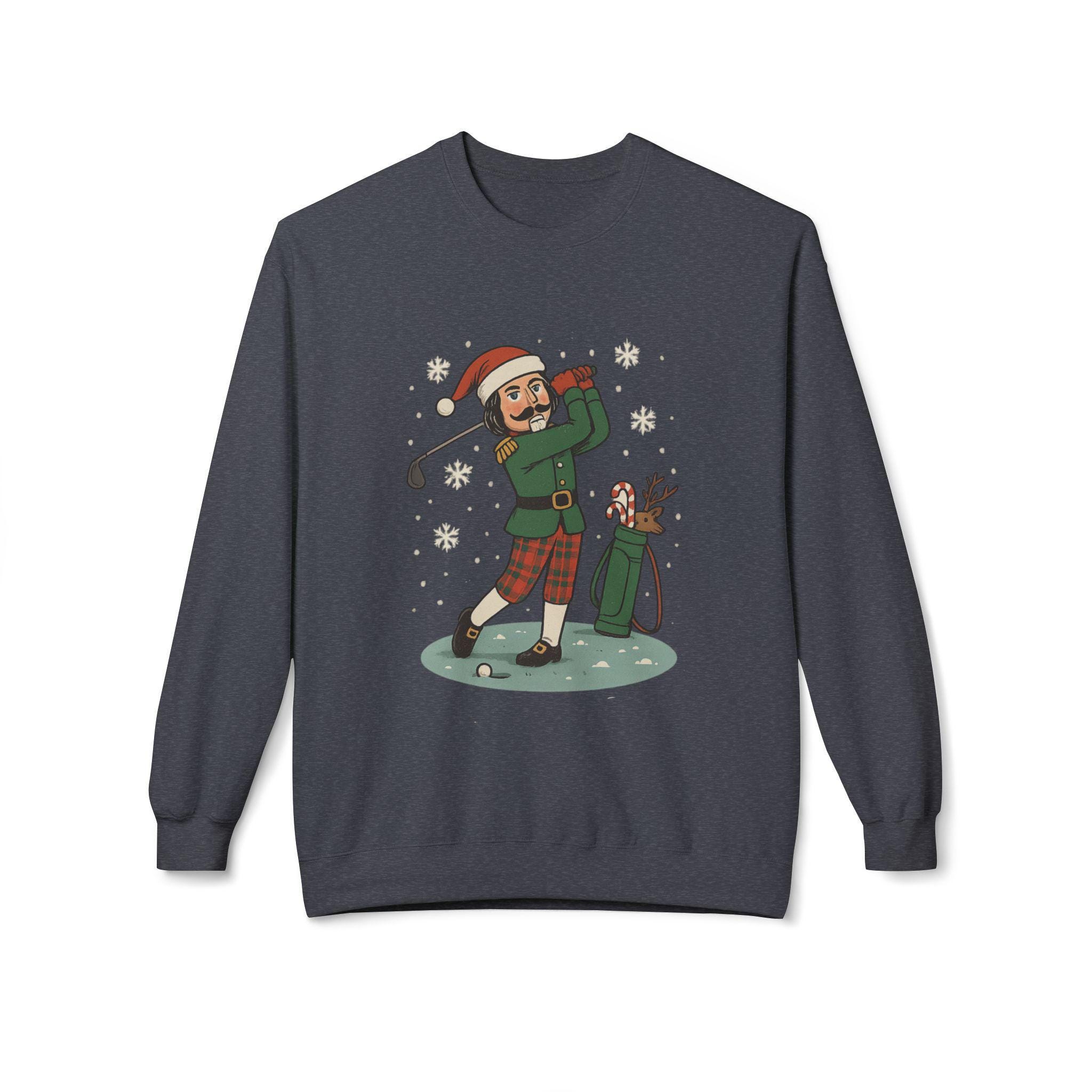 Wrap winter rounds in playful charm. This midweight fleece crewneck features a cozy, classic fit and a cheerful illustration of a holiday golfer in tartan pants — a warm nod to those who mix fairways with festive spirit. The dropped shoulders and ribbed cuffs create a relaxed silhouette that layers easily over shirts or thermals. Soft ring‑spun cotton with a polyester blend gives it that lived‑in warmth while holding its shape; tubular knitting keeps seams clean and comfortable against the skin. Wear it to casual club gatherings, after-a-round warmups, or low-key holiday parties where comfort meets lighthearted golf pride.