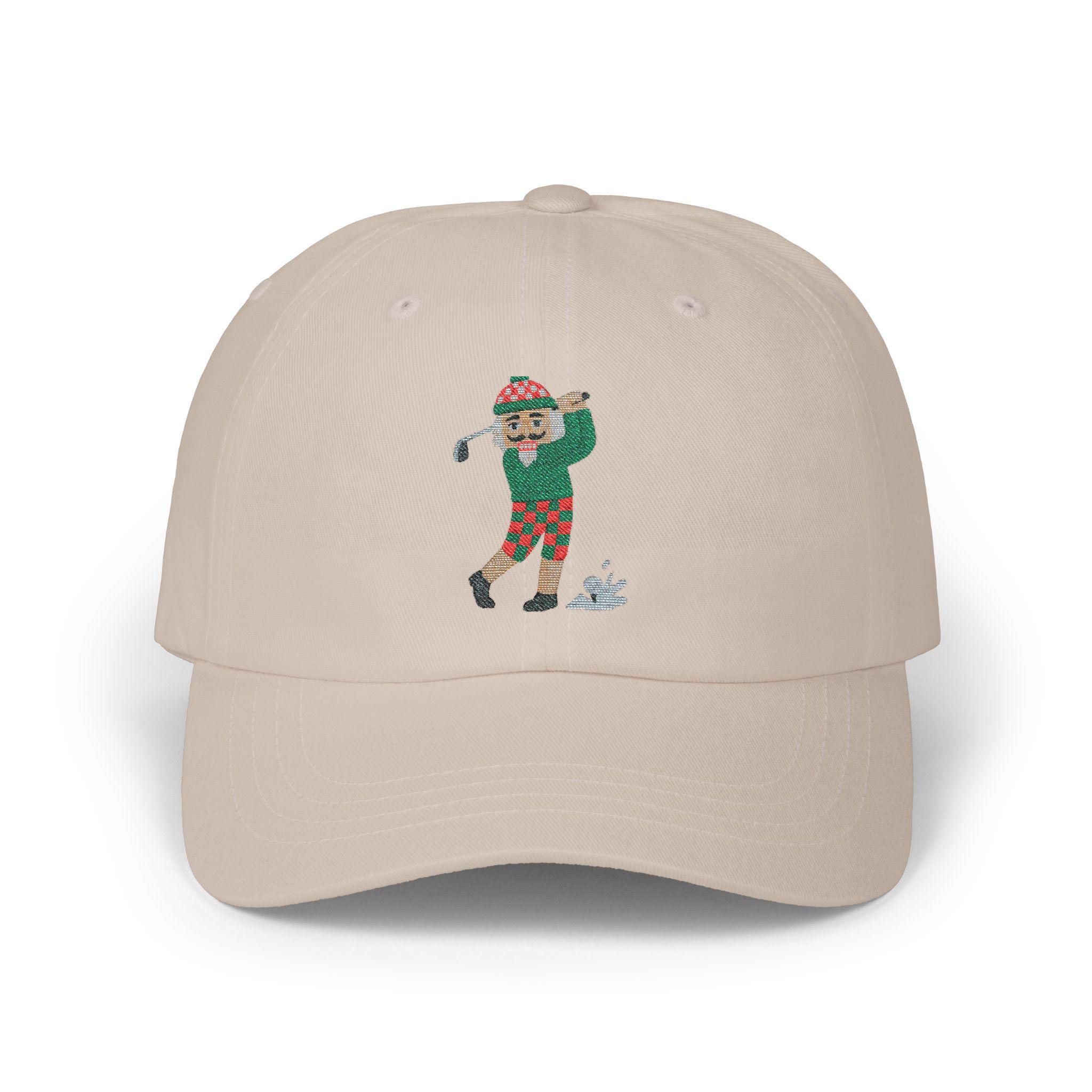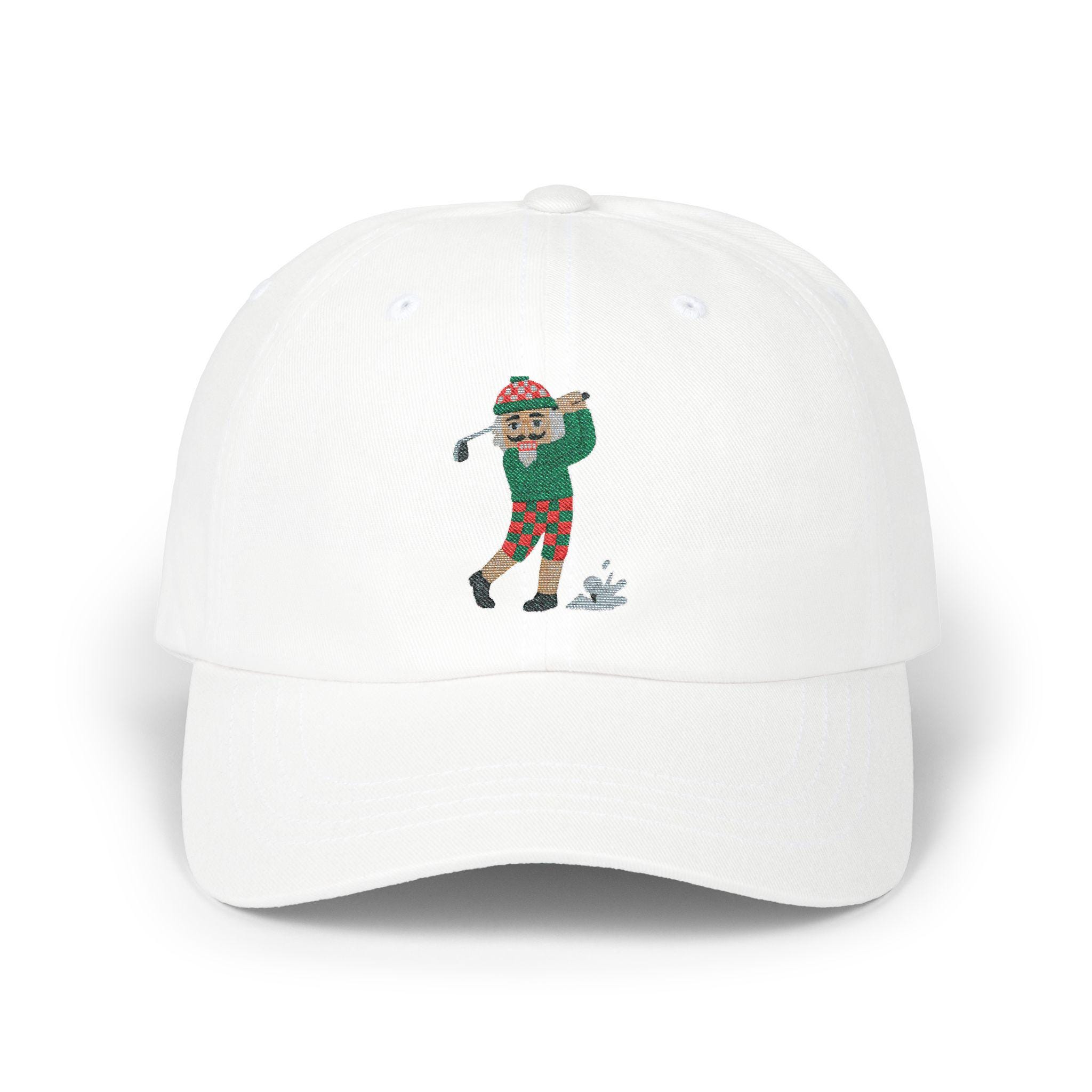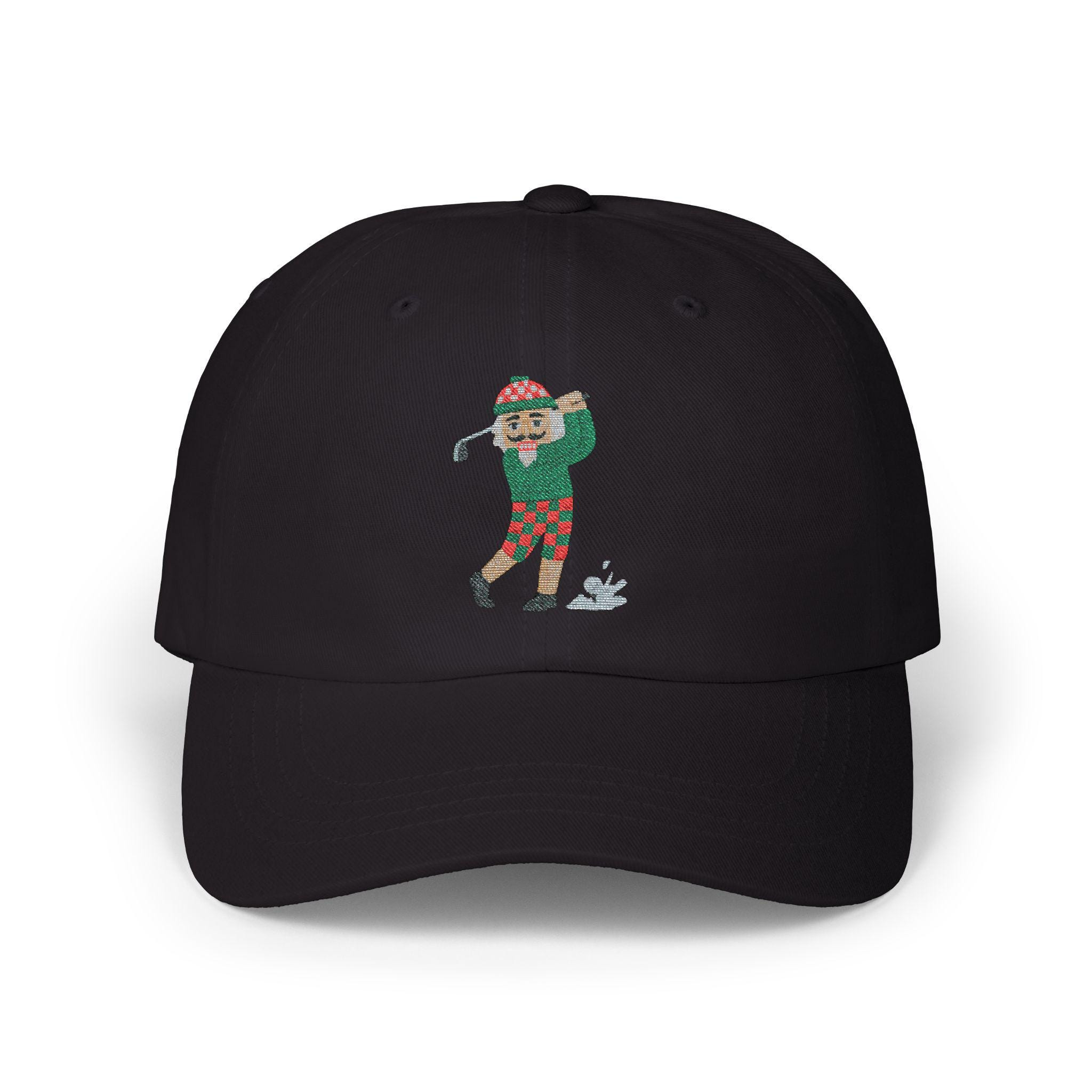 This Golfing Nutcraker Dad Cap features a Christmas golfer holiday sweater design, giving off a festive and playful vibe. It is perfect for dads who love golfing and enjoy getting into the holiday spirit. Ideal for Christmas celebrations and winter outings.