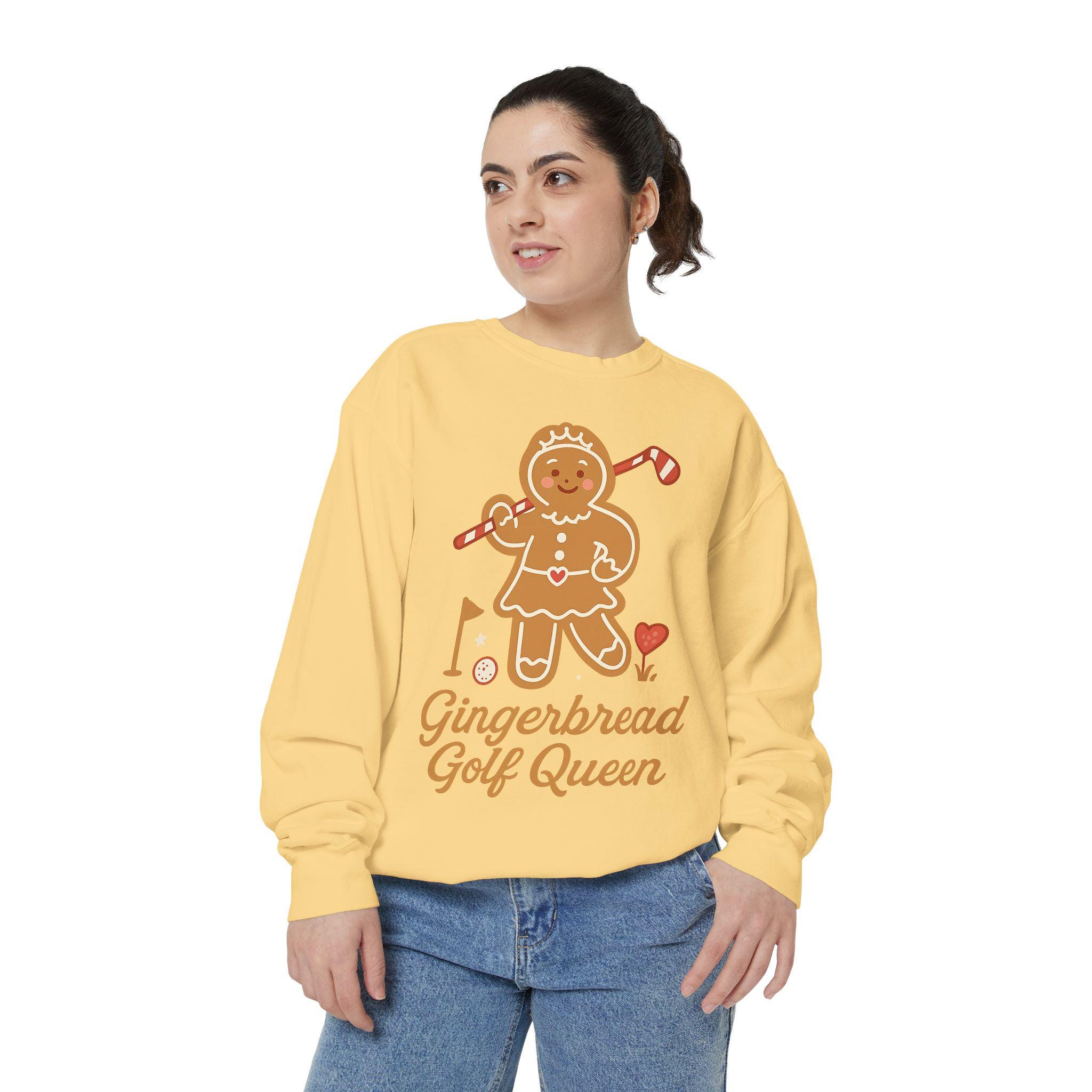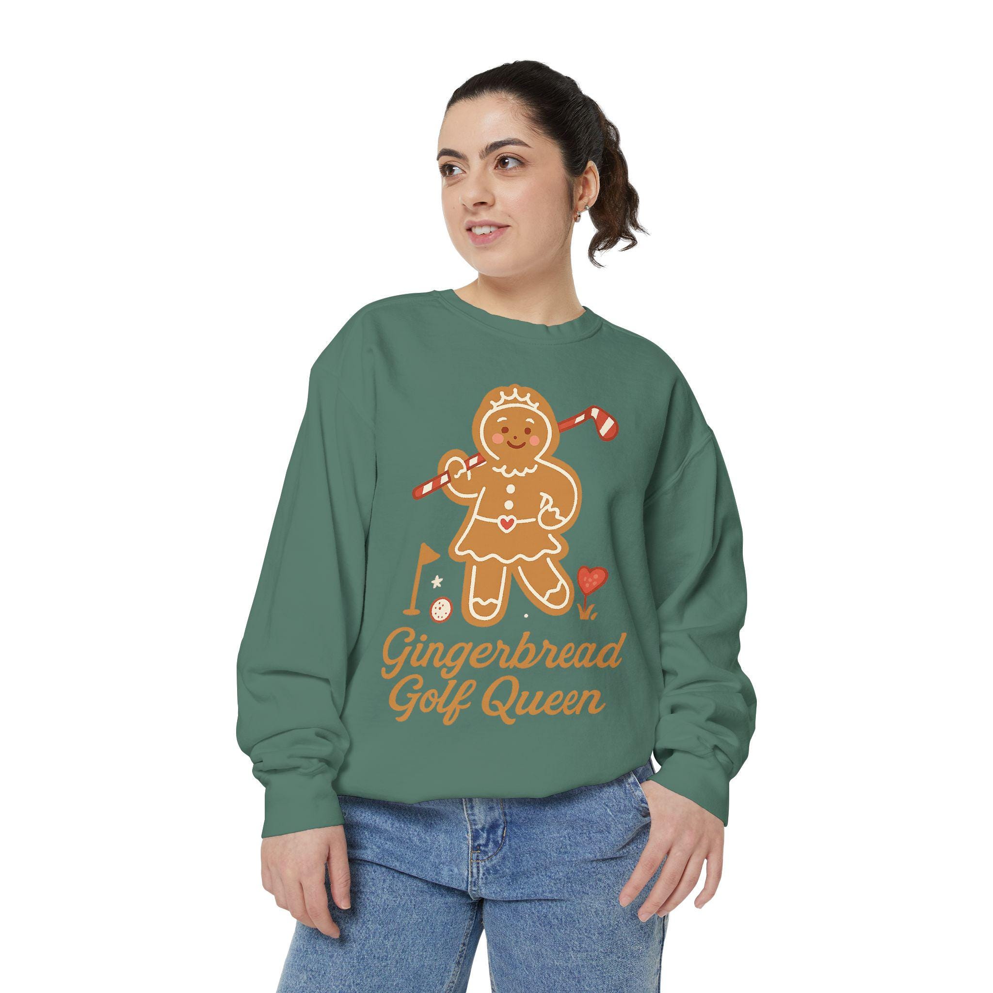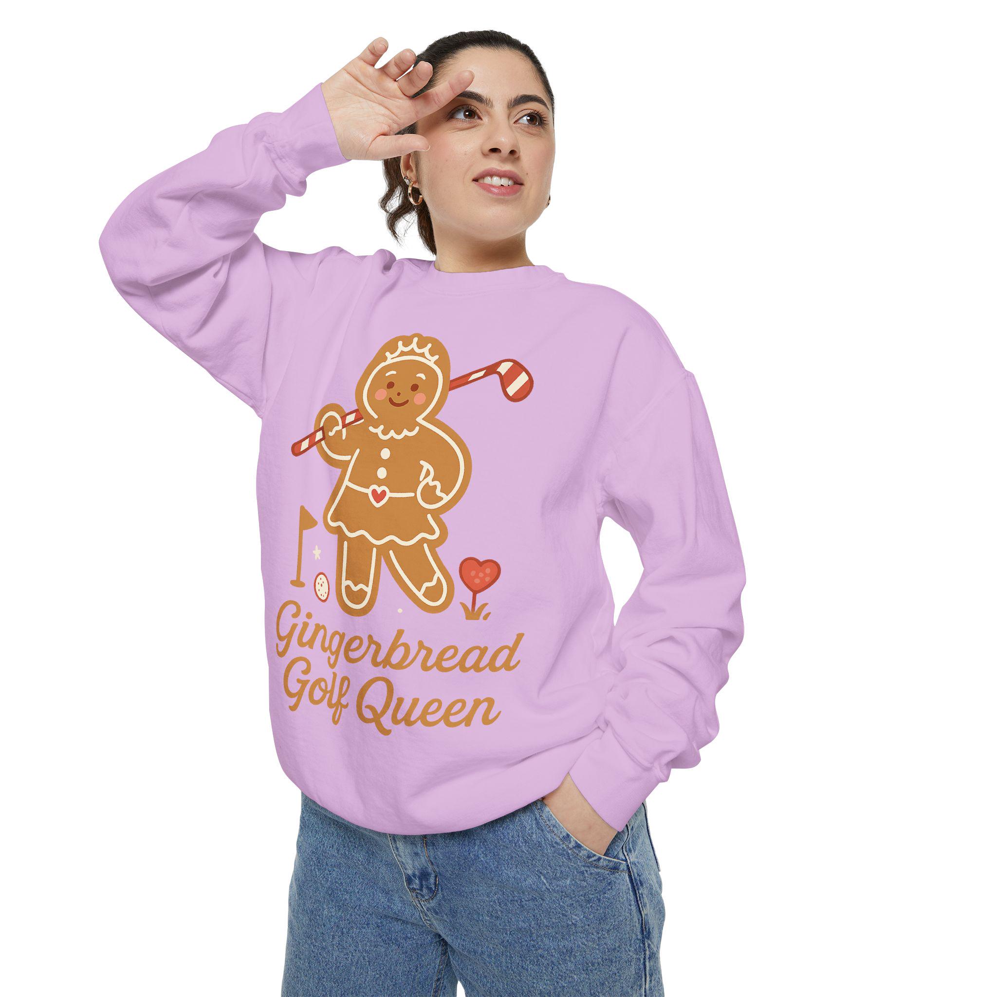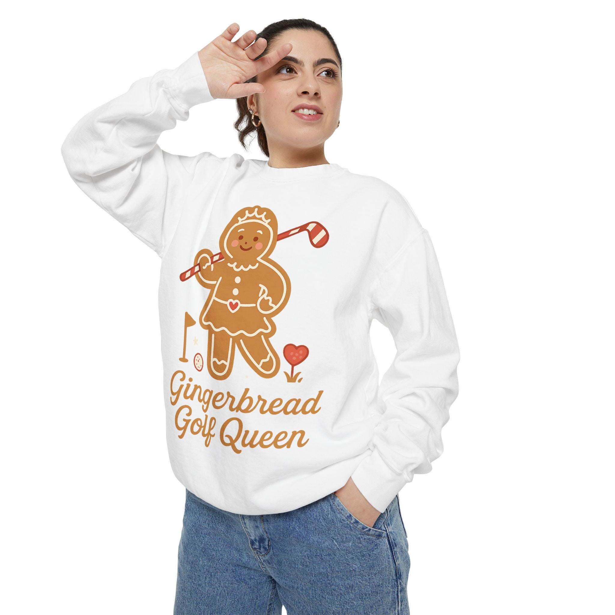 This Gingerbread Golf Queen sweatshirt combines whimsical charm with a touch of holiday spirit. The design features a confident gingerbread woman golfer in mid-swing, wearing a sparkly tiara and holding a peppermint-striped golf club. Perfect for those who love golf and festive vibes, this sweatshirt is ideal for holiday gatherings, golf enthusiasts, and anyone who enjoys a unique and playful style. It's a cozy and stylish option to wear during the holiday season or any time you want to add a touch of fun to your wardrobe.