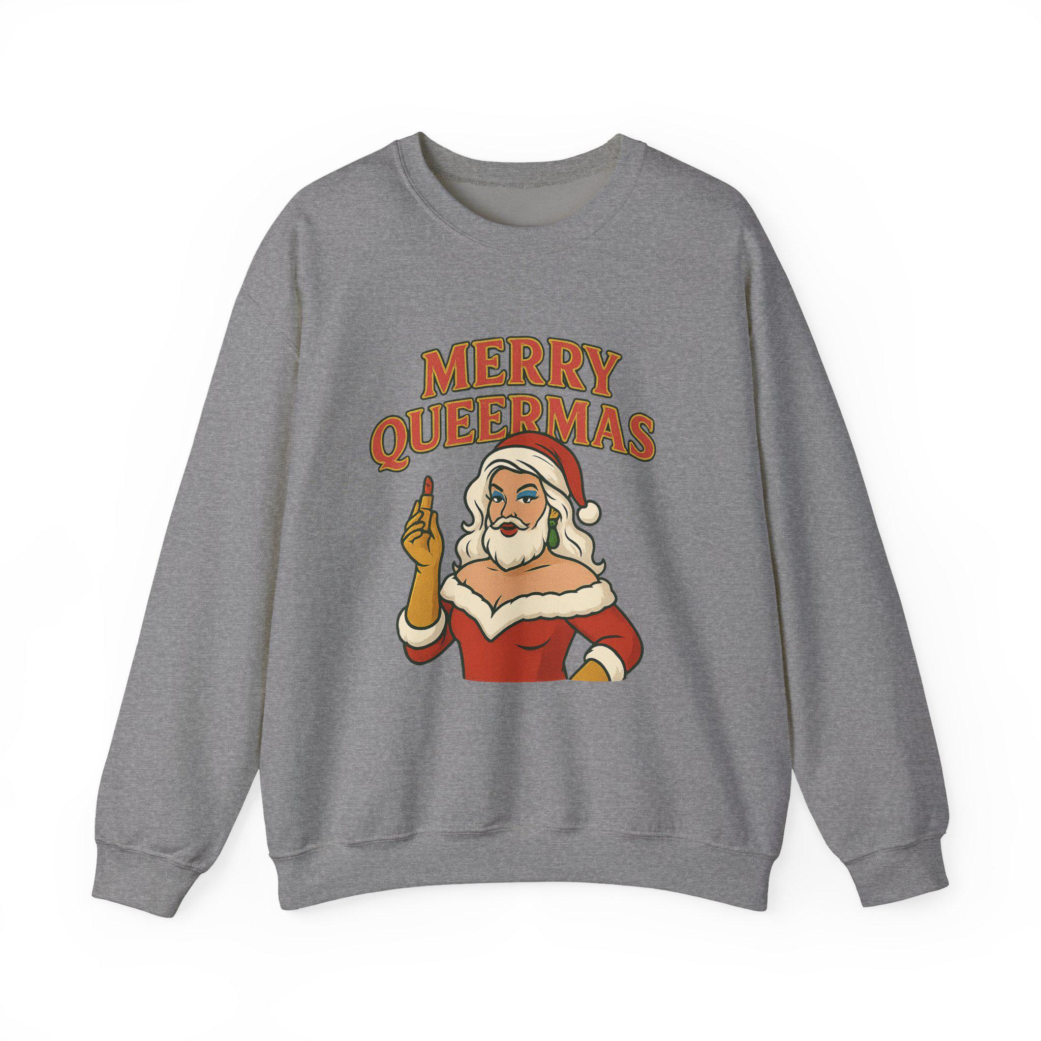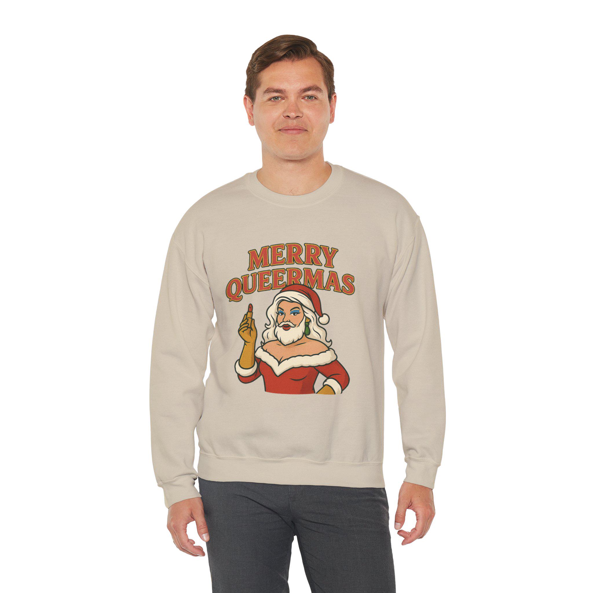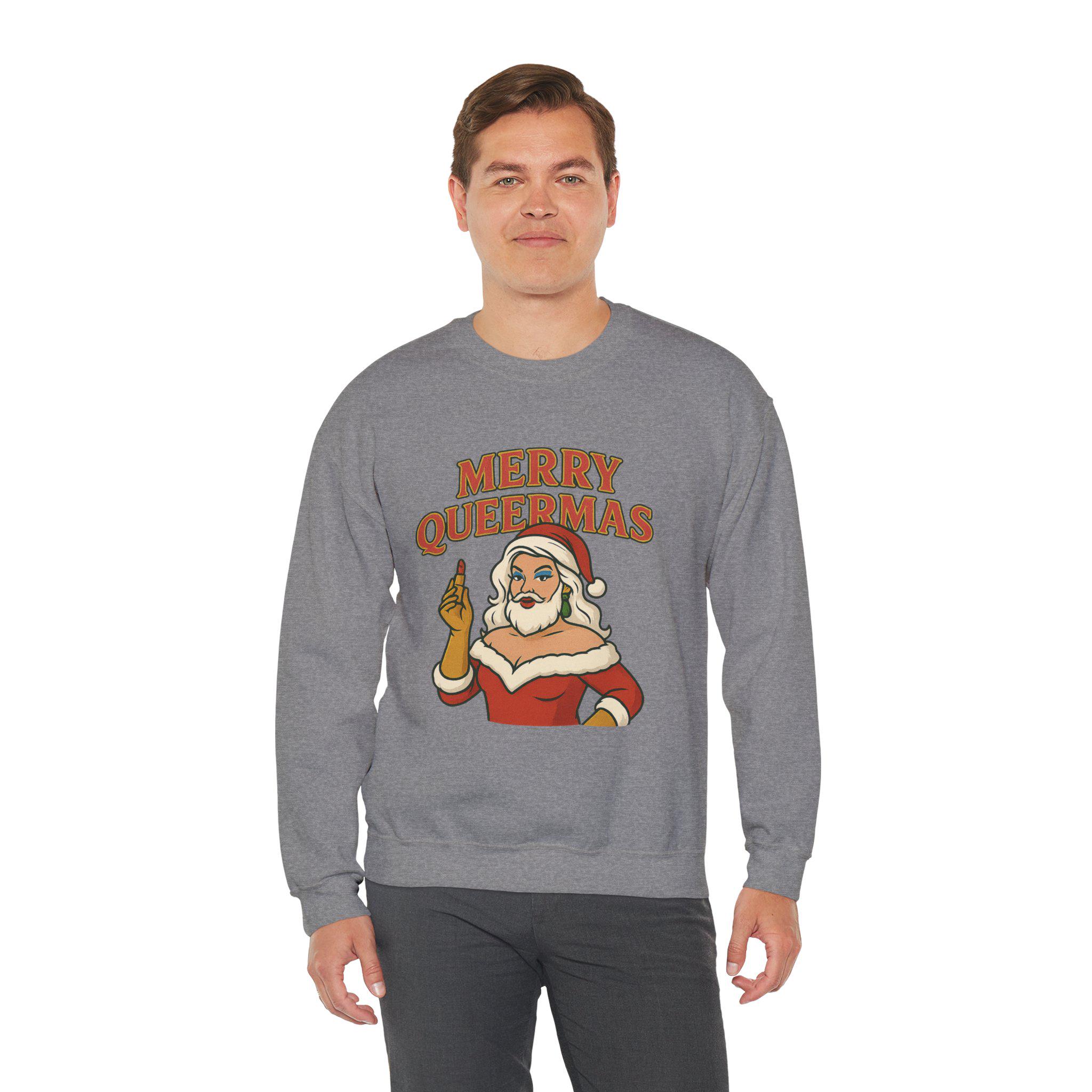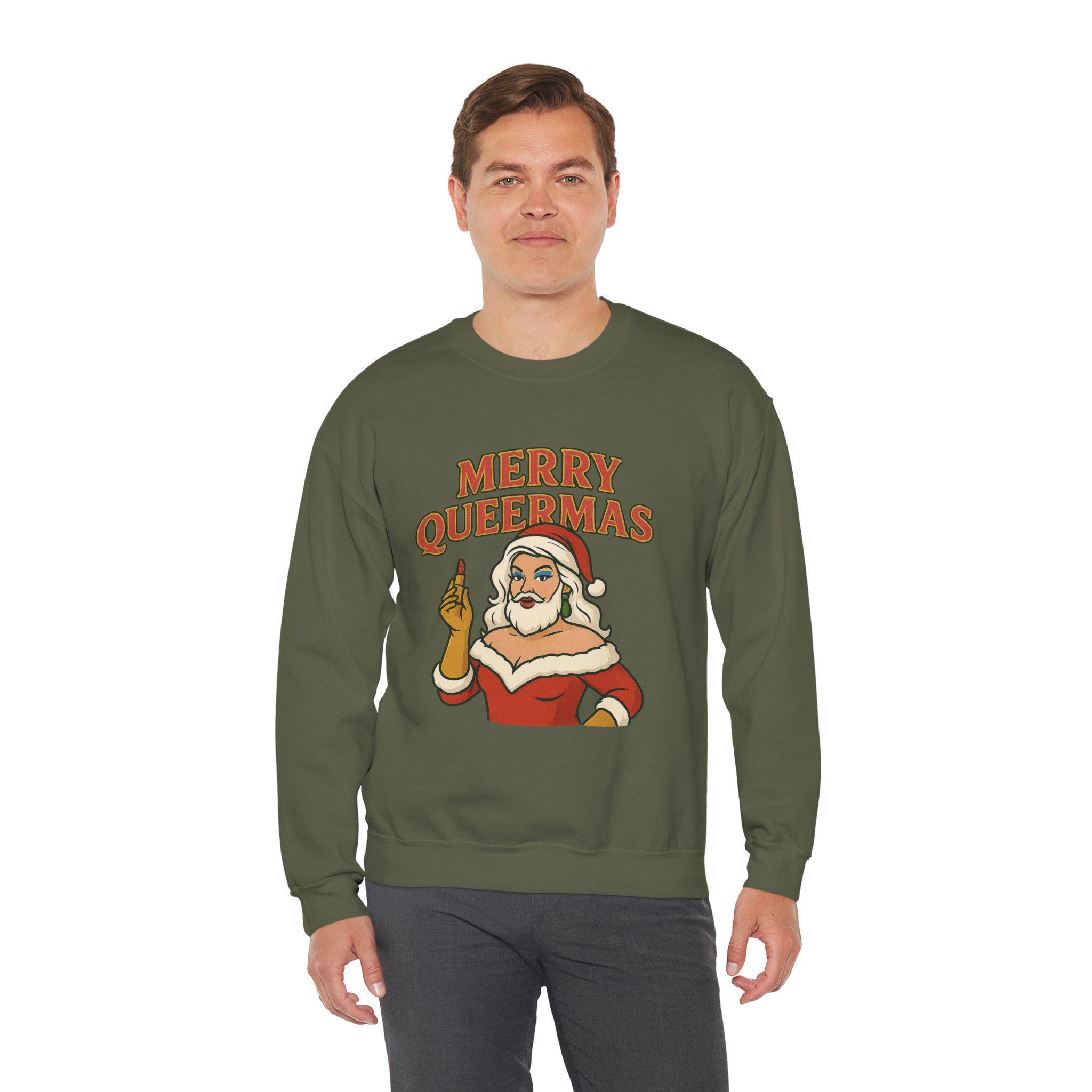 Soft, roomy, and built to last — this crewneck brings holiday attitude with a wink. The midweight cotton-poly blend feels cozy on cool nights, while the classic crew silhouette and durable double-needle stitching keep the shape through repeated wear. Front artwork shows a sassy Santa-like figure and bold lettering that reads “Merry Queermass,” a playful, proud take on seasonal cheer that lands like a warm hug from chosen family. Wear it to queer-friendly caroling, a low-key holiday party, or when you want your winter outfit to say something joyful and unapologetic. Subtle details — like the tear-away label and quality prints — keep comfort front and center, and embroidery or printed neck/wrist options make it easy to personalize for gatherings or group looks.