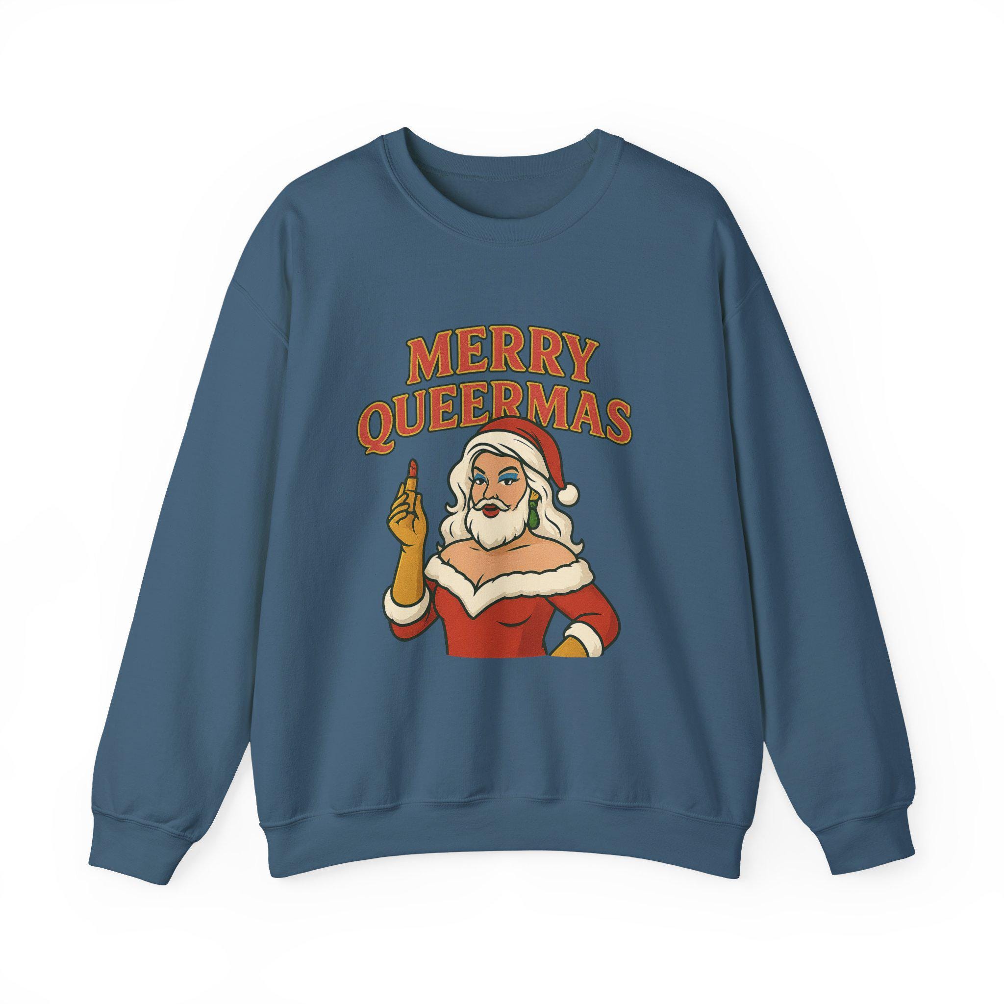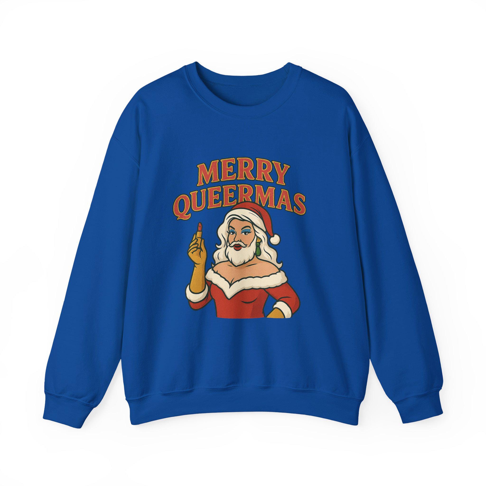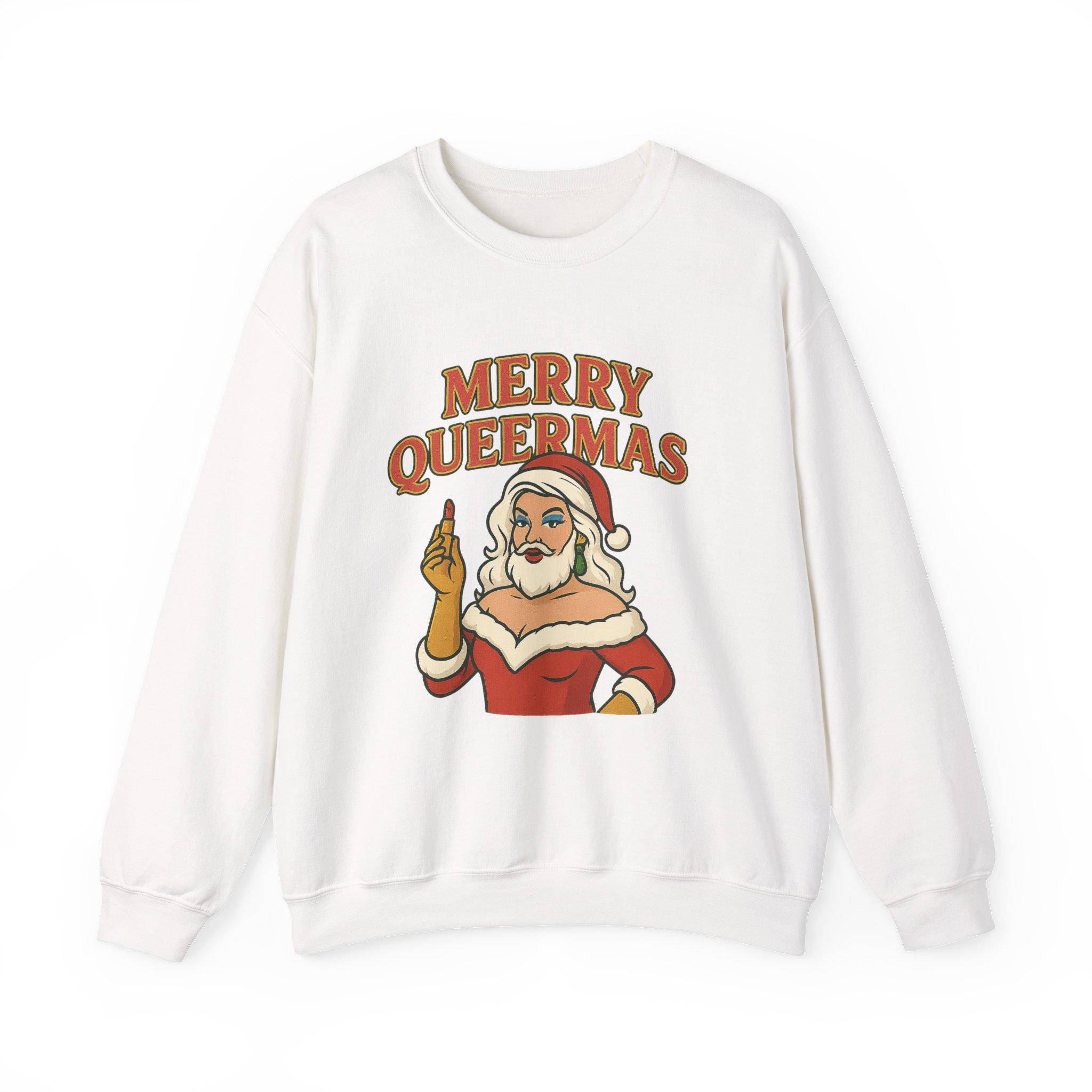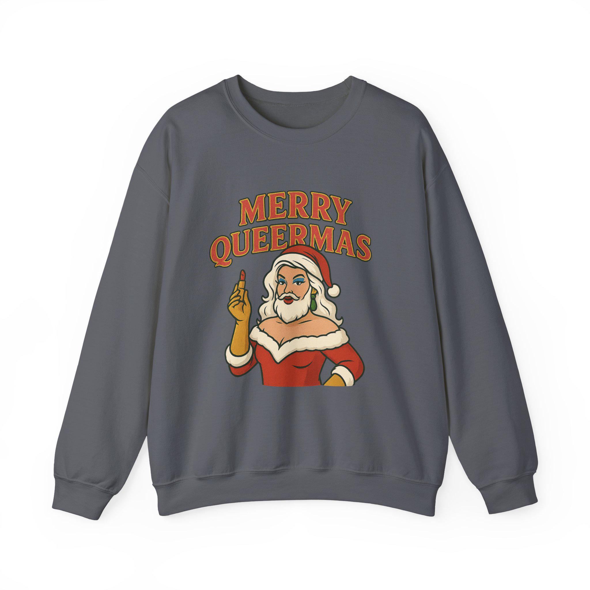 Soft, roomy, and built to last — this crewneck brings holiday attitude with a wink. The midweight cotton-poly blend feels cozy on cool nights, while the classic crew silhouette and durable double-needle stitching keep the shape through repeated wear. Front artwork shows a sassy Santa-like figure and bold lettering that reads “Merry Queermass,” a playful, proud take on seasonal cheer that lands like a warm hug from chosen family. Wear it to queer-friendly caroling, a low-key holiday party, or when you want your winter outfit to say something joyful and unapologetic. Subtle details — like the tear-away label and quality prints — keep comfort front and center, and embroidery or printed neck/wrist options make it easy to personalize for gatherings or group looks.