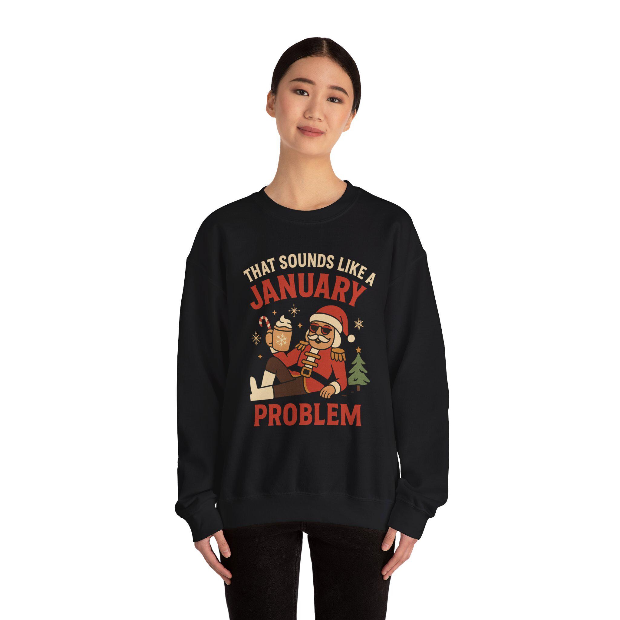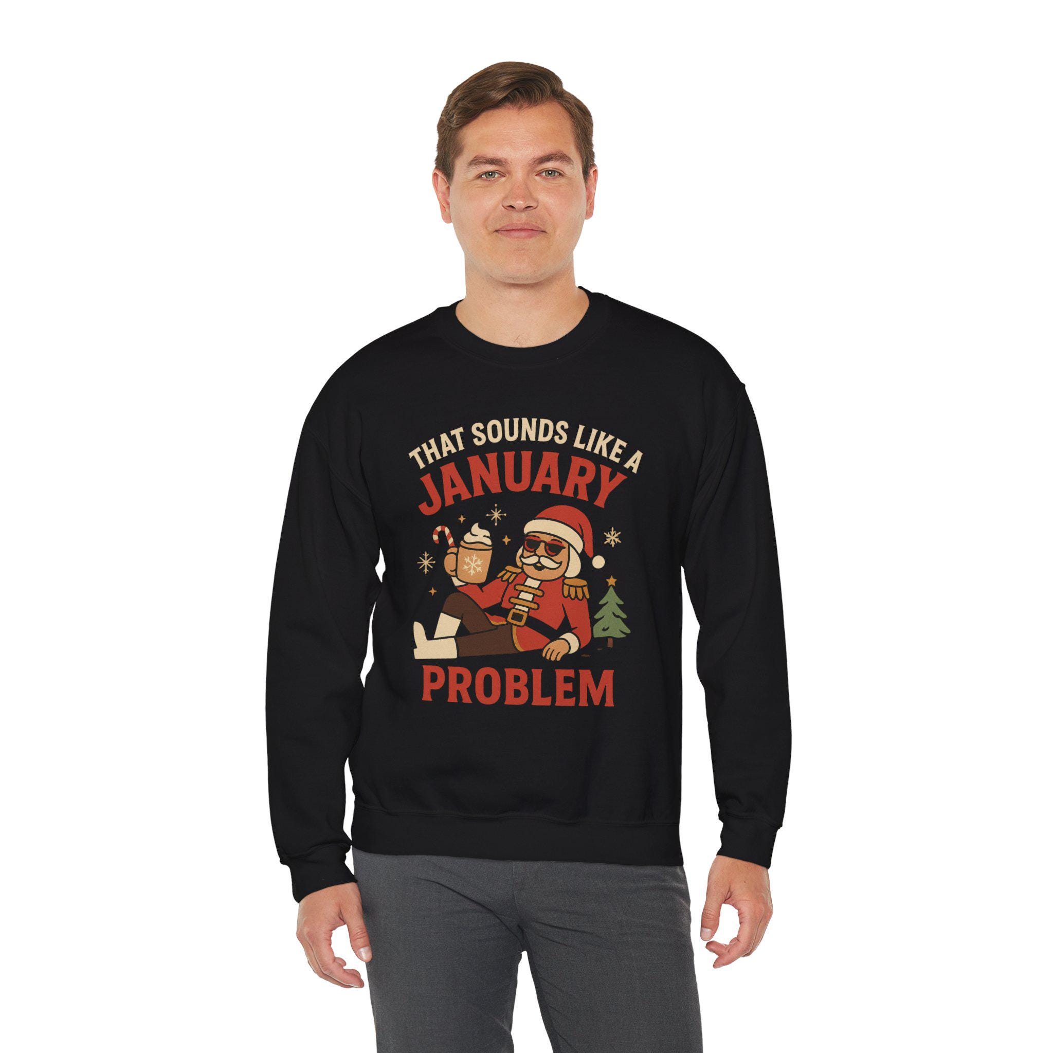 Wrap yourself in easygoing winter humor with this midweight crewneck. The soft 50/50 cotton-poly blend and classic fit hold shape while keeping the feel familiar and cozy. On the front, a playful retro-style illustration and bold lettering read “That Sounds Like a January Problem,” pairing a laid-back holiday attitude with whimsical seasonal motifs. Wear it on slow mornings, post-holiday errands, or evenings by the tree — it layers smoothly under a coat or over a tee and keeps the mood light when the calendar flips.