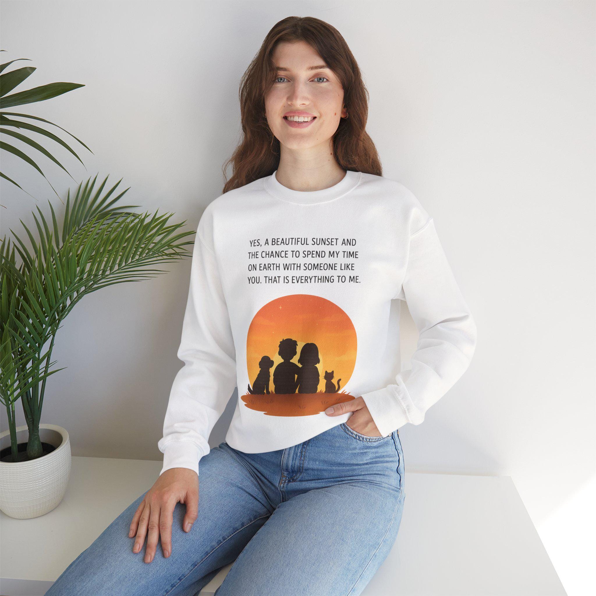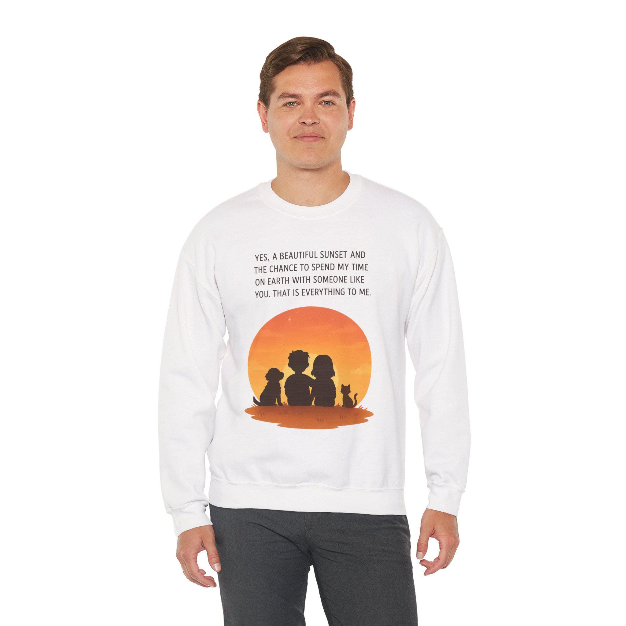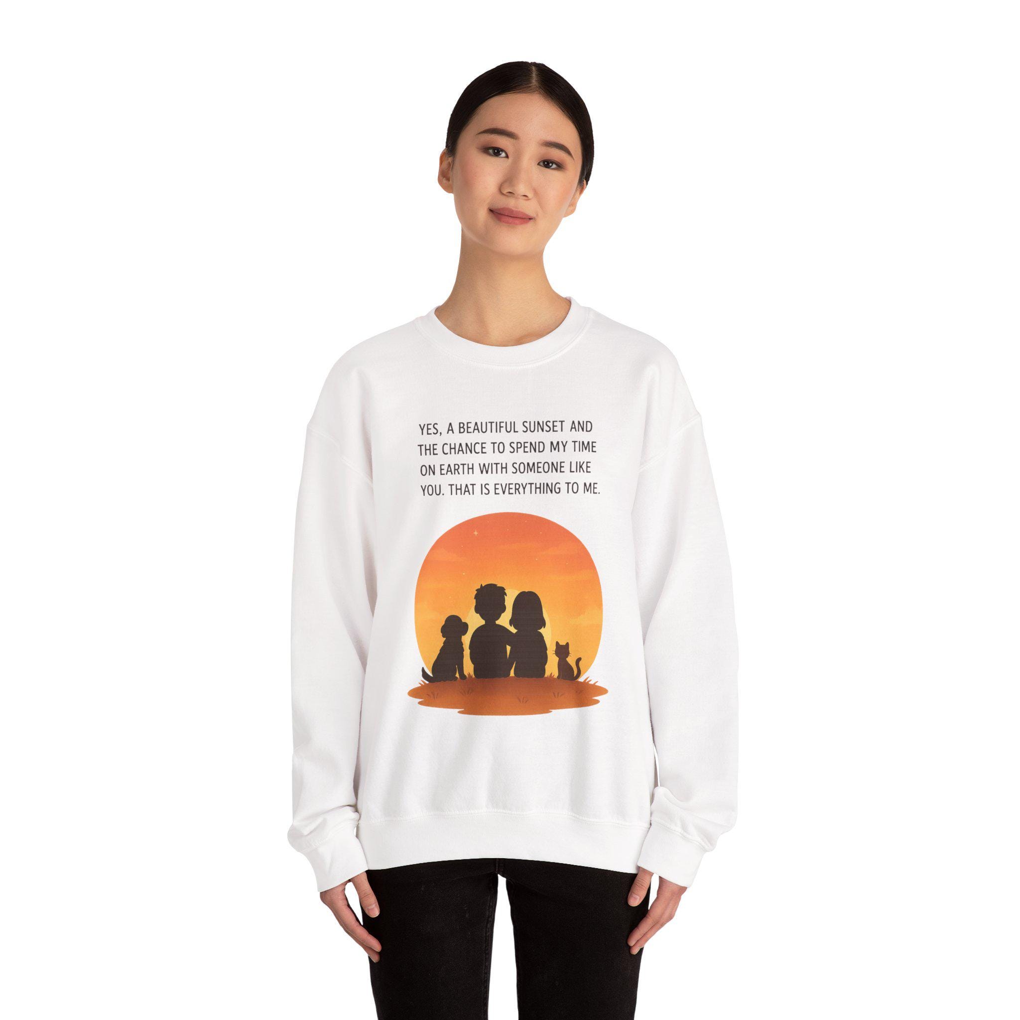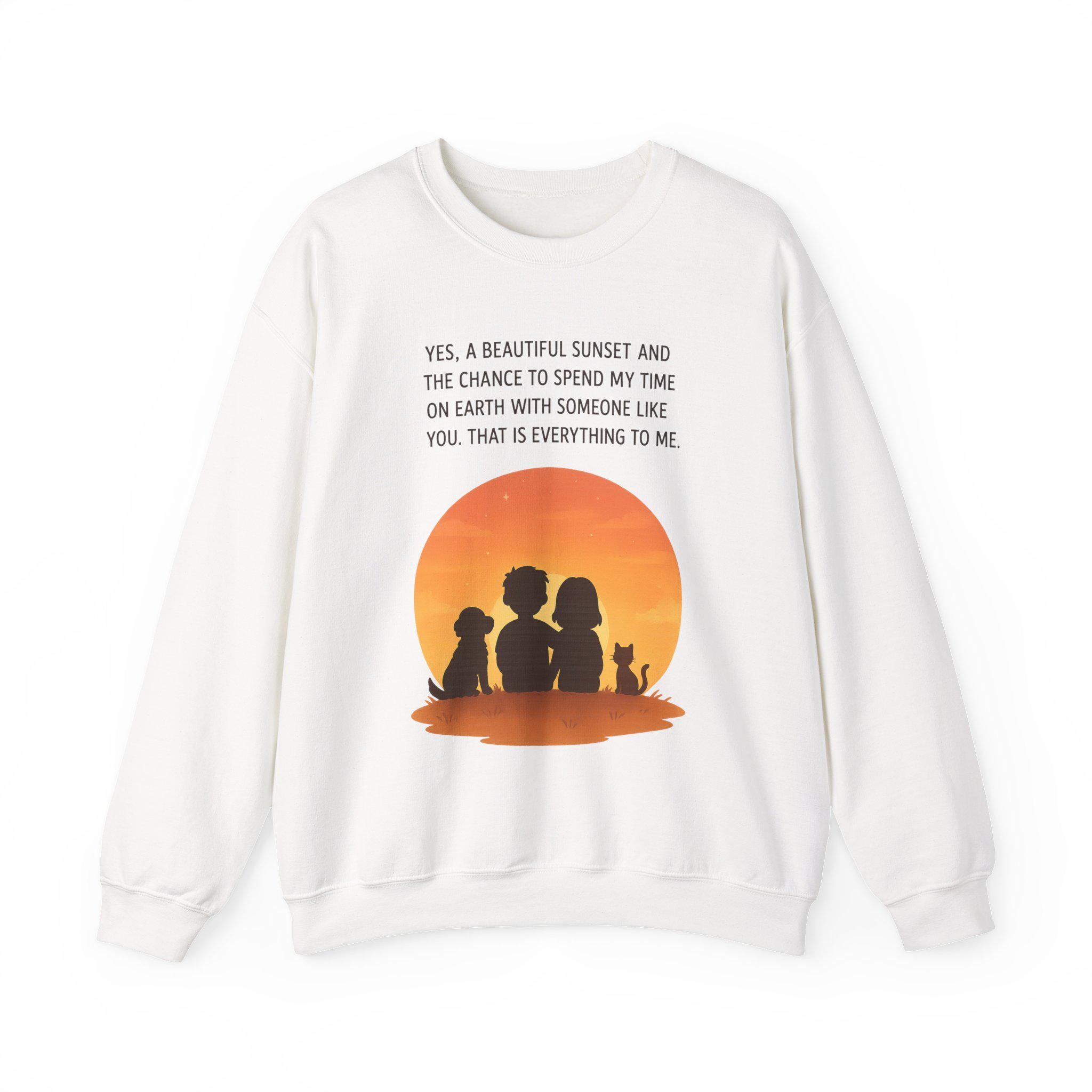 Soft, warm, and quietly sentimental — this crewneck wraps you in a gentle sunset moment. The simple white sweatshirt features a warm orange sunset graphic with three silhouettes and a small dog, paired with a short, heartfelt line about sharing time with someone special. It feels like an evening on the porch: calm, familiar, and quietly full of meaning. Wear it when you want a low-key layer that carries a little story — cozy for slow walks, coffee runs, or curling up on the couch while you linger over the things that matter.