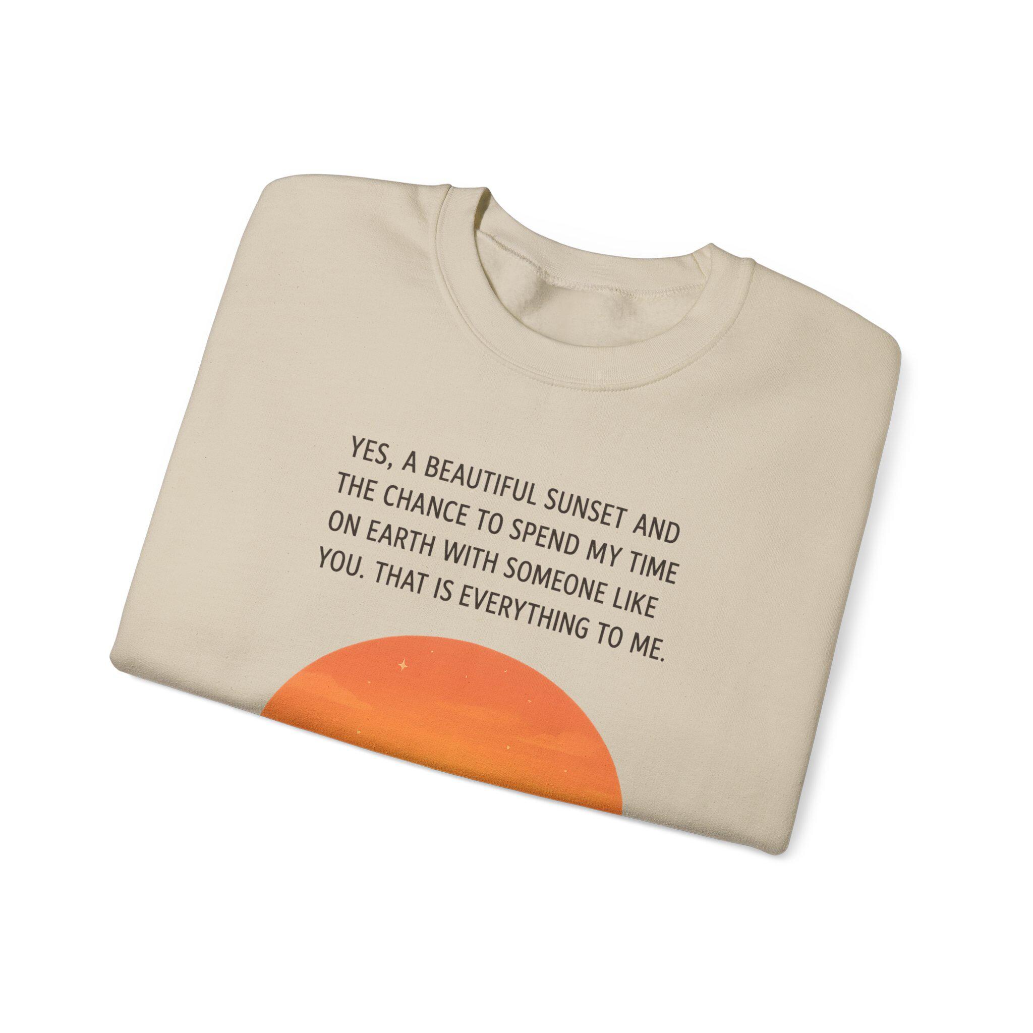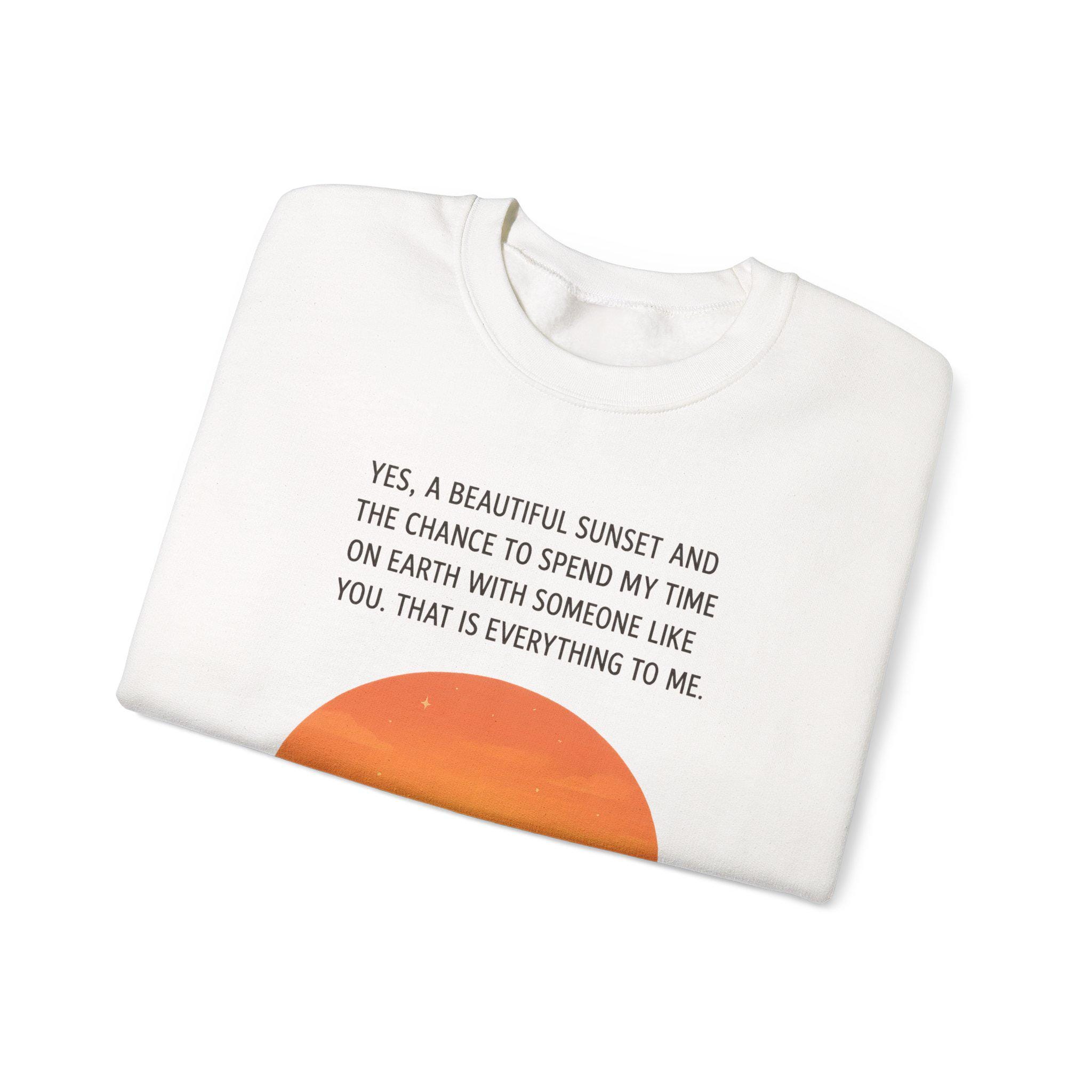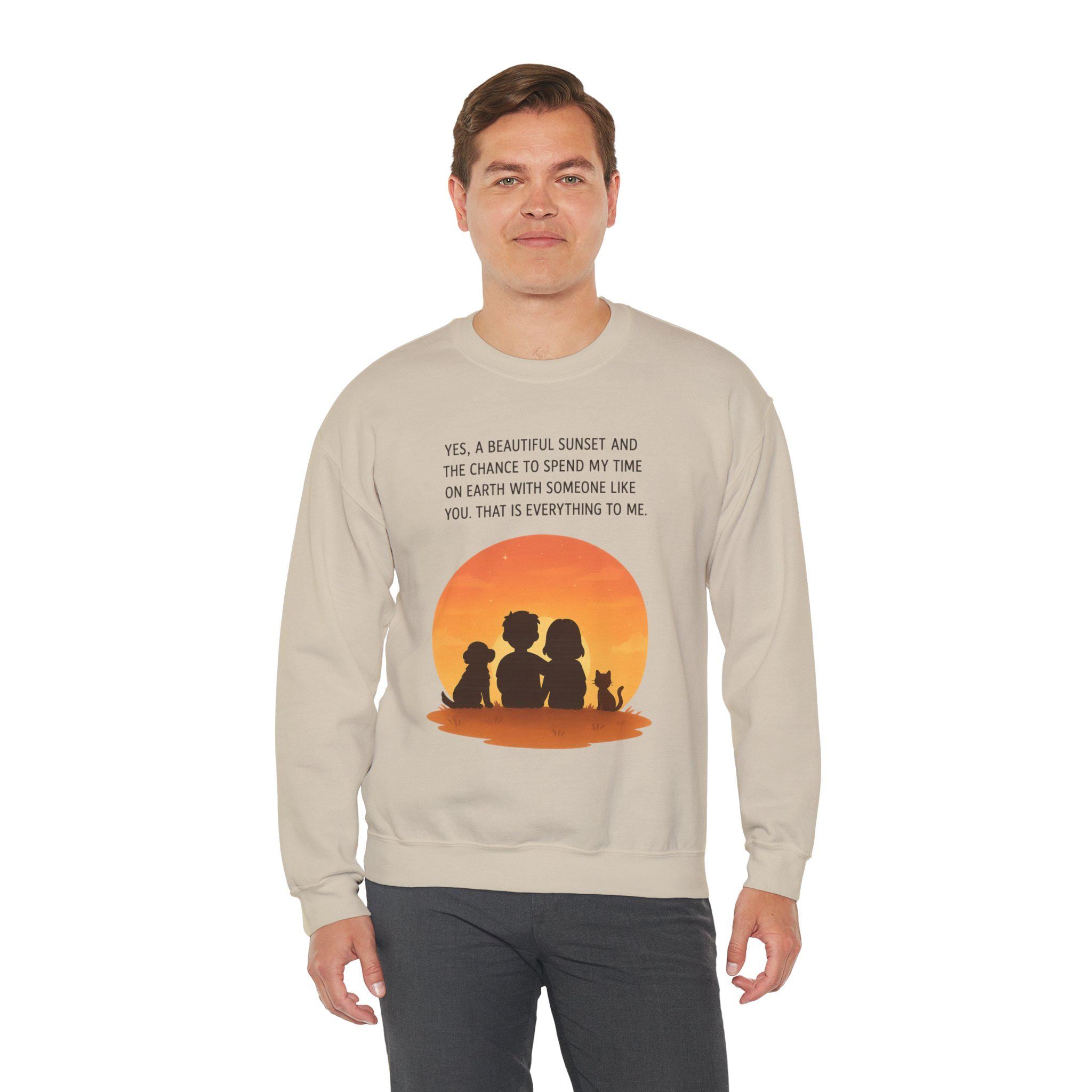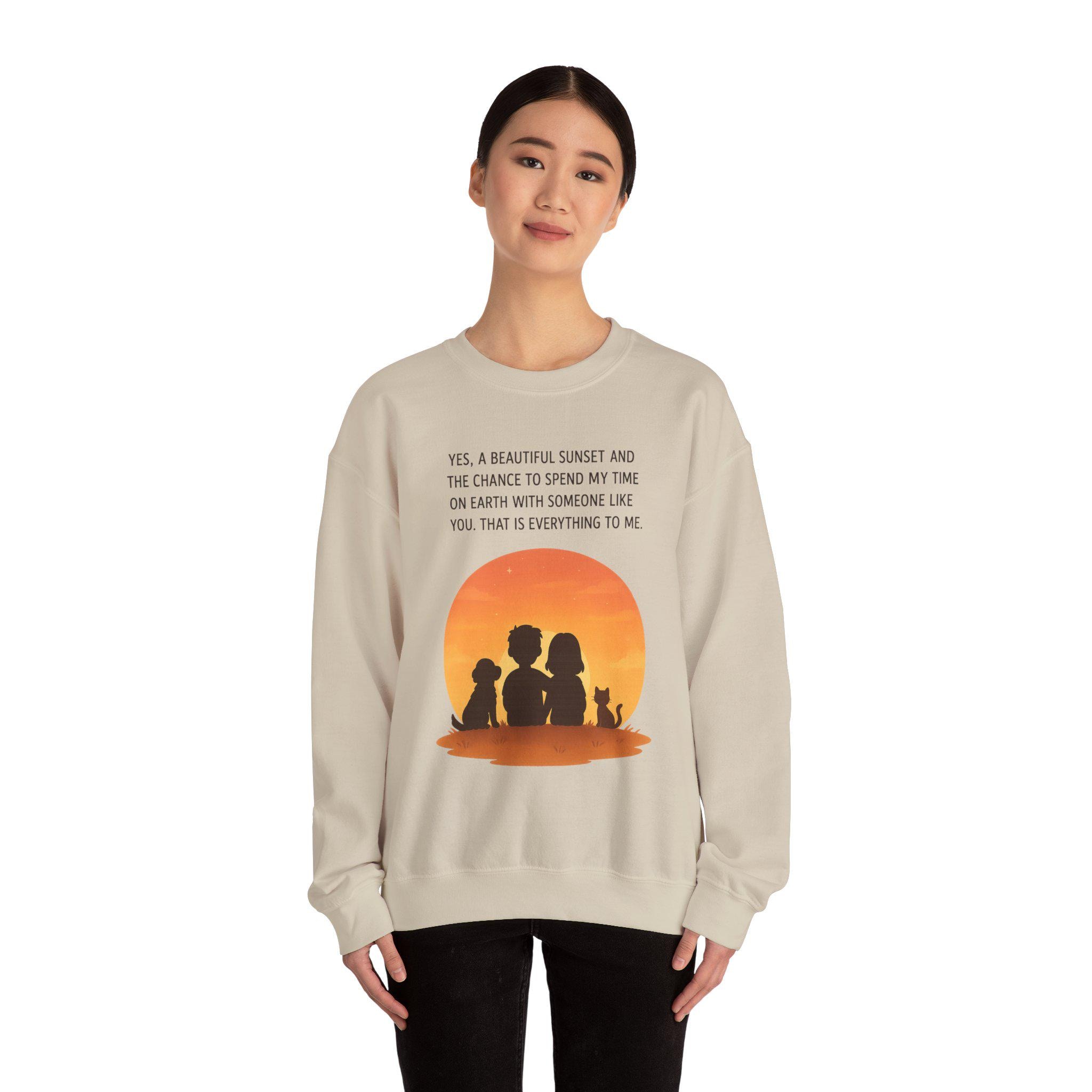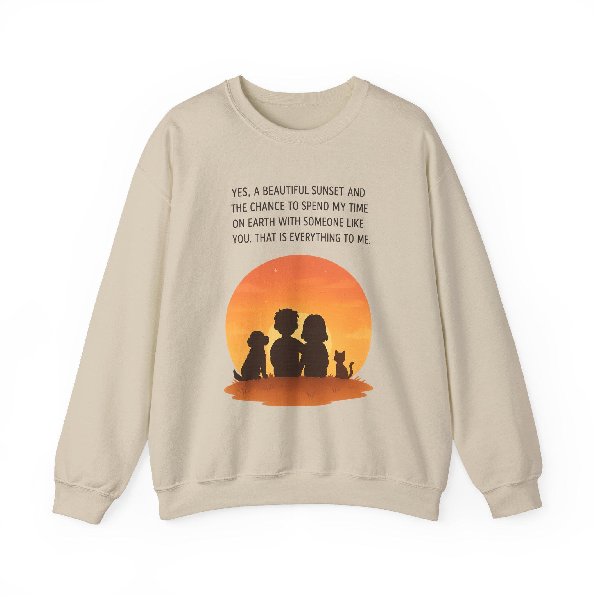 Soft, warm, and quietly sentimental — this crewneck wraps you in a gentle sunset moment. The simple white sweatshirt features a warm orange sunset graphic with three silhouettes and a small dog, paired with a short, heartfelt line about sharing time with someone special. It feels like an evening on the porch: calm, familiar, and quietly full of meaning. Wear it when you want a low-key layer that carries a little story — cozy for slow walks, coffee runs, or curling up on the couch while you linger over the things that matter.