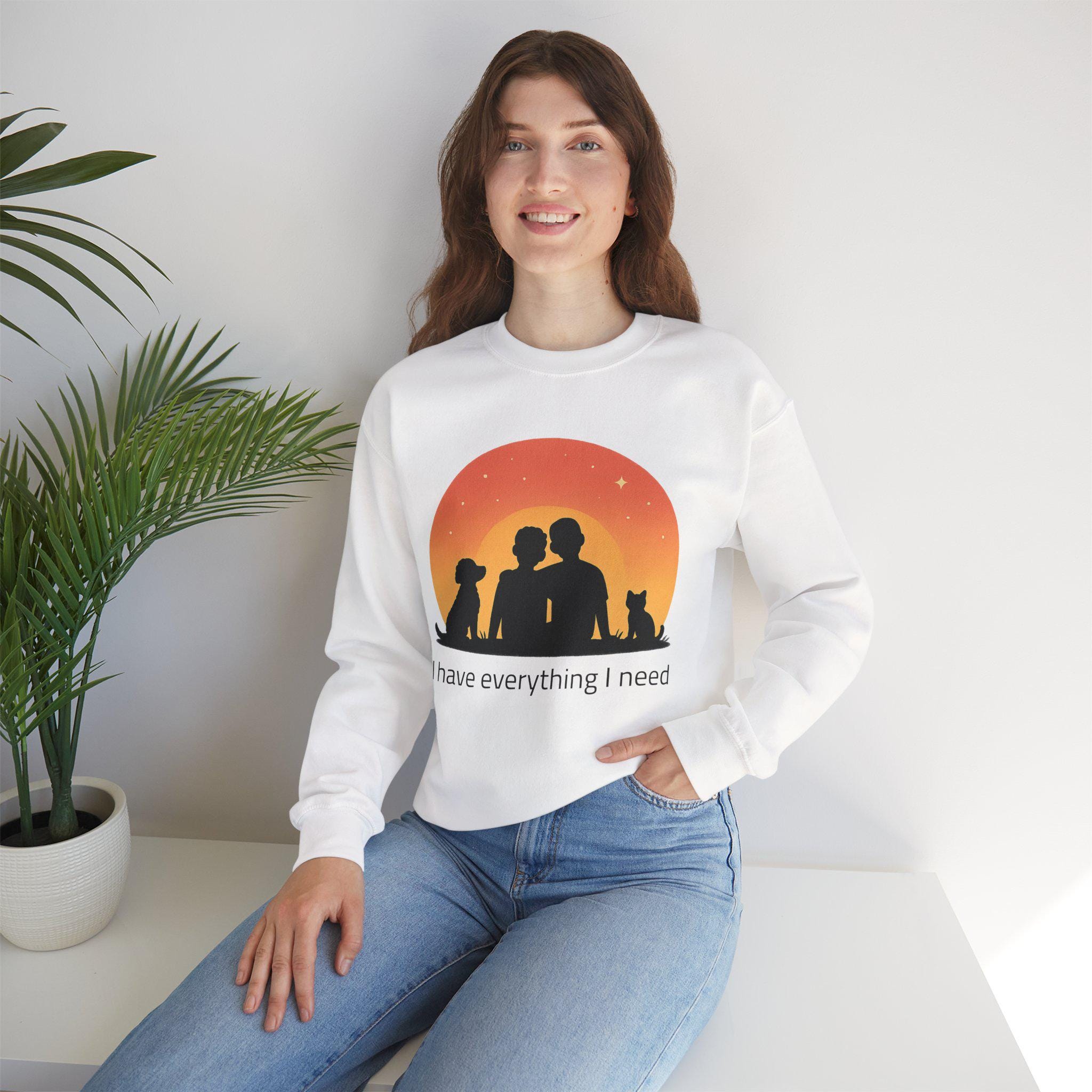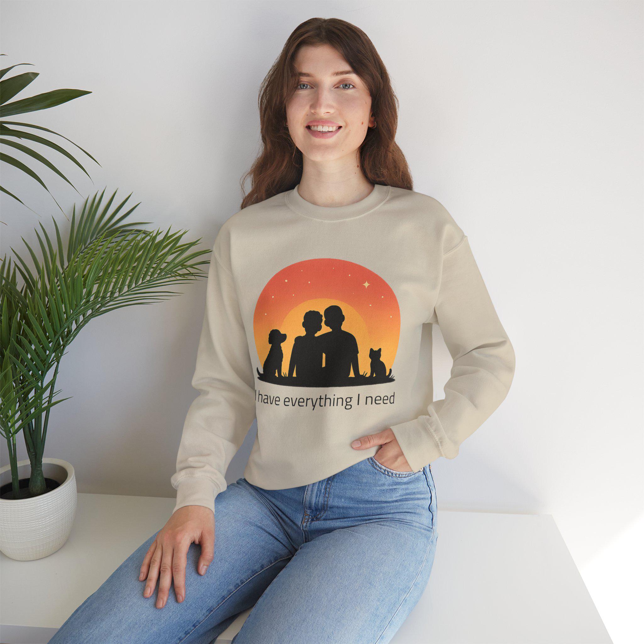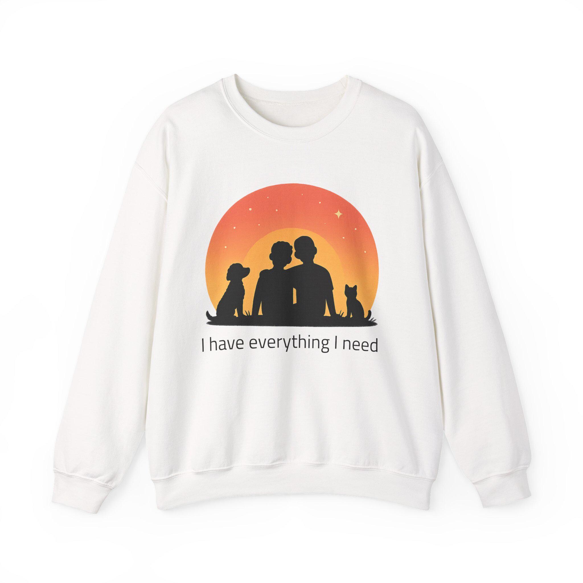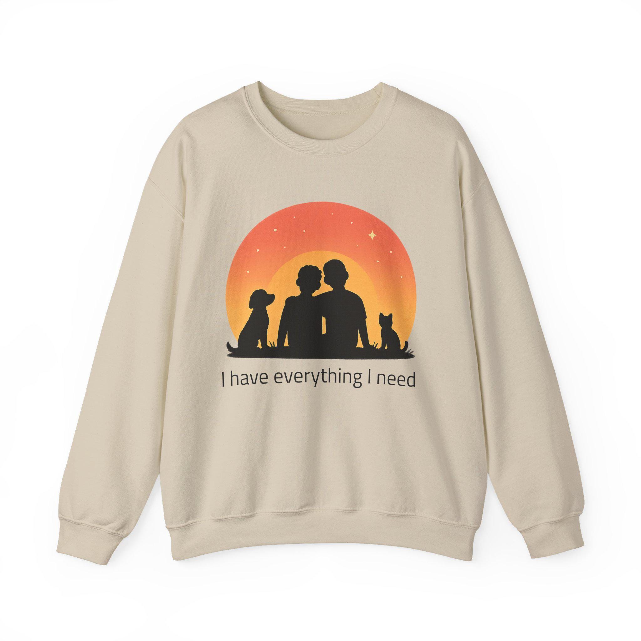 A warm, everyday crewneck that reads like a quiet, honest declaration of home. This sweatshirt shows a lovingly embroidered scene: two men standing close, a mellow dog at their feet and a content cat curled nearby. It carries a calm confidence—no loud slogans, just a gentle reminder that their little family is complete. The medium-weight cotton-poly blend feels substantial without being stiff; the ribbed collar and double-needle stitching mean this becomes a go-to layer that holds its shape through many wash cycles. Wear it on slow weekend mornings, neighborhood walks, or evenings curled up on the couch with your pets. The understated embroidery places the scene where it feels personal—close to the heart—so every time you put it on it reads like coming home.