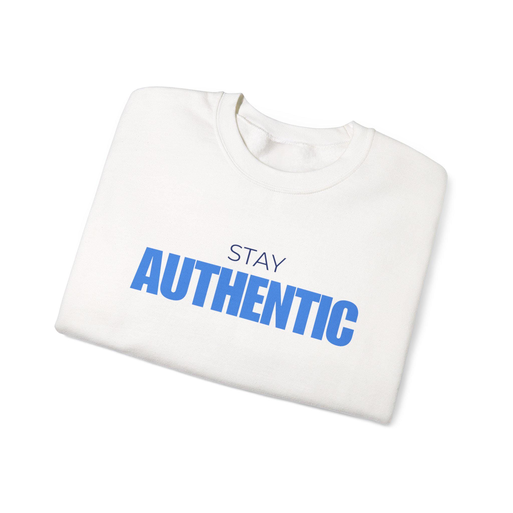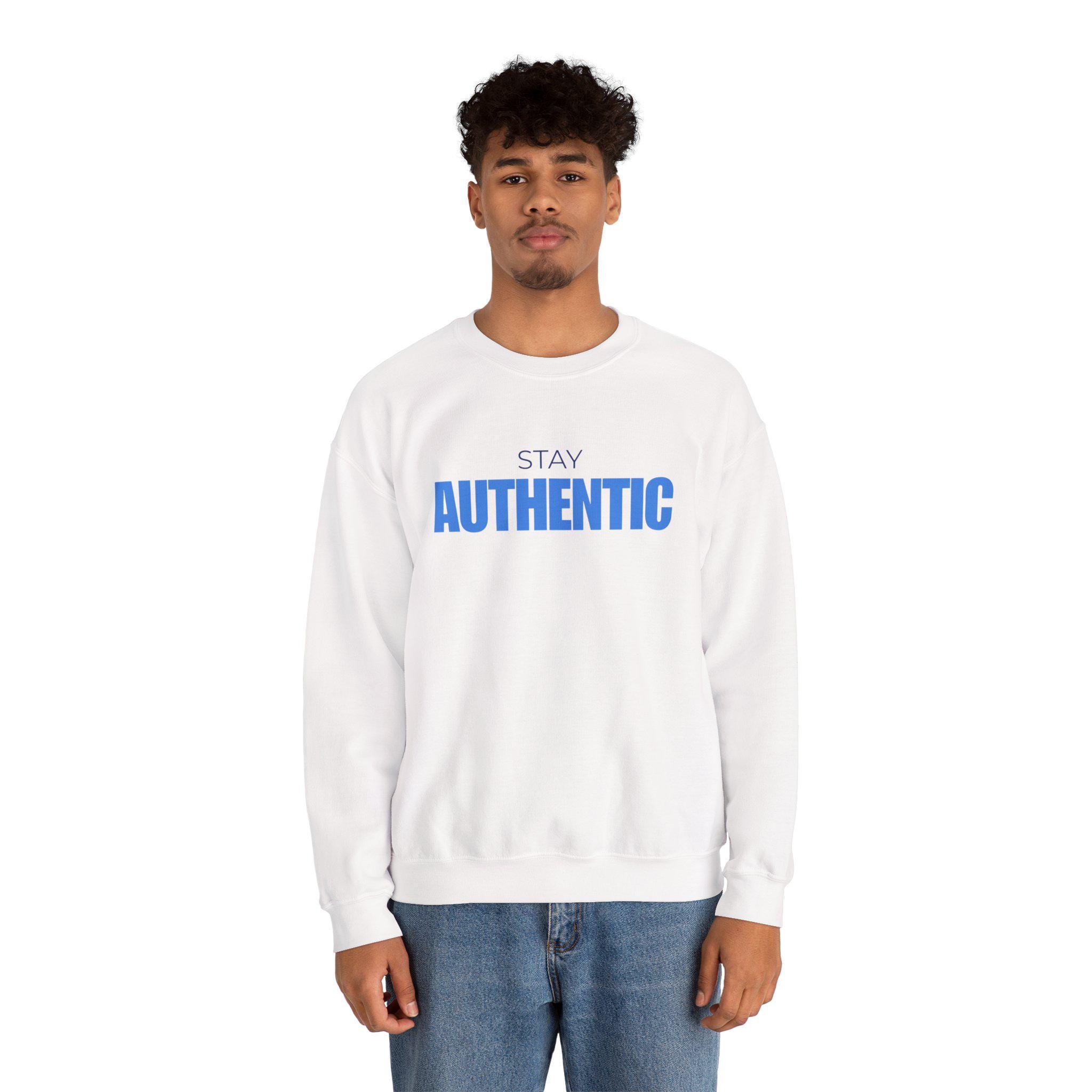 A soft, midweight crewneck sweatshirt that quietly speaks confidence. The clean white canvas and bold blue “STAY AUTHENTIC” chest print create a calm, modern look that pairs easily with denim or layered under a jacket. Lightweight enough for cool mornings and substantial enough for relaxed evenings, it settles in like a familiar companion — breathable, durable, and made to wear often. Thoughtful construction details (flat tubular knit, ribbed collar, double-needle stitching) keep the silhouette neat while reliable fabrics and OEKO‑TEX dyes mean it’s made with responsible practices in mind. Wear it when you want to keep your message simple and honest — at coffee runs, low-key meetups, or quiet weekend wanderings.