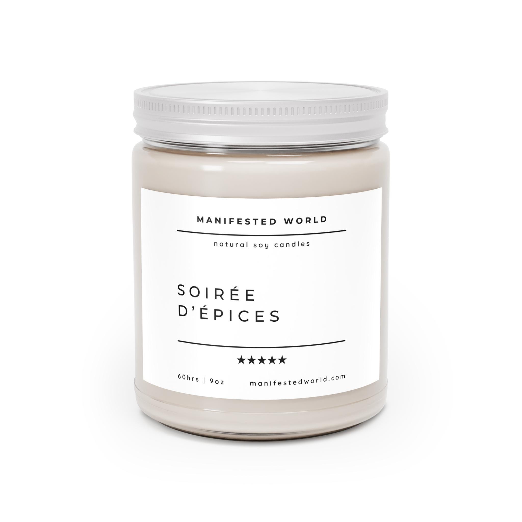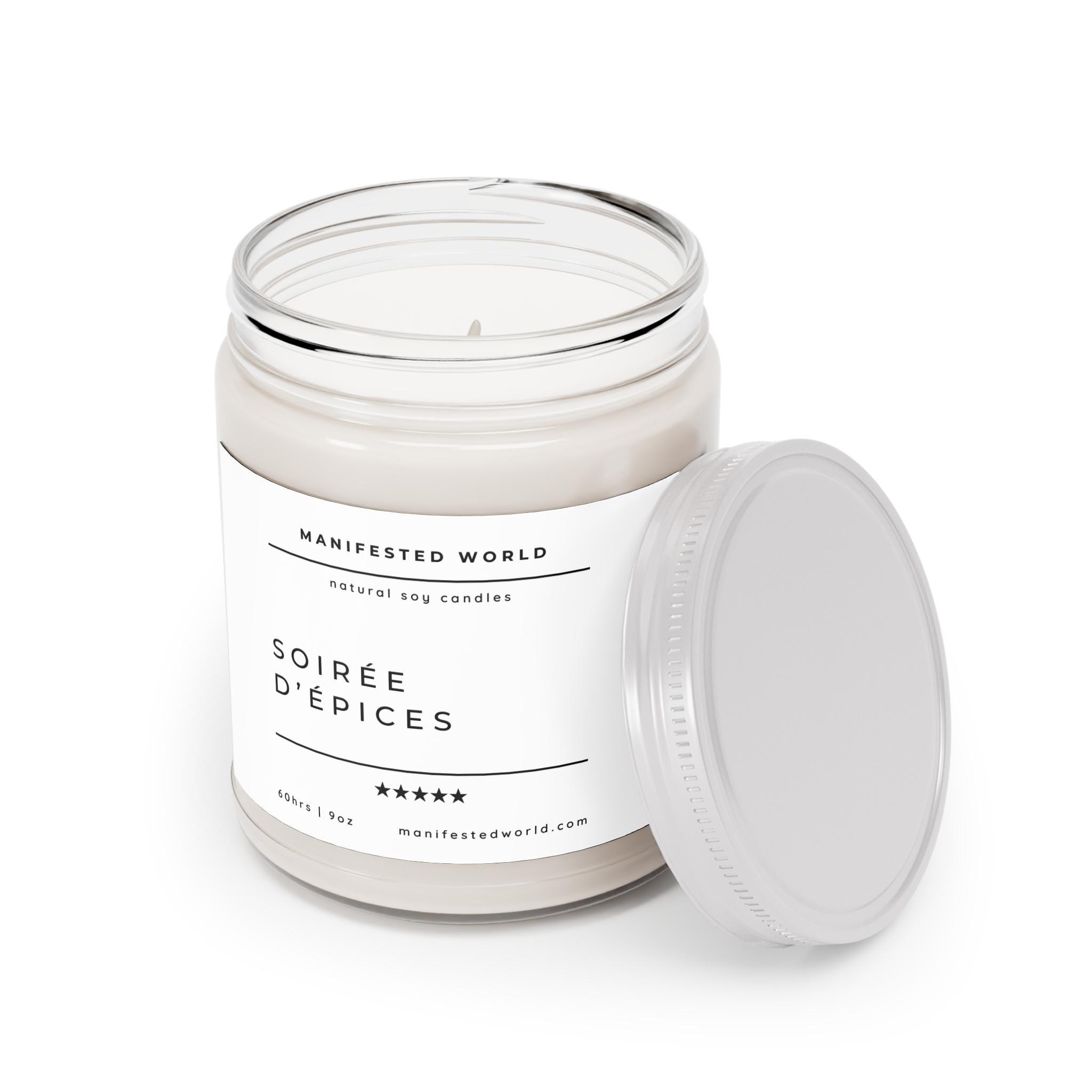 Soirée d’Épices is a hand-poured soy candle that brings a gently spiced evening into your home. Brown sugar and cinnamon stick lead the scent, lifted by a bright touch of lemon and softened with vanilla extract and praline notes. Light it at dusk and feel the room settle: warm amber light, the cozy hum of conversation, and the familiar, homey aroma of baking spices drifting through the air. It suits slow dinners, bookish nights, and small fall gatherings—those moments when you want the place to feel lived-in and tender. The clear glass jar and white lid slide into rustic and modern spaces alike, and once the wax is gone the vessel cleans up beautifully for decor or storage.