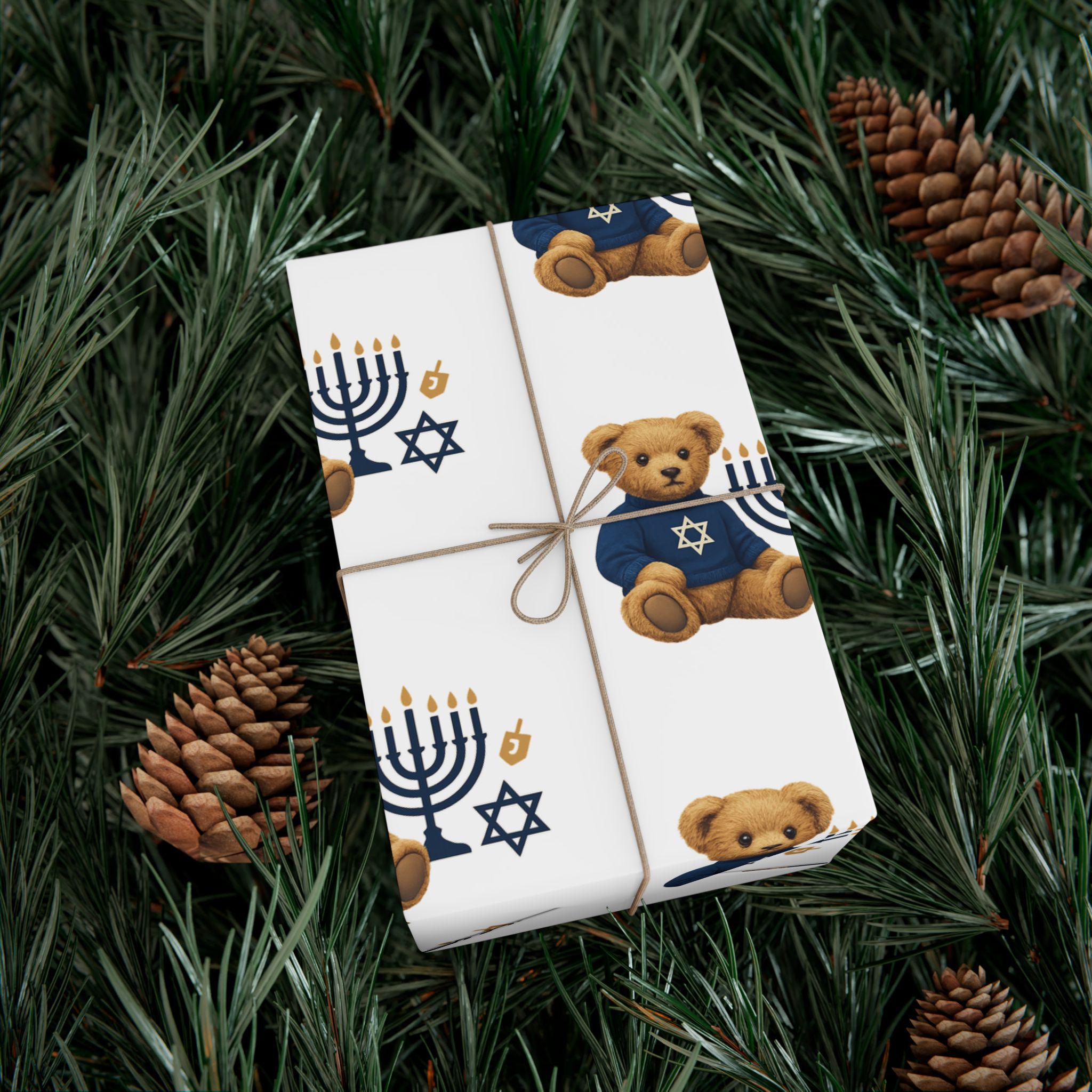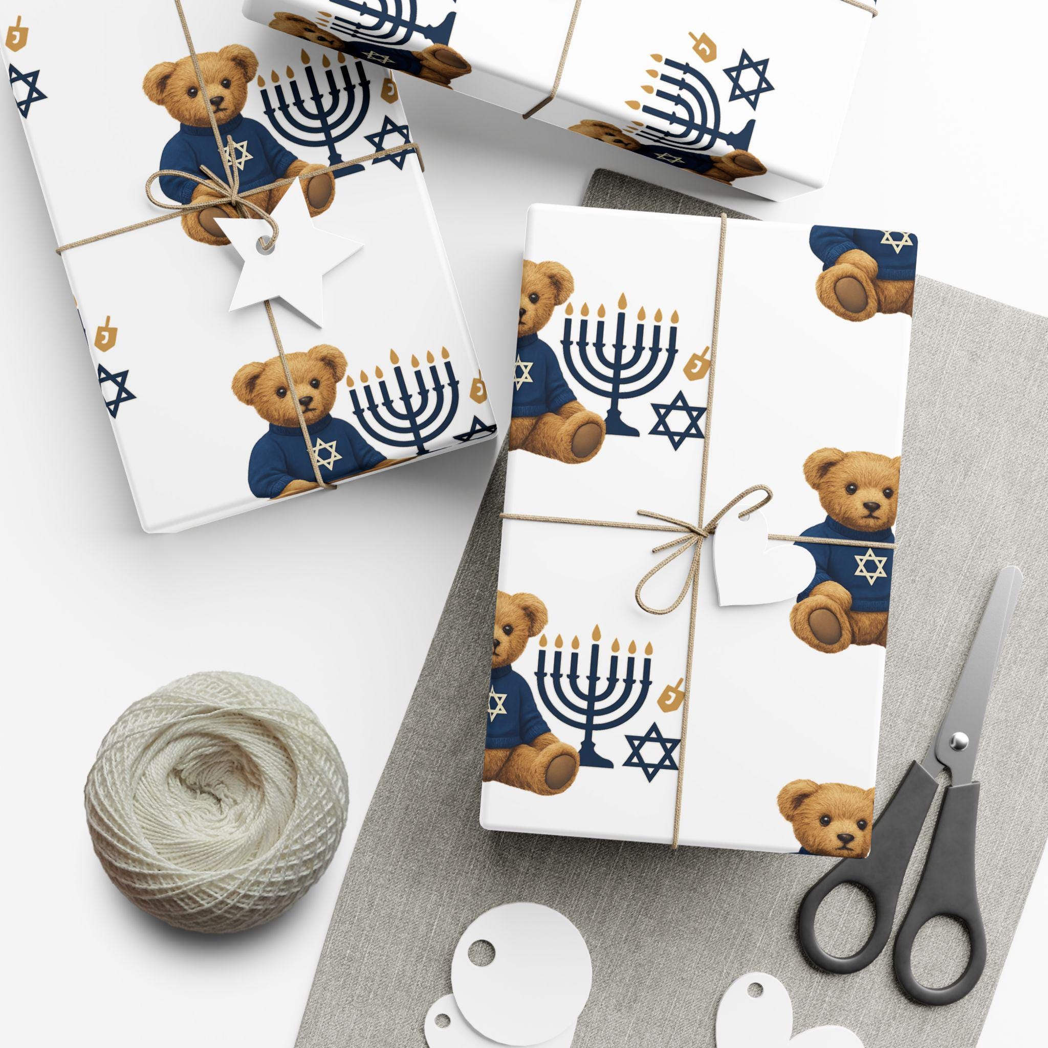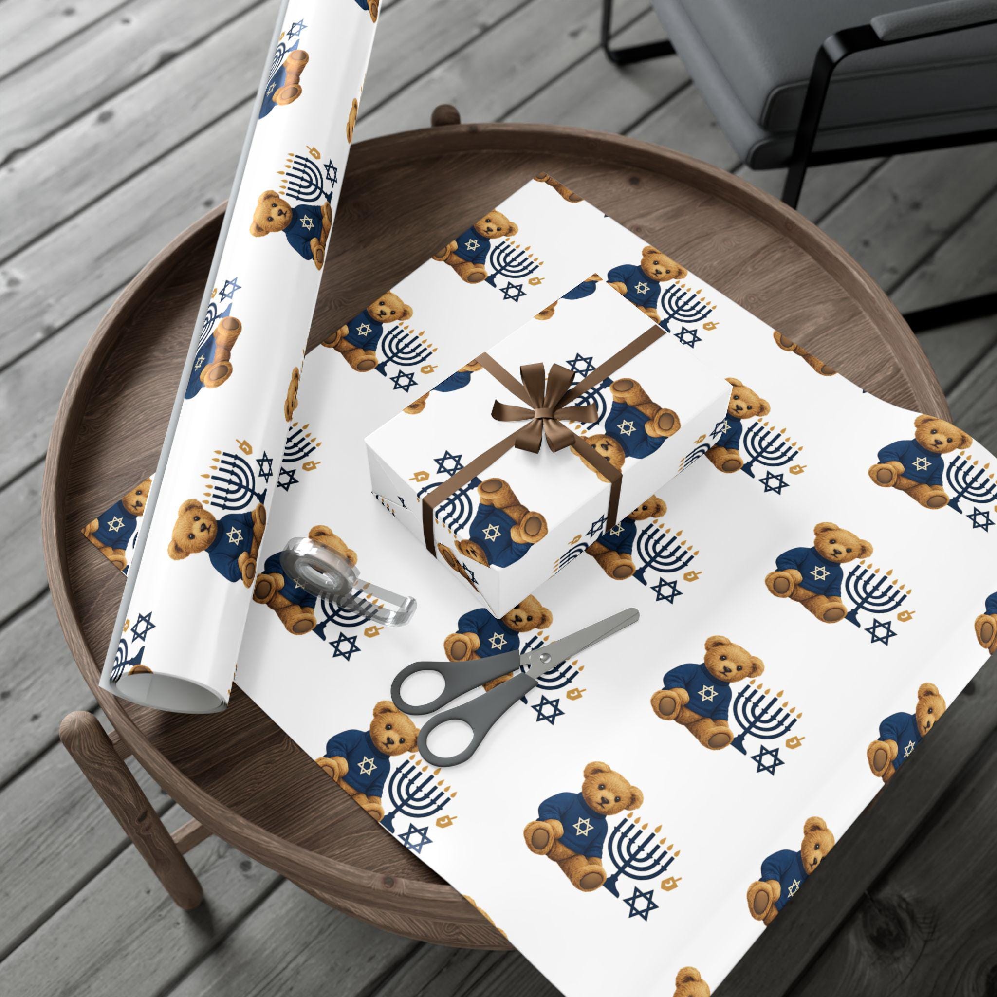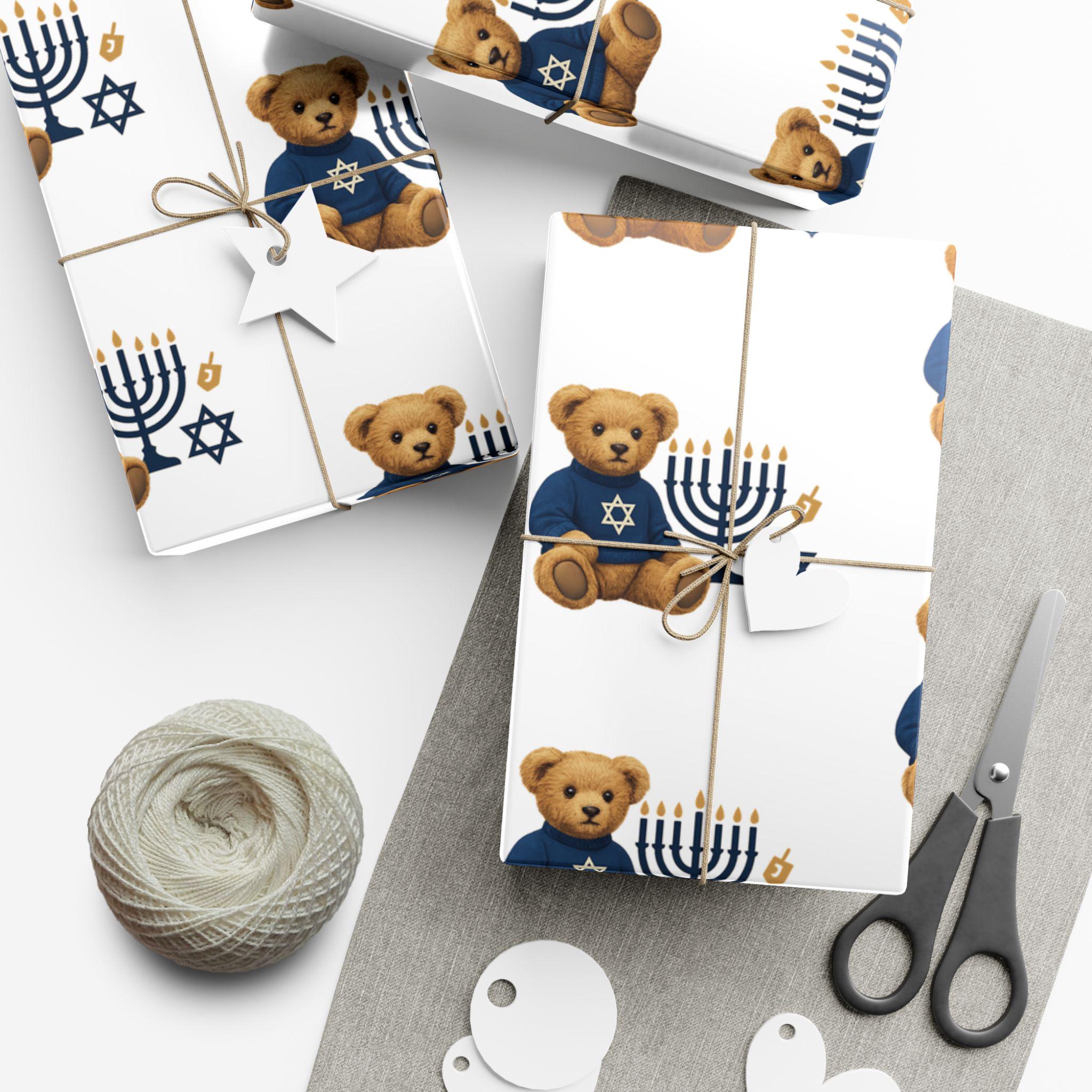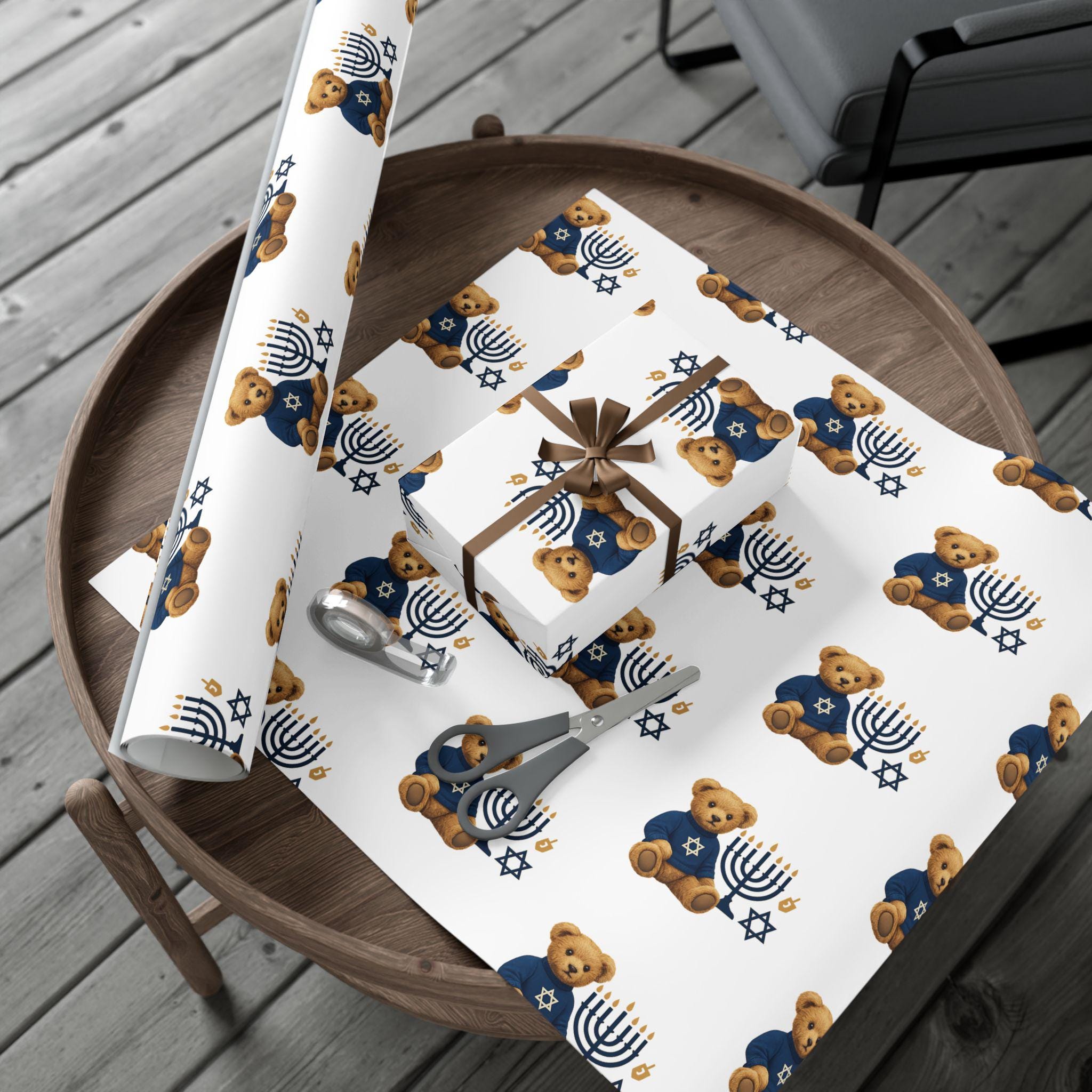 Soft, joyful gift wrap printed with a repeating teddy bear holding a menorah and Star of David. The white background keeps the design clean and bright while the navy and gold accents feel warm and celebratory. Each sheet folds crisply without cracking and resists light scuffs and spills, so packages stay neat through wrapping and unwrapping. Use these sheets when you want a playful, heartfelt presentation for Hanukkah gatherings — the pattern reads as both nostalgic and modern, pairing easily with natural twine, kraft tags, or metallic ribbons.