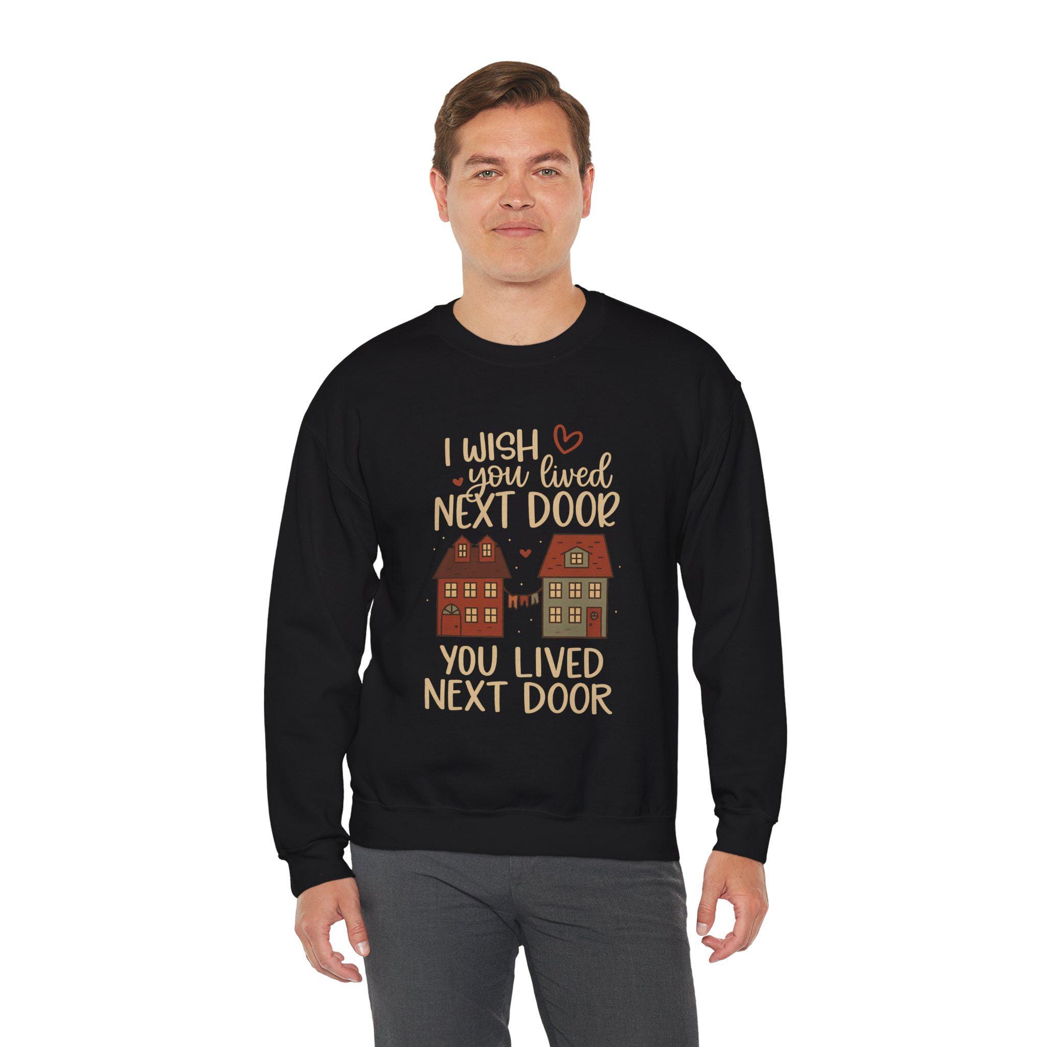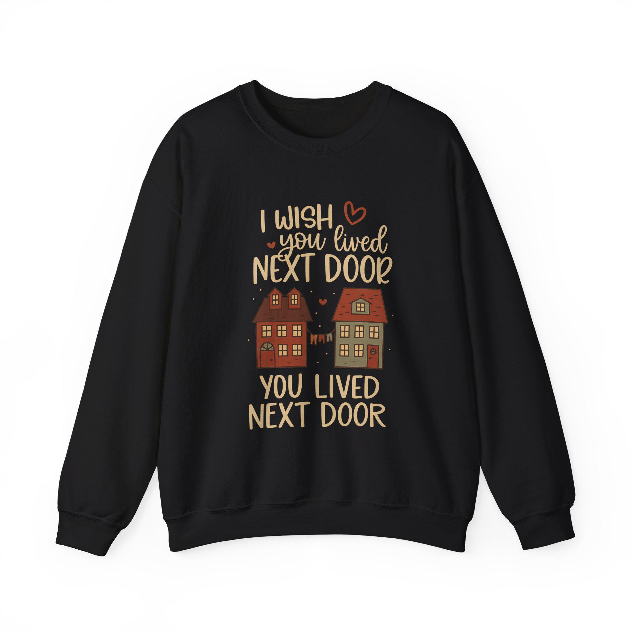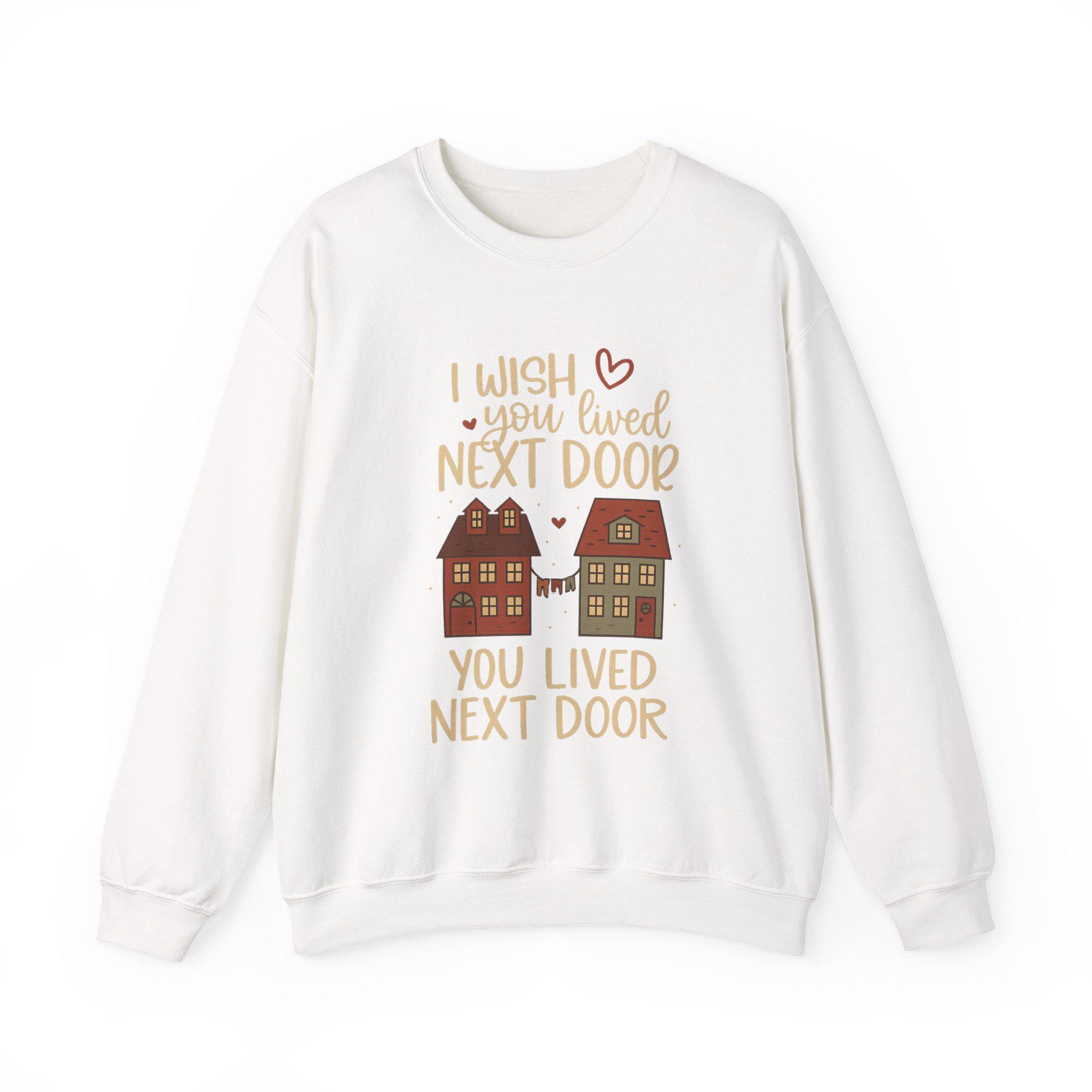 A cozy, embroidered crewneck that reads “I Wish You Lived Next Door,” with two little houses tied together by a thread of love. It feels like a soft, late‑afternoon porch conversation—warm, familiar, and quietly hopeful. The medium‑heavy cotton‑poly blend holds its shape and the embroidered design adds texture and personality that ages well. Wear it for neighborhood walks, low‑key coffee dates, or evenings on the stoop when you want something that says home without saying a word. The classic crew neckline and durable double‑needle stitching mean this sweatshirt becomes part of the regular rotation—reliable, comfortable, and quietly sentimental.