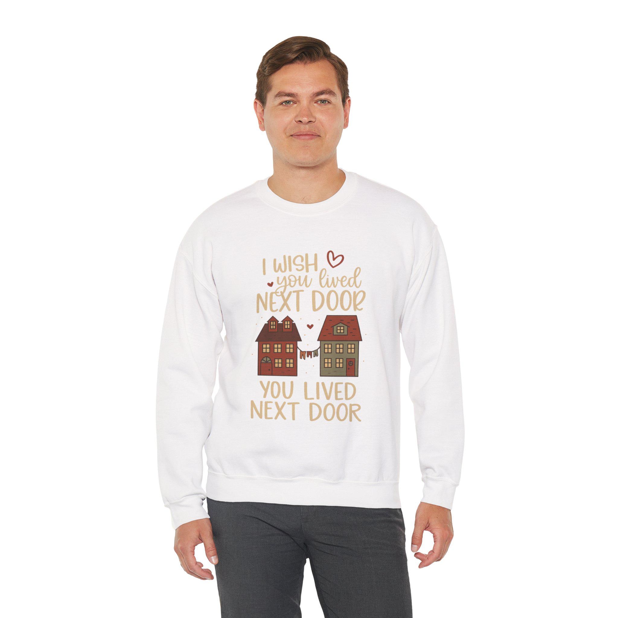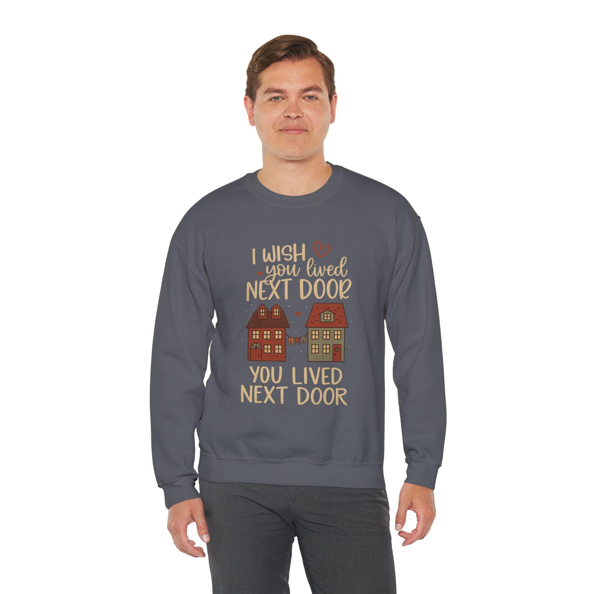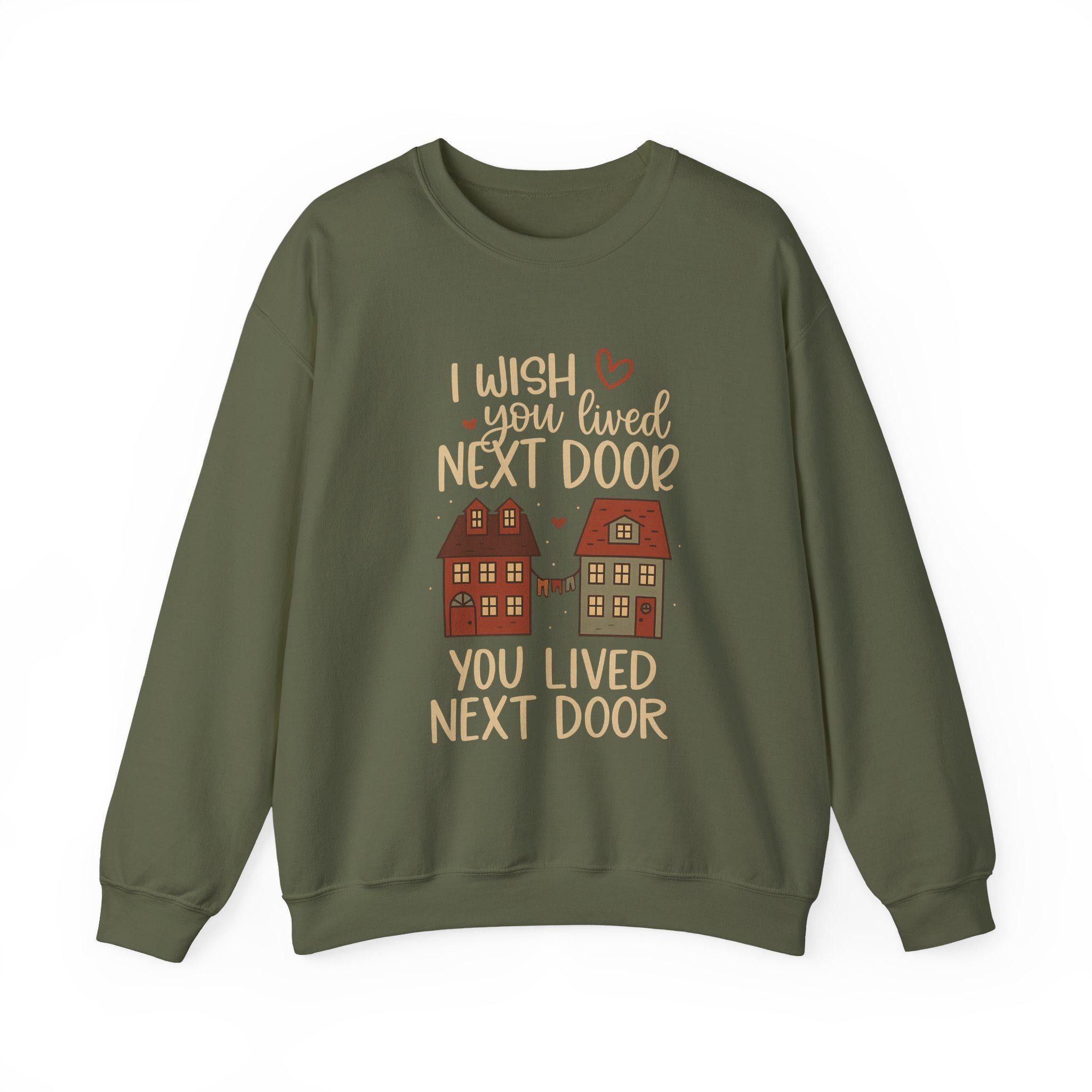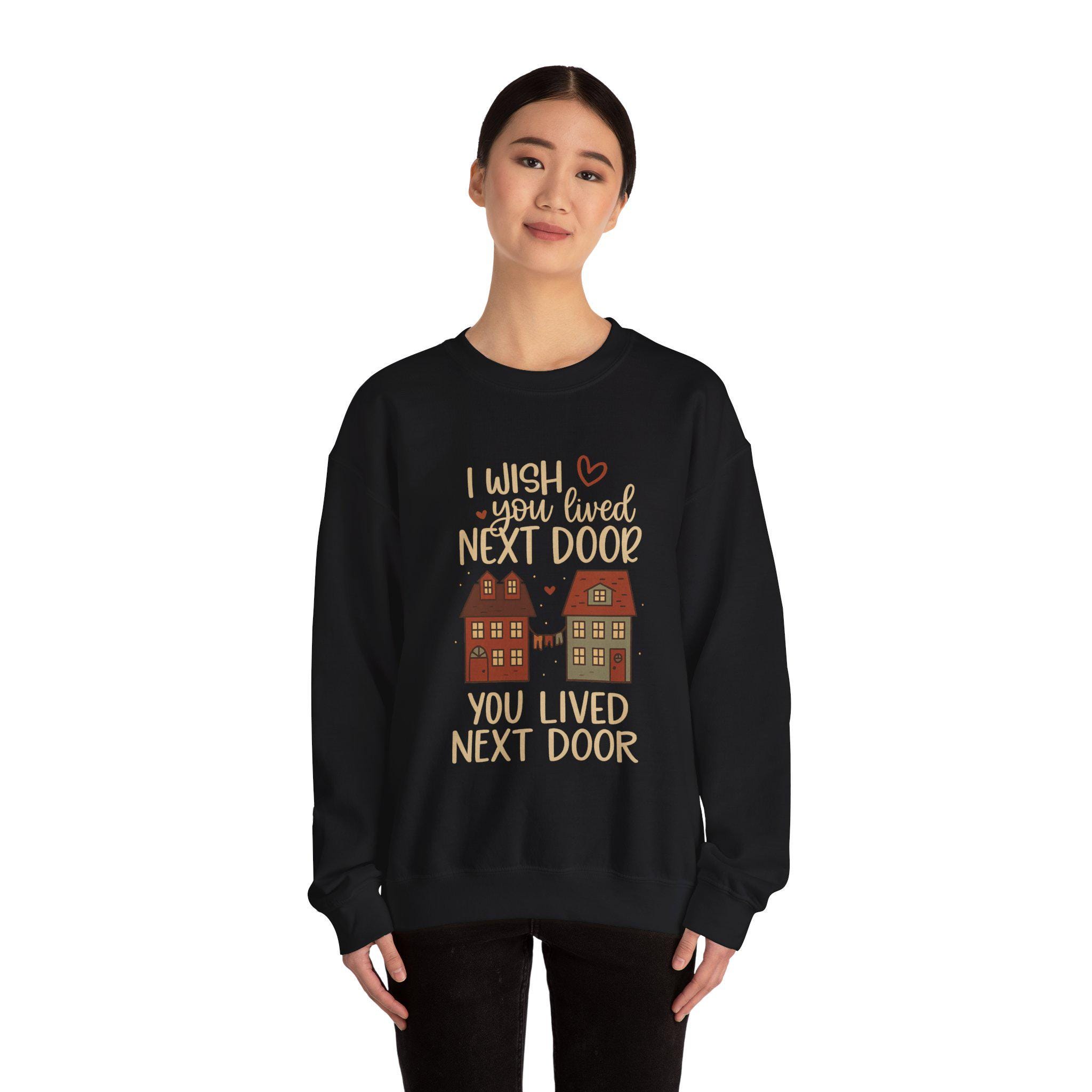A cozy, embroidered crewneck that reads “I Wish You Lived Next Door,” with two little houses tied together by a thread of love. It feels like a soft, late‑afternoon porch conversation—warm, familiar, and quietly hopeful. The medium‑heavy cotton‑poly blend holds its shape and the embroidered design adds texture and personality that ages well. Wear it for neighborhood walks, low‑key coffee dates, or evenings on the stoop when you want something that says home without saying a word. The classic crew neckline and durable double‑needle stitching mean this sweatshirt becomes part of the regular rotation—reliable, comfortable, and quietly sentimental.