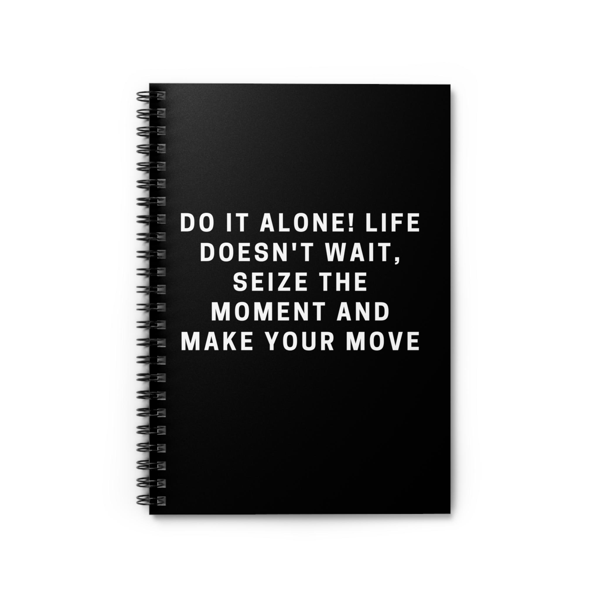 A compact spiral notebook built for people who move fast and think faster. The matte black cover carries a bold, white, motivational message that reads like a private nudge to act now. Inside, smooth 90gsm ruled pages take ink without bleeding, while a metal spiral lets the notebook lay flat or fold back when you need one-handed writing. A hidden document pocket in the back holds receipts, ticket stubs, or loose ideas until you can file them away. Slim, sturdy, and ready for daily use — this notebook slips into a bag or sits on a desk as a quiet challenge to keep going.