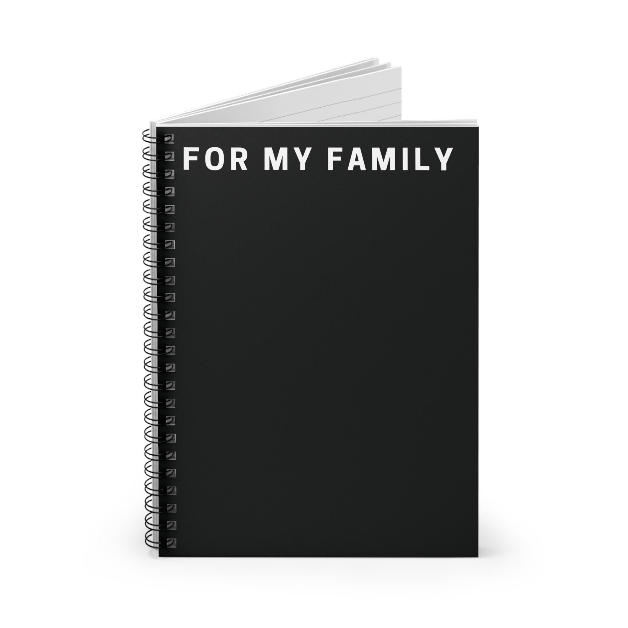 A compact, ruled spiral notebook designed to keep personal thoughts, plans, and memories organized for the people who matter most. The matte black front cover features a clean, bold heading that reads “FOR MY FAMILY,” making the notebook feel intentional and heartfelt. Inside, 118 lined pages (90 gsm) offer a smooth writing surface for journaling, lists, or letters. A sturdy metal spiral lets pages lie flat or be removed cleanly, while a dark grey back cover and an interior document pocket keep loose notes and keepsakes secure. Sized at 6 x 8 inches, it slips into bags and cubbies easily — a simple, elegant place to collect family recipes, important dates, or quiet reflections.