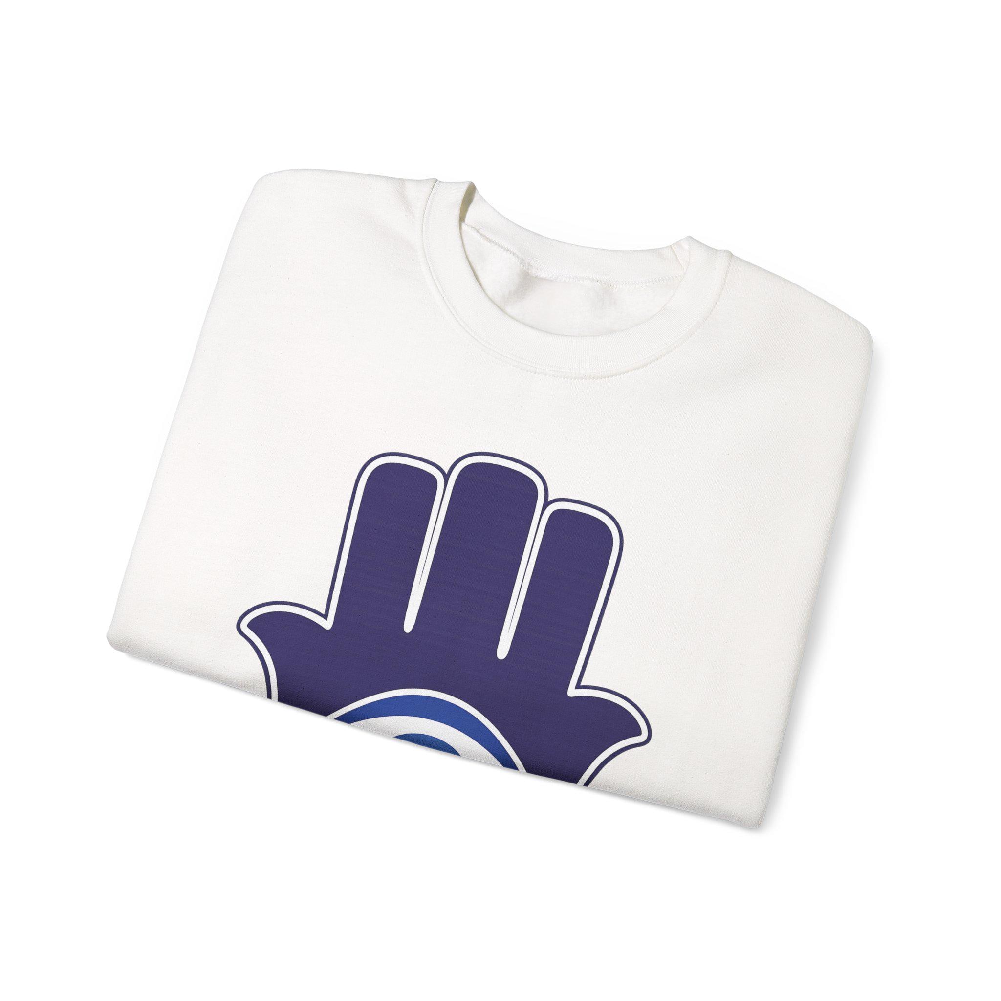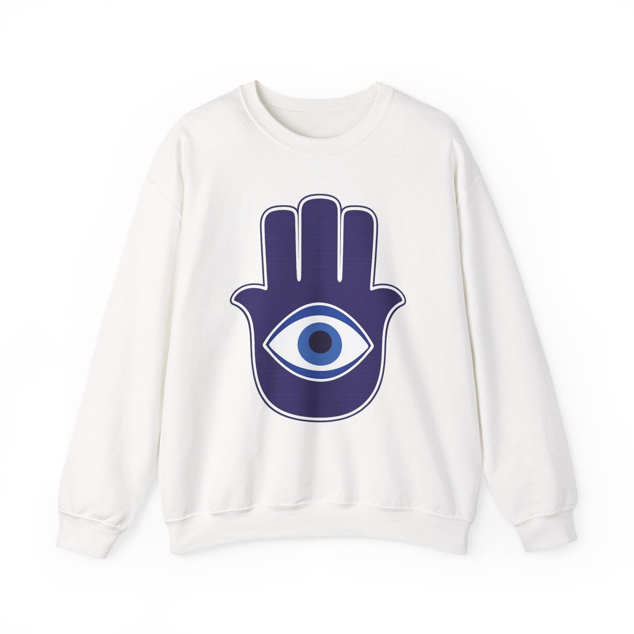 Soft, simple, and a touch mysterious — this crewneck lives somewhere between cozy basics and symbolic style. The medium-weight cotton-poly blend feels substantial without being heavy, and the classic crew cut sits cleanly at the collar for easy layering. A bold Hamsa-like hand with a striking blue eye centers the chest, giving the sweatshirt quiet charm and a slightly spiritual, protective energy. Wear it on chilly mornings, on slow weekends, or layered under a jacket for evenings around the fire. It moves with you, holds its shape, and ages with character — a sweatshirt that quietly signals taste and calm confidence.