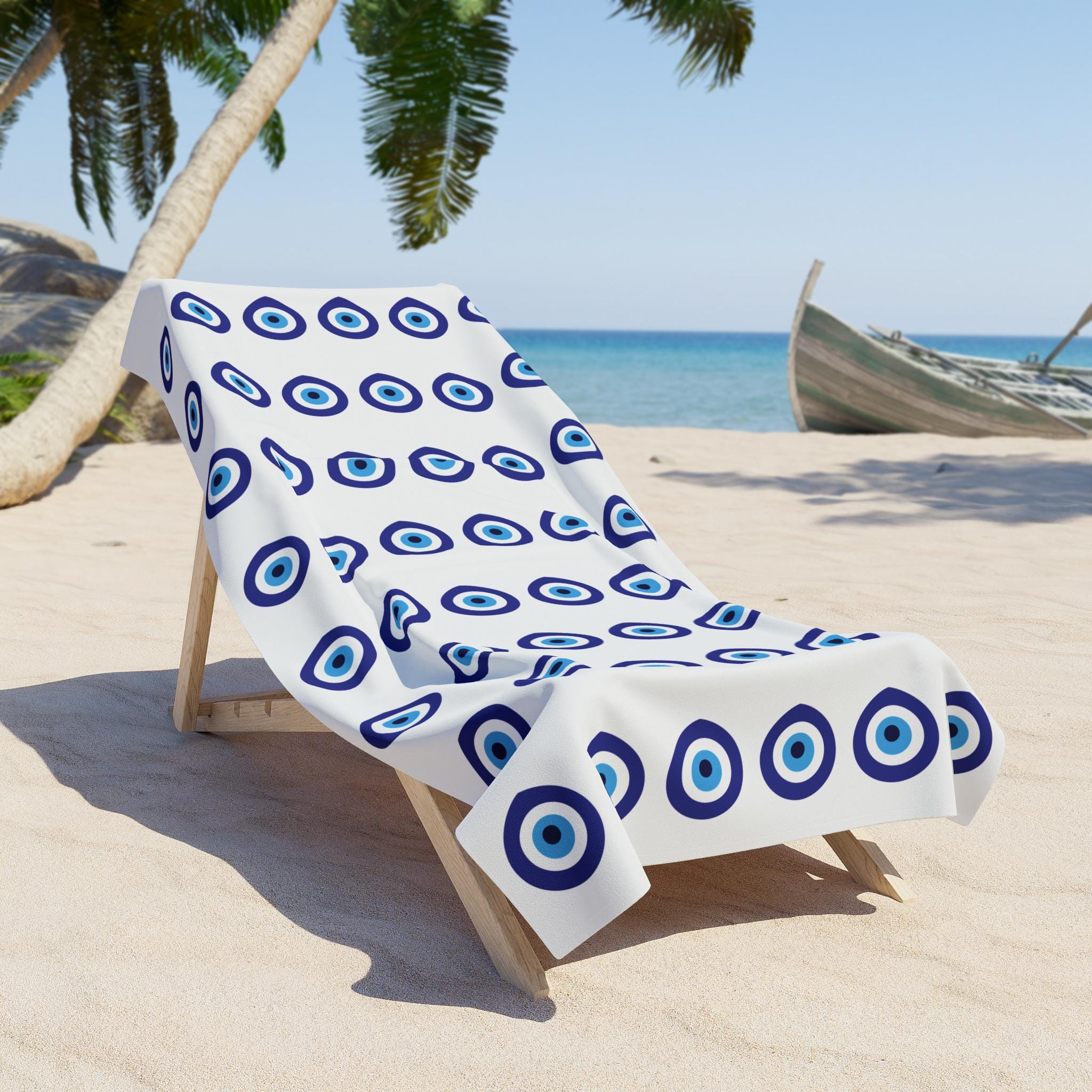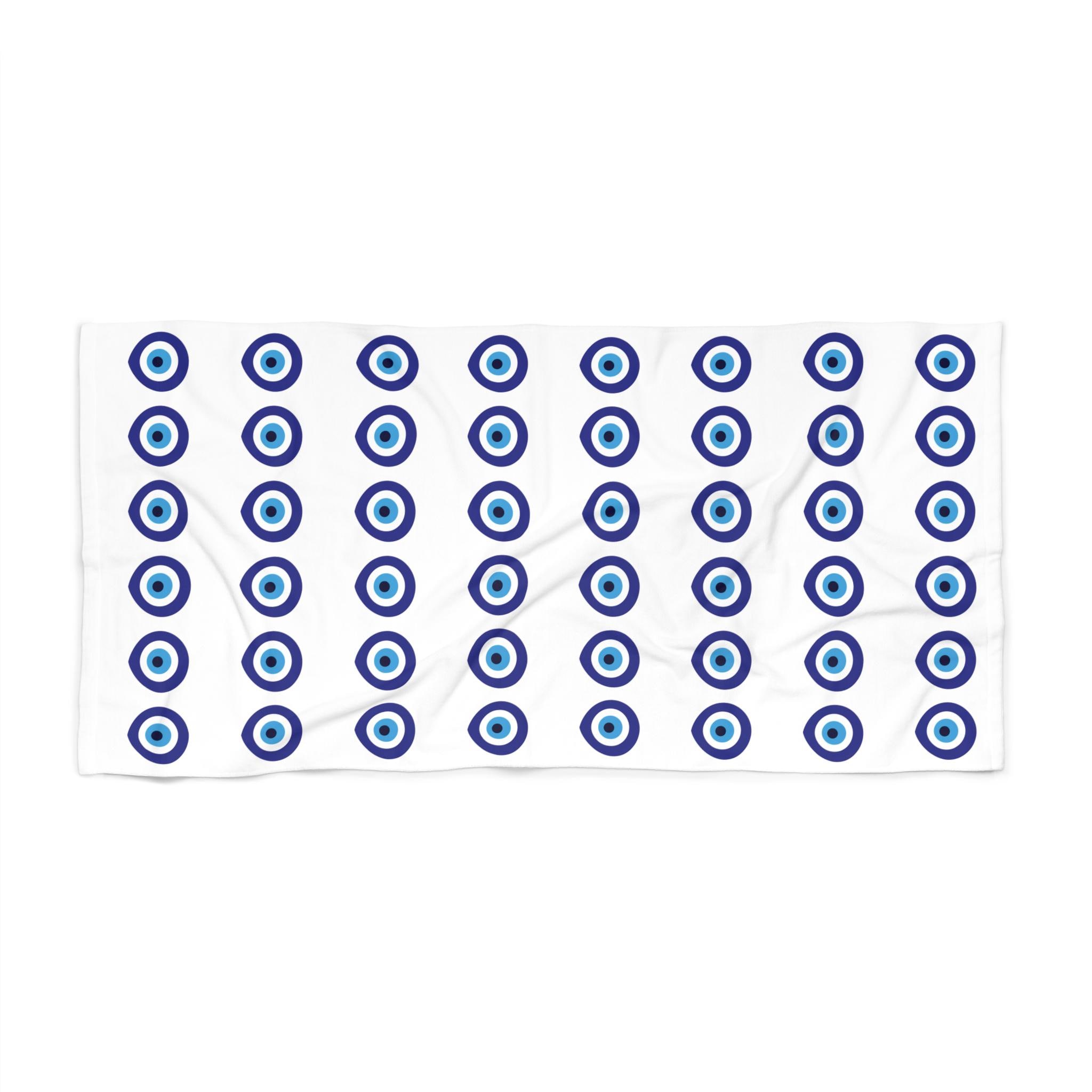 A lightweight, quick-dry beach towel patterned with a repeat of deep-blue concentric 'evil eye' medallions on a crisp white field. The print side is durable polyester that holds vibrant blues and resists fading, while a soft cotton loop backing gives gentle absorbency and a plush hand against skin. Available in two lengths, it slips easily into a tote, spreads smoothly across a lounge chair, and doubles as a picnic throw or post-swim wrap. The graphic repeat reads both modern and slightly Mediterranean — it brings a calm, protective energy to shoreline afternoons, boat days, and seaside escapes.