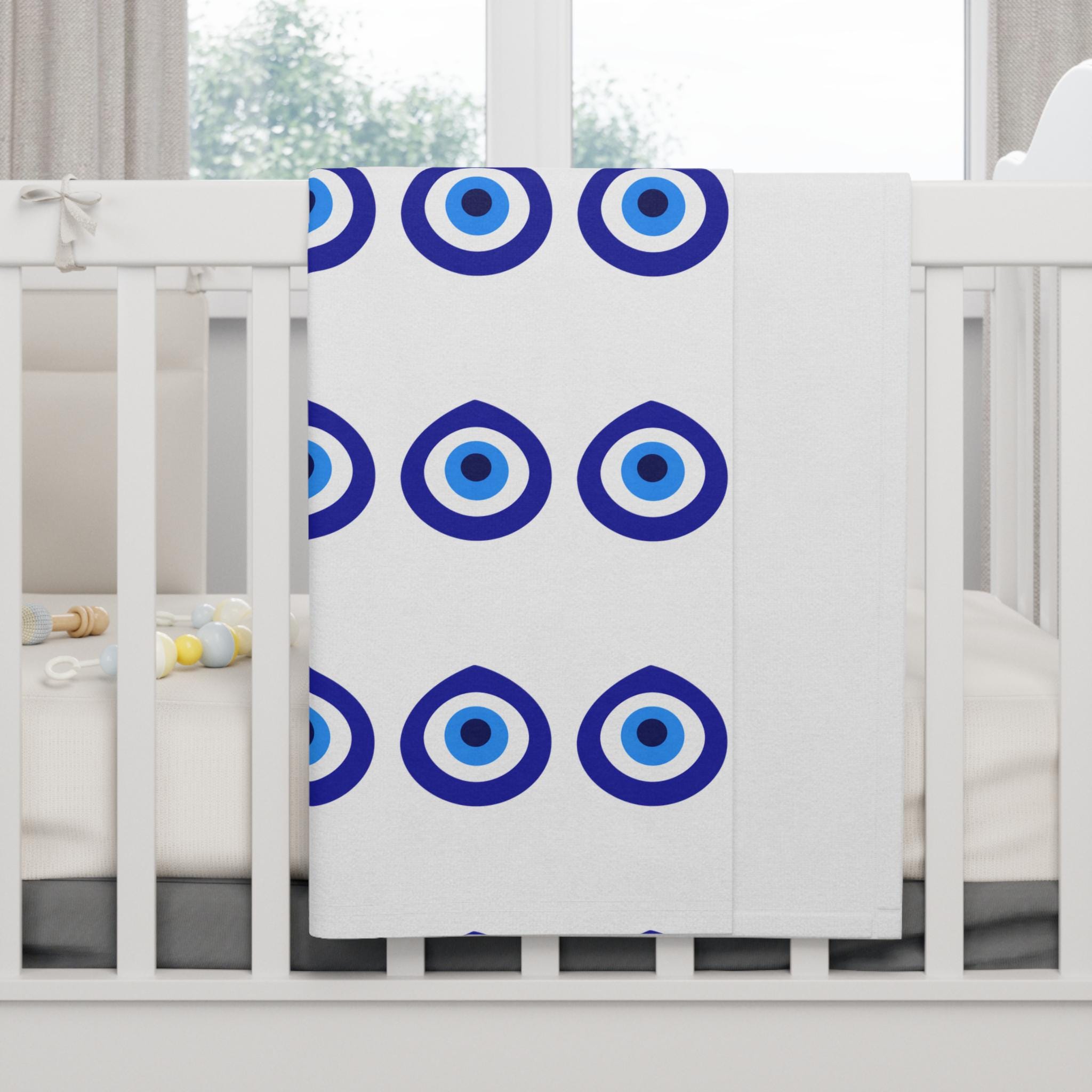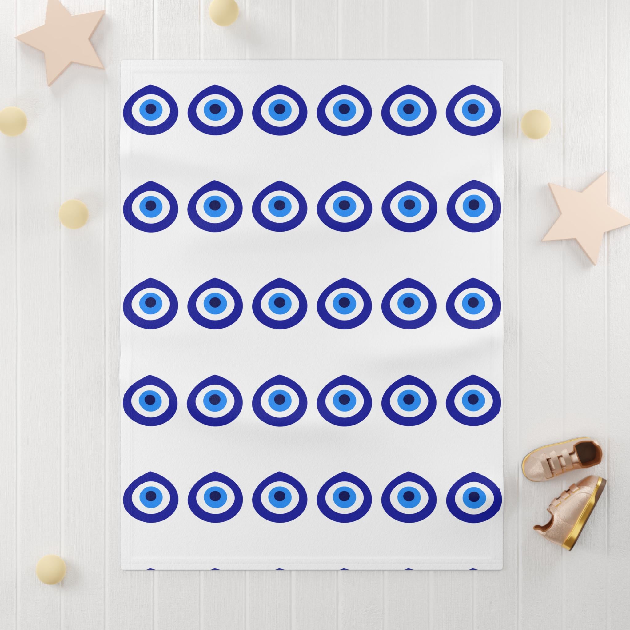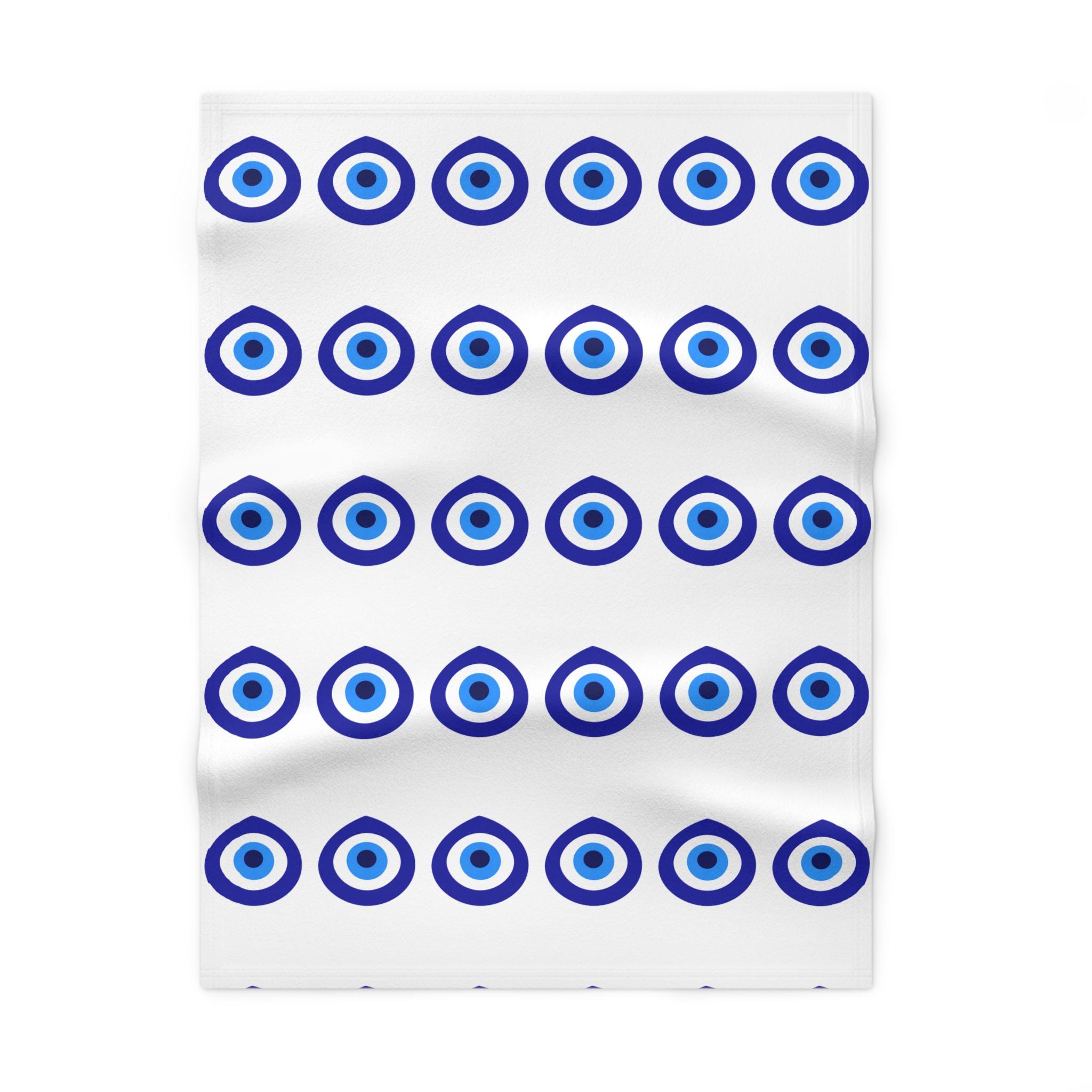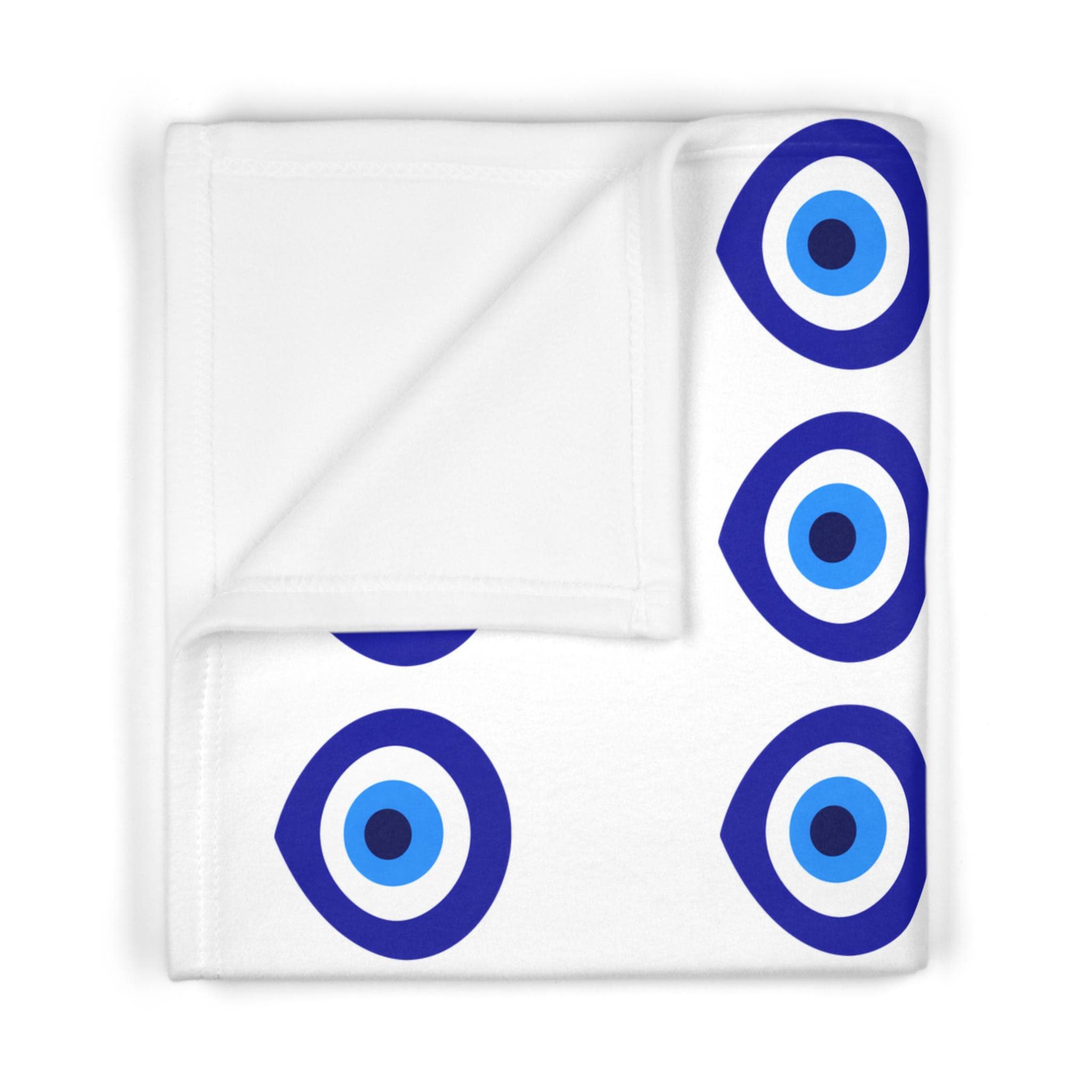 This soft fleece blanket brings a calm, protective presence to quiet moments at home. The pattern of deep-blue concentric circles—evocative of traditional “evil eye” motifs—repeats across a bright white field, creating a clean, modern look with a touch of folk charm. Lightweight yet cozy, the blanket drapes easily over a lap, folds into a stroller, or tucks into a nursery corner. It’s for people who appreciate simple, meaningful design: parents soothing a newborn, a traveler layering warmth on the go, or anyone who wants a subtle talisman-like pattern in their living space. The smooth fleece feels gentle against skin and the neat double-needle stitching keeps the edges tidy after repeated use and washes. Use it during late-night feedings, stroller walks, or for adding a crisp graphic accent to a couch or rocking chair.