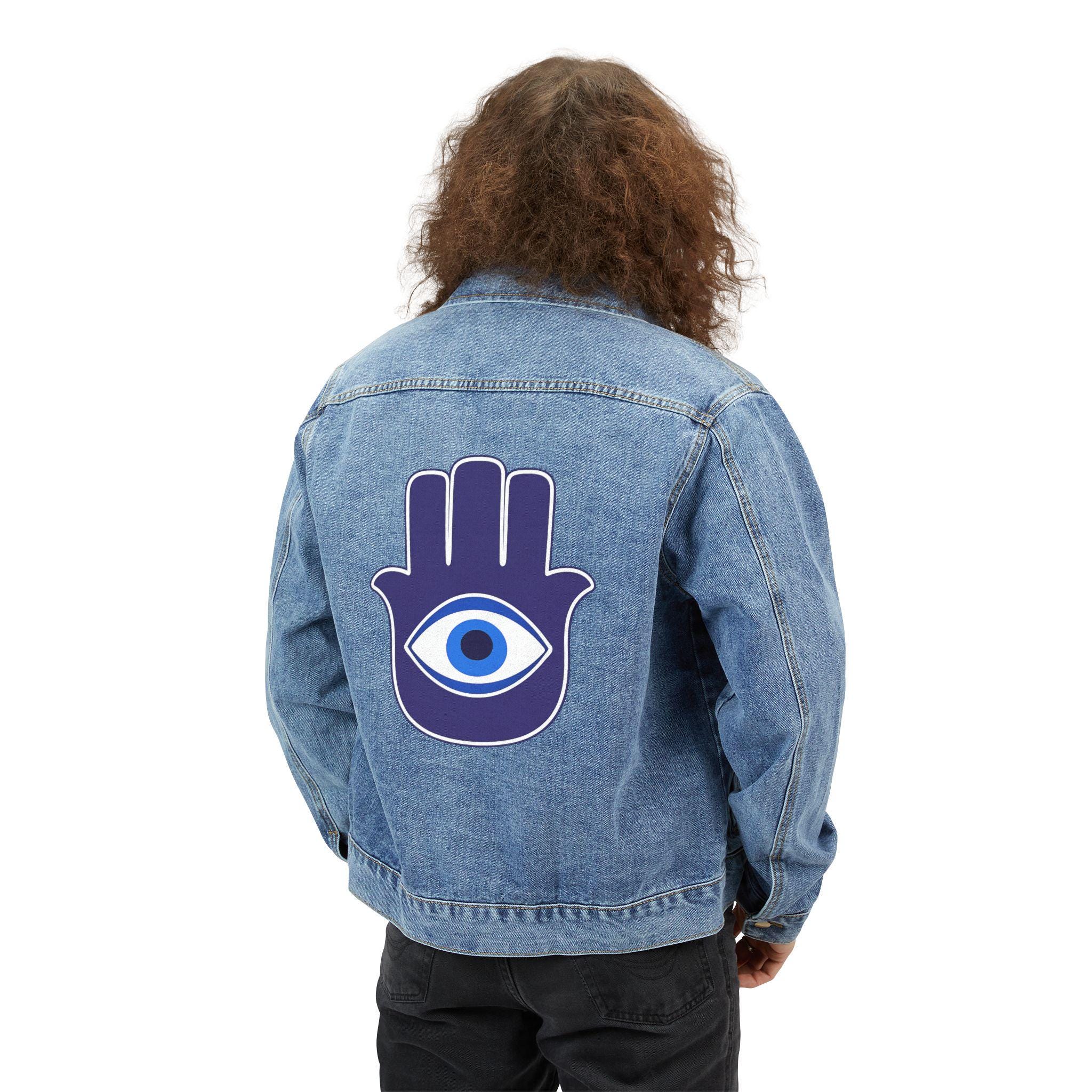 A relaxed-fit denim jacket that blends classic workwear with a bold, symbolic back graphic. The light-blue wash and structured lapel collar keep the jacket timeless, while the metal button closures and chest flap pockets add rugged utility. Soft stretch in the fabric lets you layer comfortably; roomy front slanted pockets and chest pockets hold essentials without bulk. The striking hamsa-style hand with an all-seeing eye on the back turns this into a statement piece — wearable protection and personality for everyday wear. It wears in with you, becoming more characterful with each season.